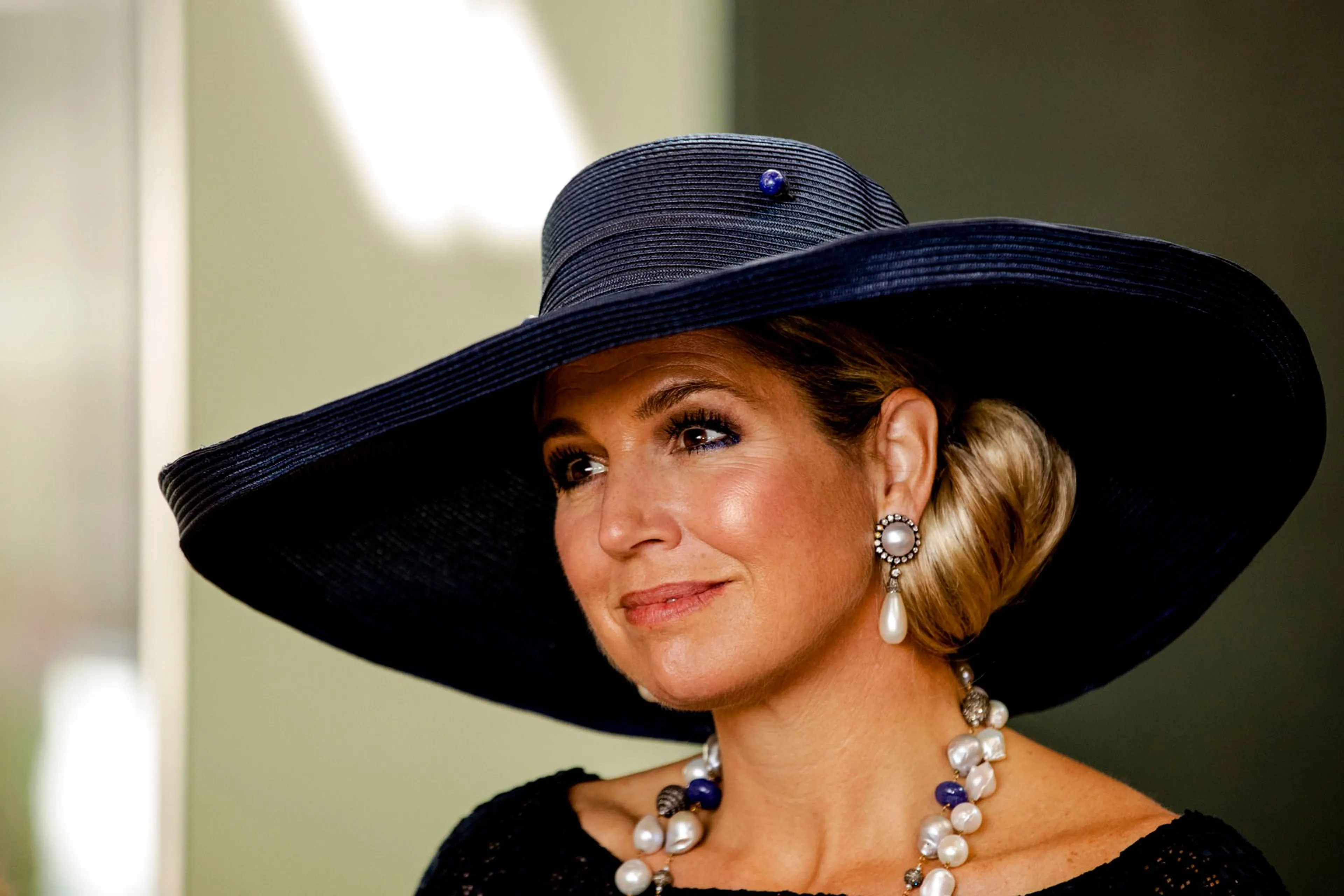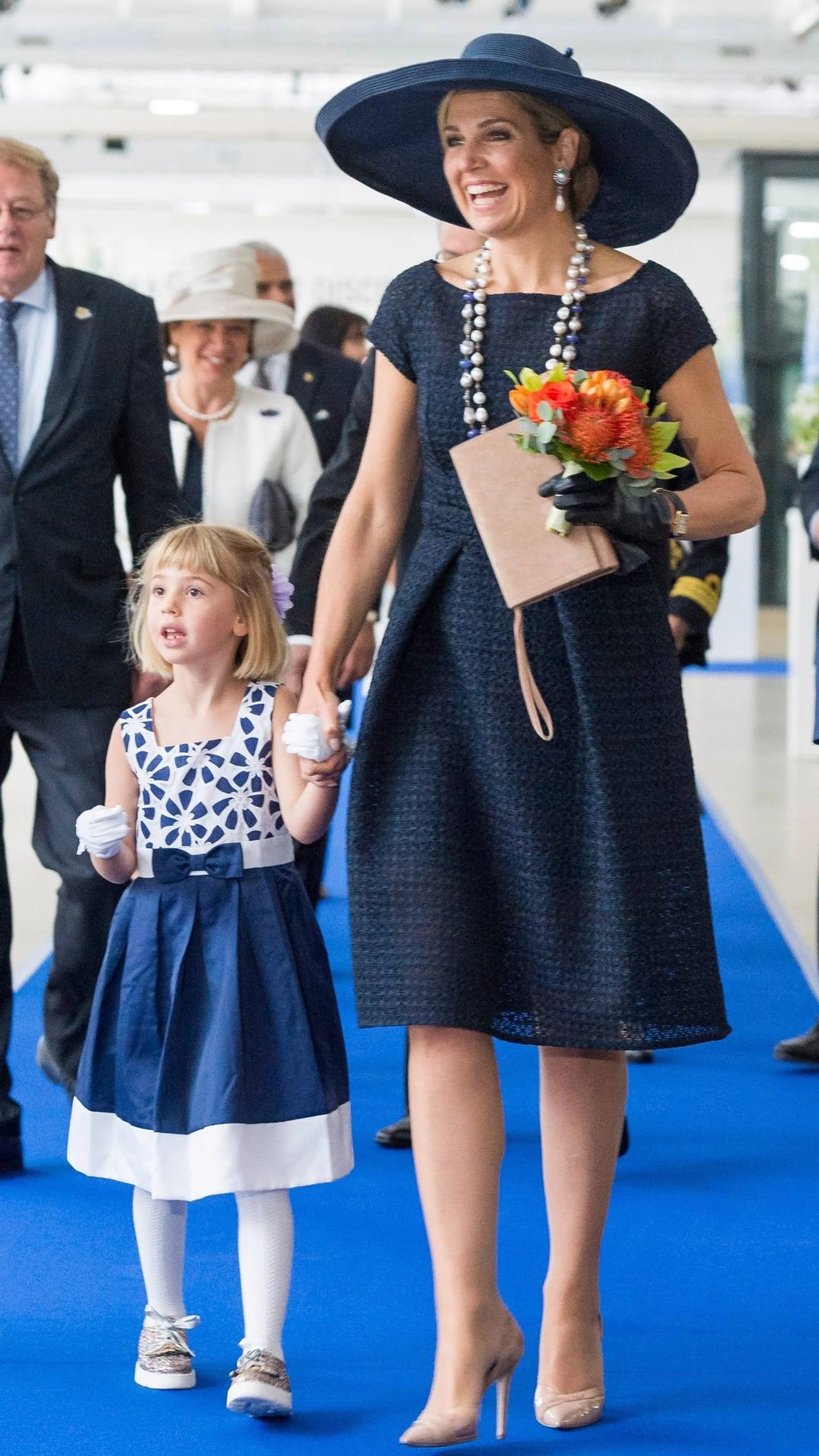 Cruiseschip KoningsdamIn mei doopt Máxima cruiseschip MS Koningsdam in een zwarte japon met boothals en een grote hoed. Tijdens het staatsbezoek aan Zeeland heeft ze deze outfit nog eens gedragen.
