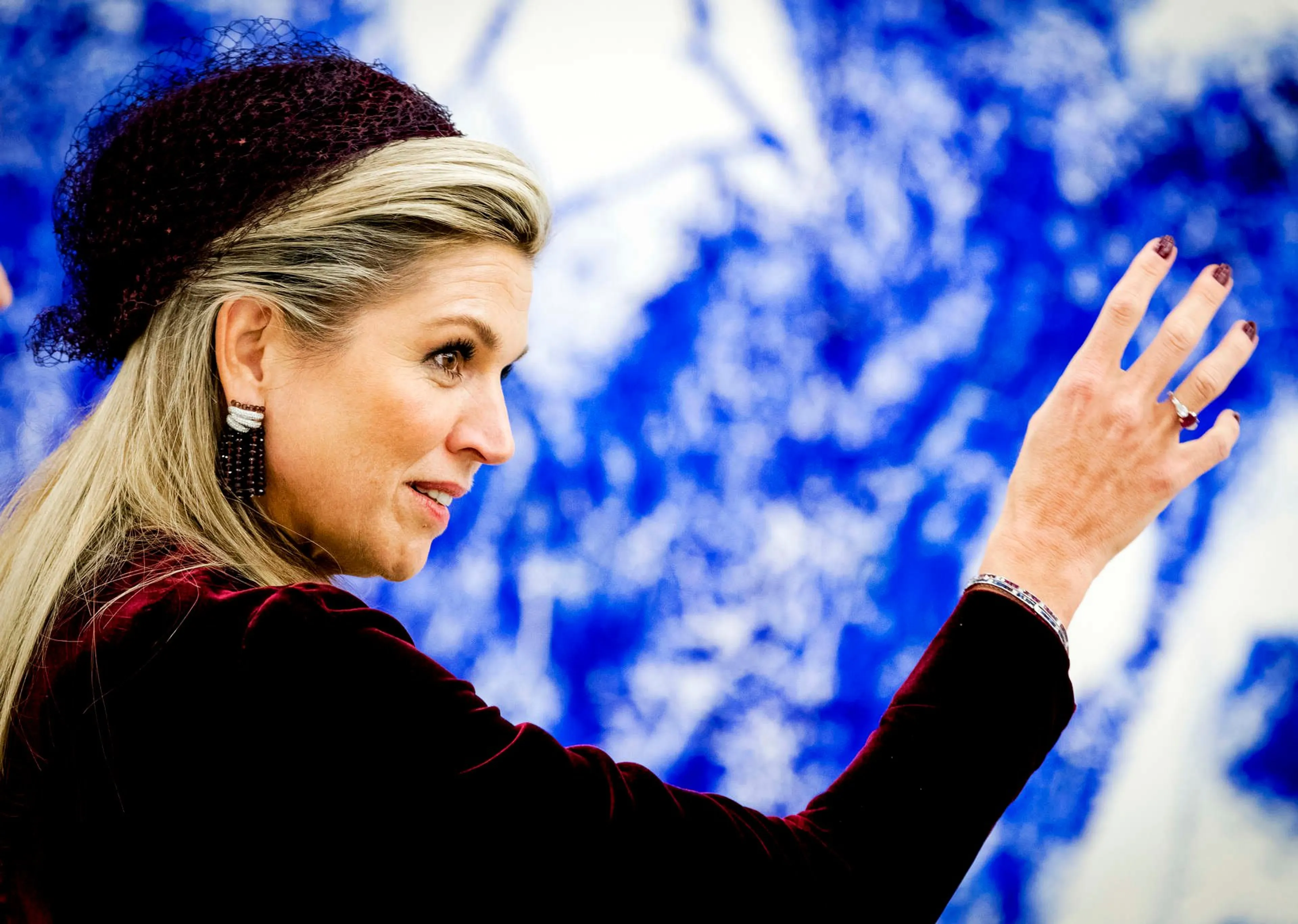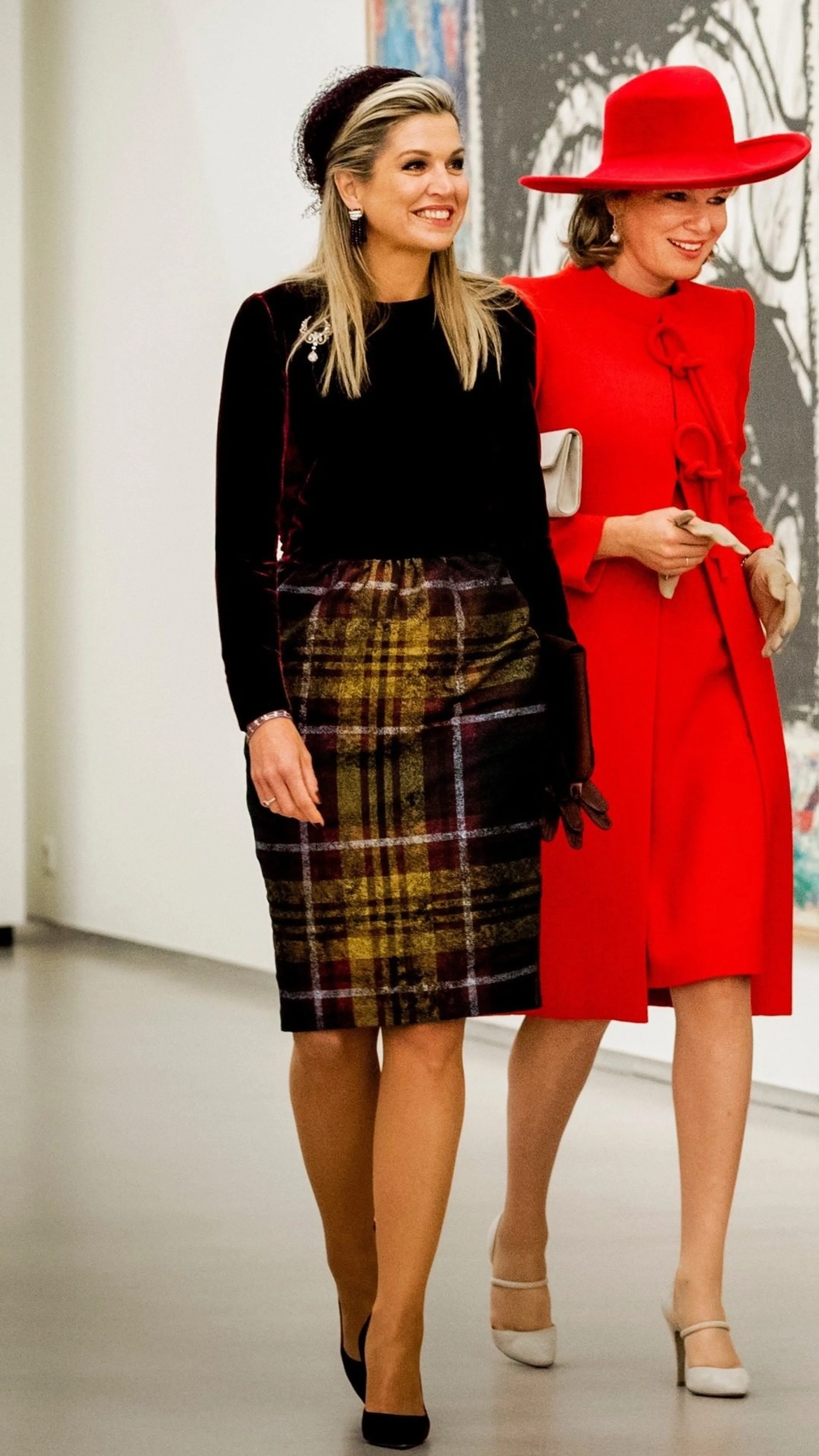 Staatsbezoek BelgiëTijdens het staatsbezoek van België aan Nederland draagt de koningin twee modetrends in één outfit: ruit en fluweel. Koningin Máxima kiest voor een geruite rok met fluwelen top van Natan in de kleur bordeaxrood.