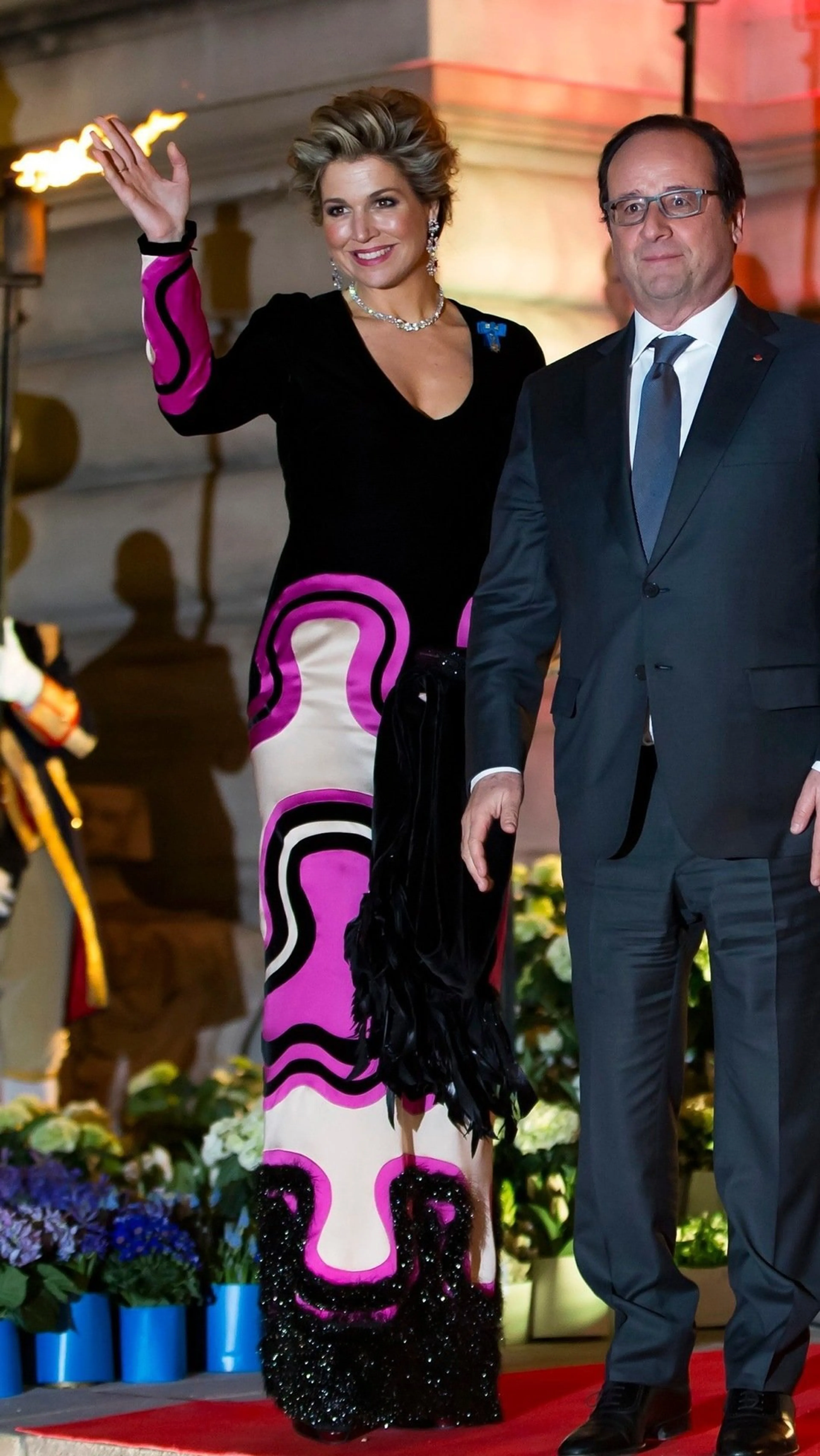 Contraprestatie ParijsOm president Hollande te bedanken voor het staatsbezoek aan Frankrijk biedt het koningspaar een contraprestatie aan. De koningin straalt is een opvallende japon van Tom Ford met met fuchsia roze en witte vormen erop.