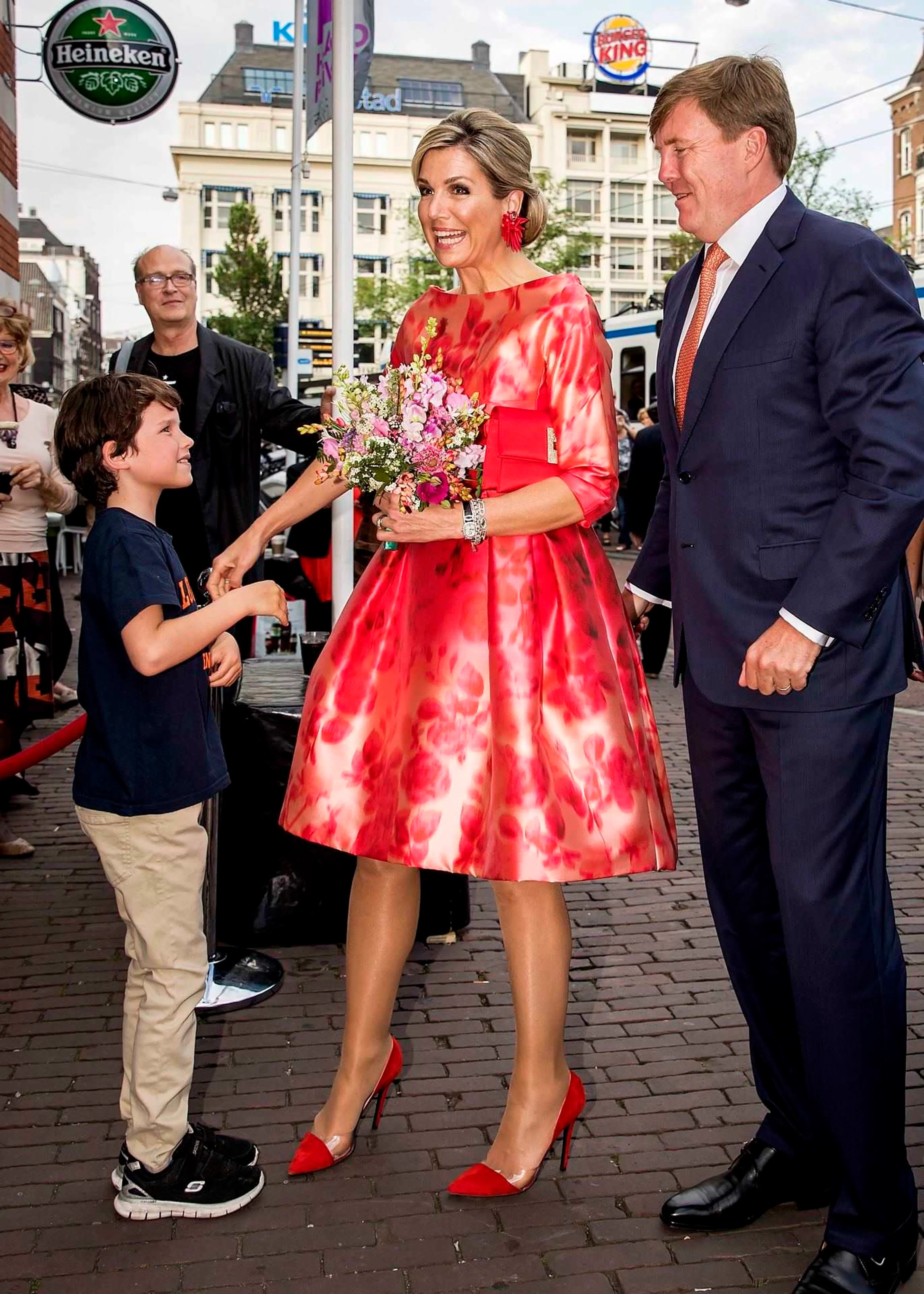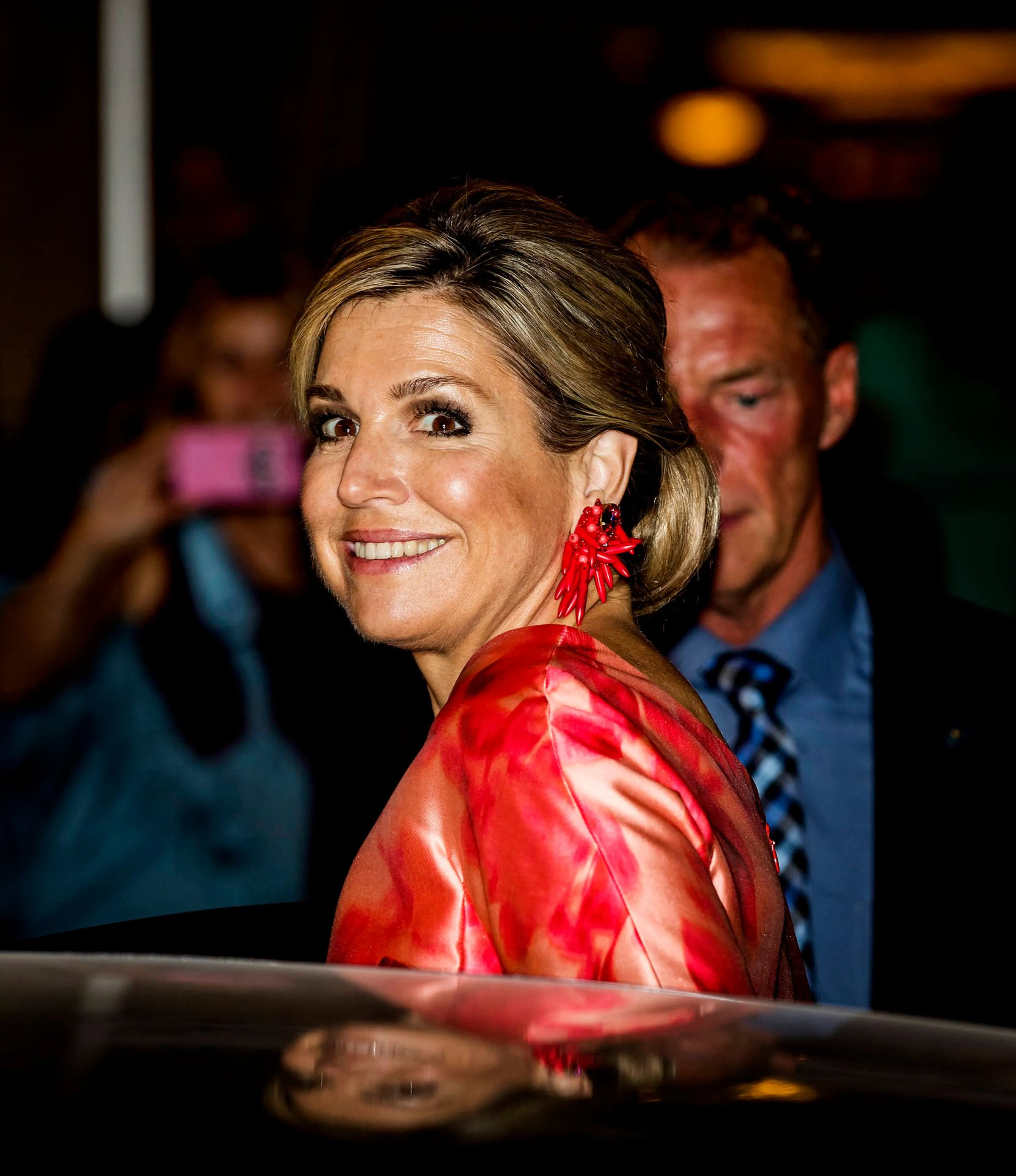 Holland FestivalBij de 69e editie van het Holland Festival in de Amsterdamse Schouwburg kiest koningin Máxima voor een japon met een a-lijn van modehuis Natan. De jurk heeft oranje en rode tinten en een bloemendessin.