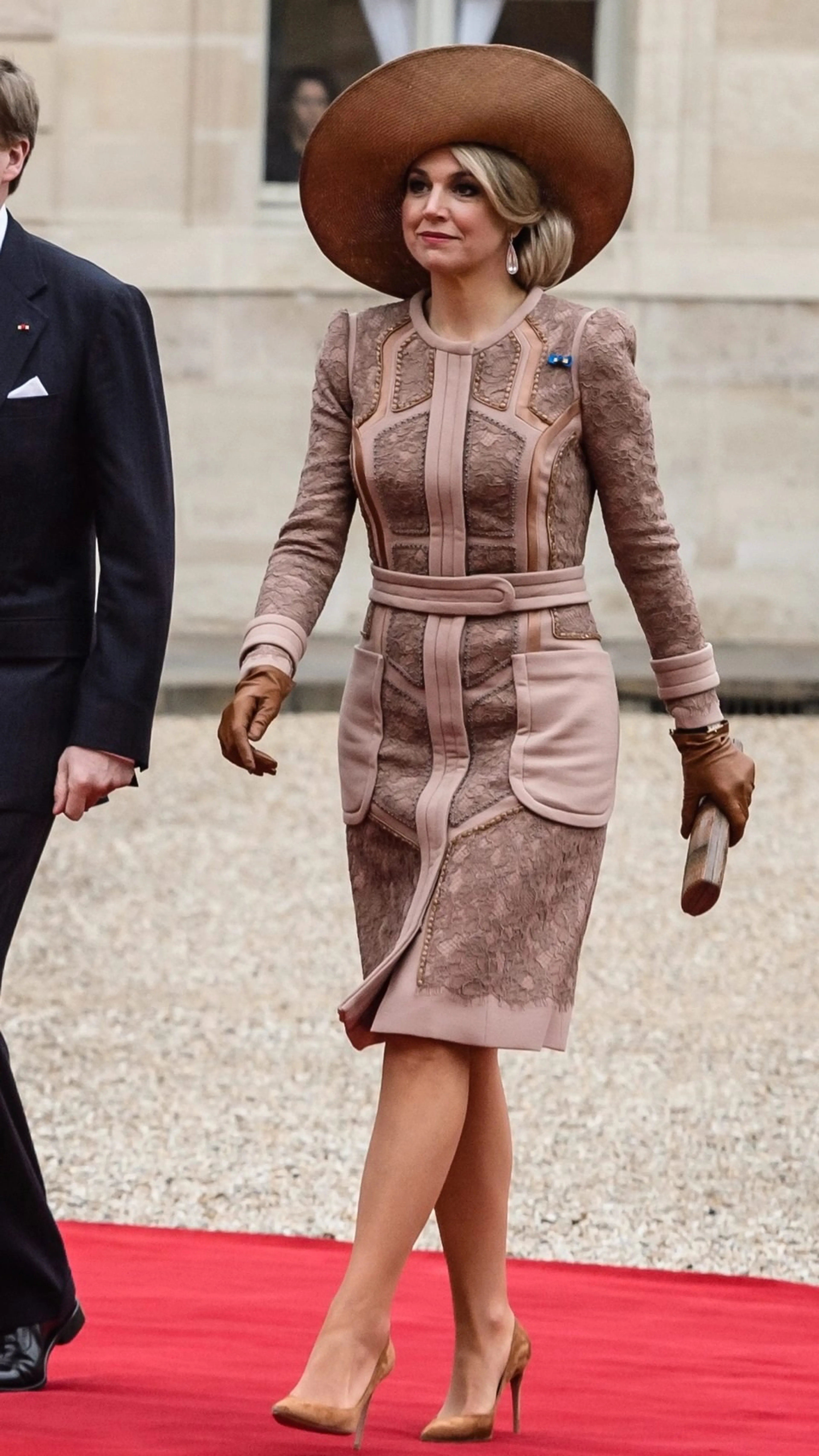 Staatsbezoek FrankrijkAls je mode-stad Parijs bezoekt, dan pak je uit. Koningin Máxima kiest bij de aankomst voor een nude-kleurige outfit van de Deens-Nederlandse ontwerper Claes Iversen, gecombineerd met een grote hoed.