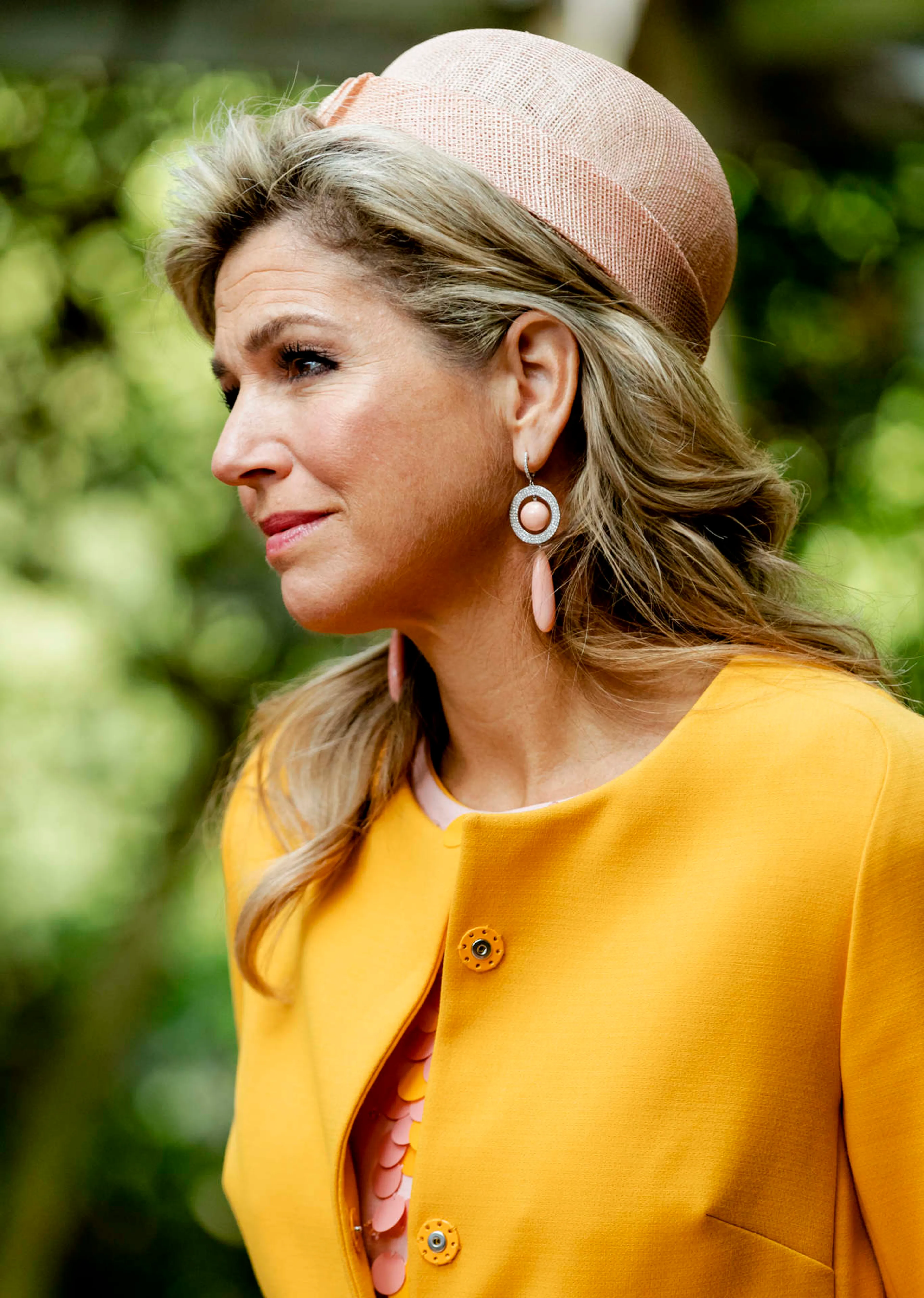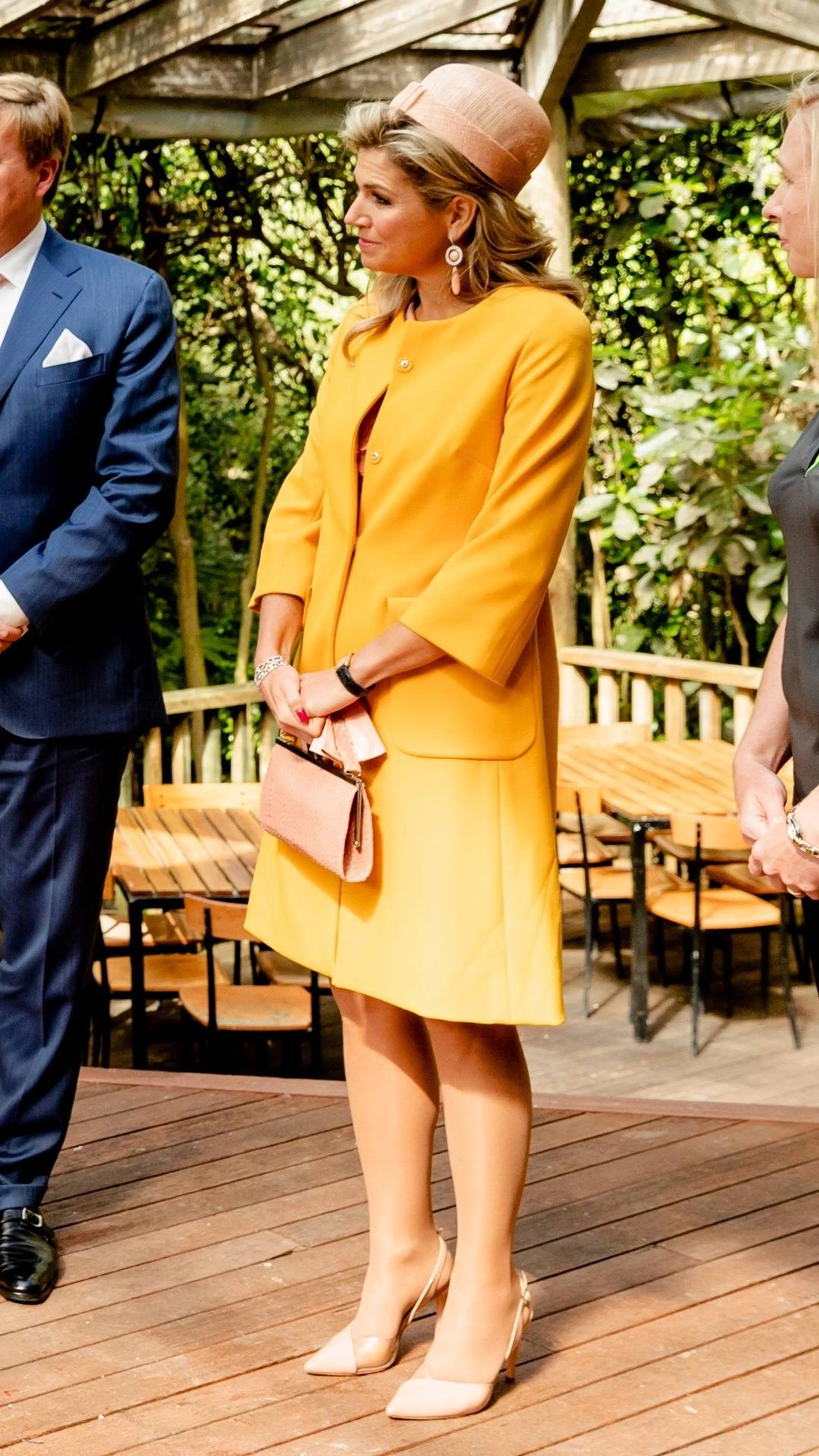 Op de tweede dag van het staatsbezoek aan Nieuw-Zeeland bezoeken de koning en koningin Christchurch. Koningin Máxima draagt een okergele mantel met een bijpassende roze japon. De kleur van de jurk matcht met de handschoenen, pill-box (kleine hoed) en handtas van Máxima.