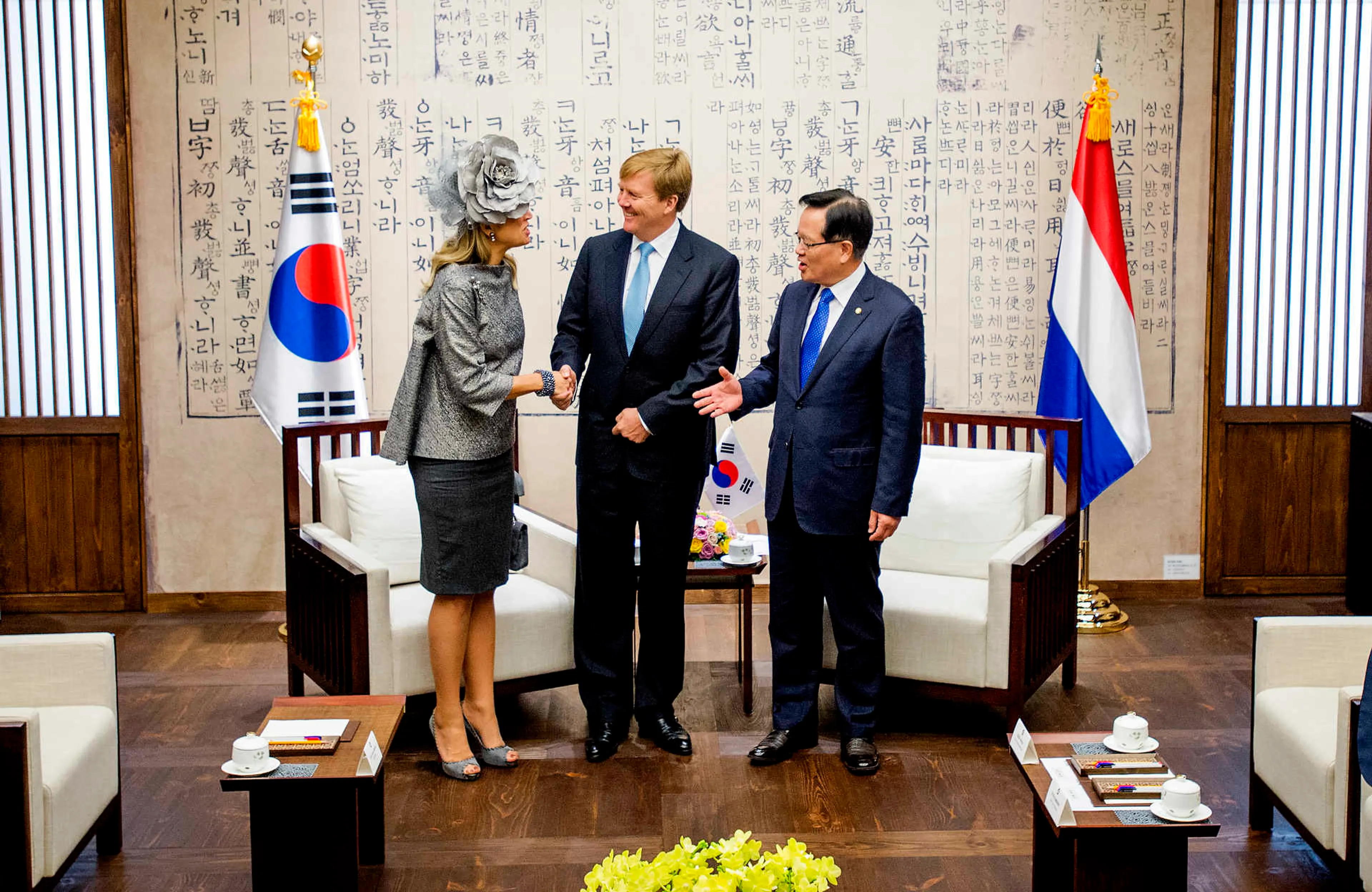 Na Japan volgde, begin november 2014 (ze waren toch in de buurt), Zuid-Korea. Met een beetje gevoel voor theater kunnen we dat ‘het bezoek van de uitgestoken, lege hand’ noemen. Een Zuid-Koreaanse cameraman vroeg of koning Willem-Alexander een handshake wilde demonstreren. Met de parlementsvoorzitter, was zijn bedoeling. Die stond er dan ook helemaal klaar voor. Maar óf onze koning had dat niet begrepen, óf hij wilde zich niet laten betuttelen, óf hij wilde aan de inlossing van het verzoek zijn eigen draai geven. Hoe dan ook, Willem-Alexander gaf Máxima een stevige handdruk – de parlementsvoorzitter keek beteuterd toe, maar kreeg hierna ook een hand van de koning. Hilariteit alom.