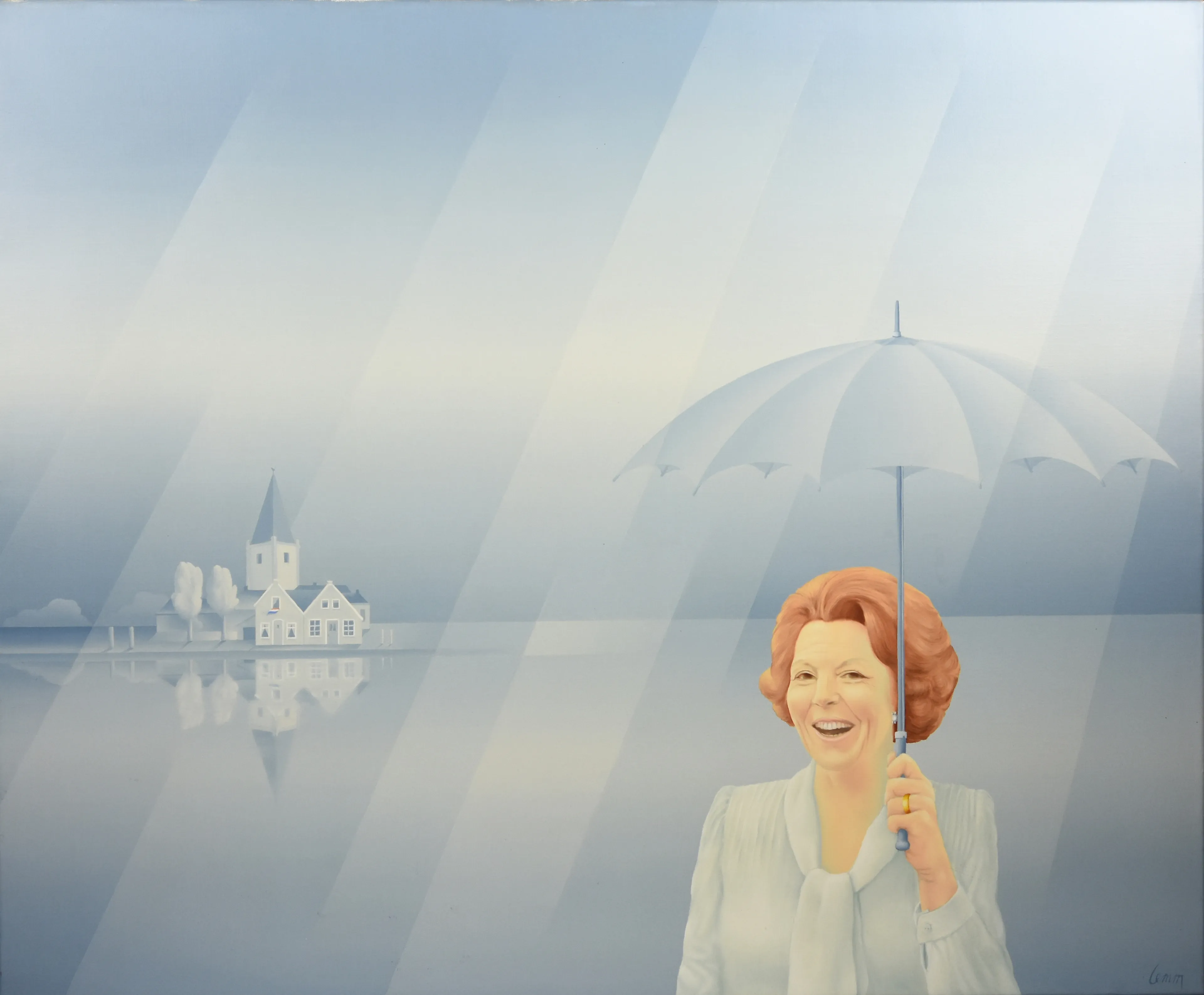 Een van die vrije werken is van Jam Lemmens, koningin Beatrix met paraplu genaamd. Links aan de horizon is een kerk met bomen en enkele huizen te zien. Daarnaast “zien we ook een heel klein vlaggetje alsof het koninginnedag is”, merkt de conservator op. Welke plaats we hier zien, is onbekend. Weet jij welk dorp we zien? Herken jij misschien het huis? Laat het ons dan weten via blauwbloed@eo.nl.