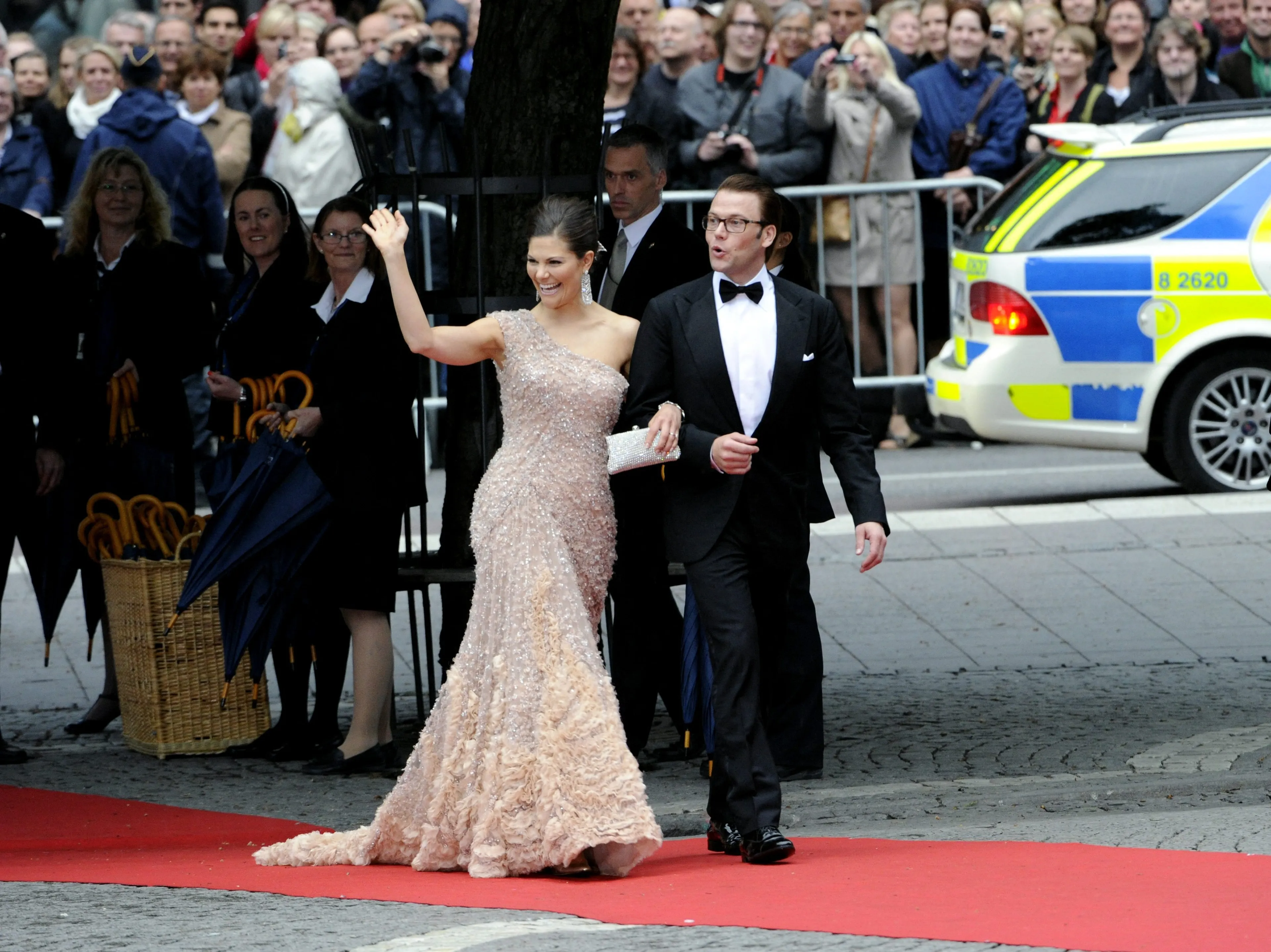 De dag voor het huwelijk van kroonprinses Victoria en Daniel werd een banket georganiseerd door de Zweedse regering. De aanstaande bruid verscheen in een poederroze avondjurk van kant, de rok en sleep zijn van zijden ciffon. Op de glamoureuze jurk, ontworpen door Elie Saab, zijn met de hand pailletten en parels gestikt.