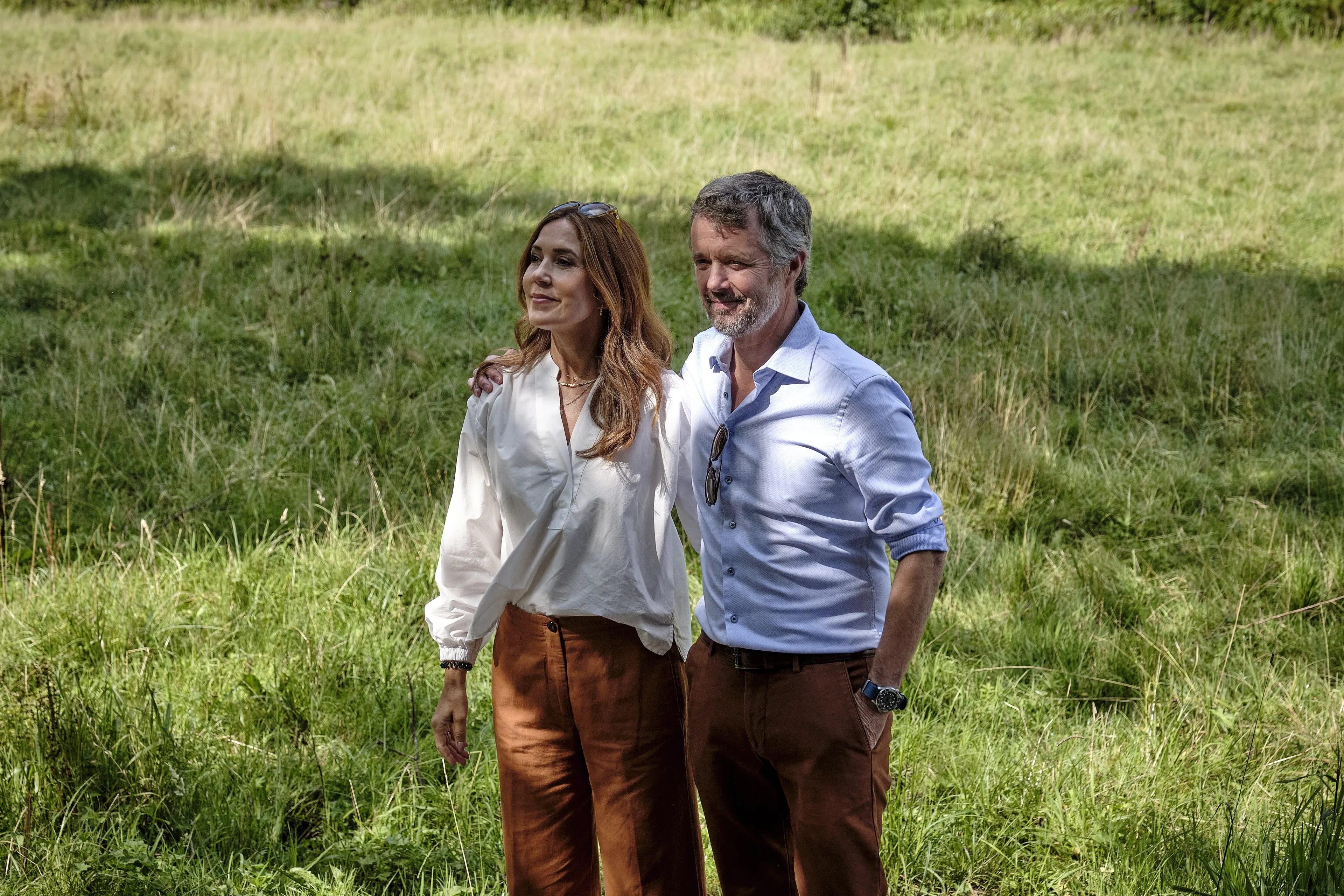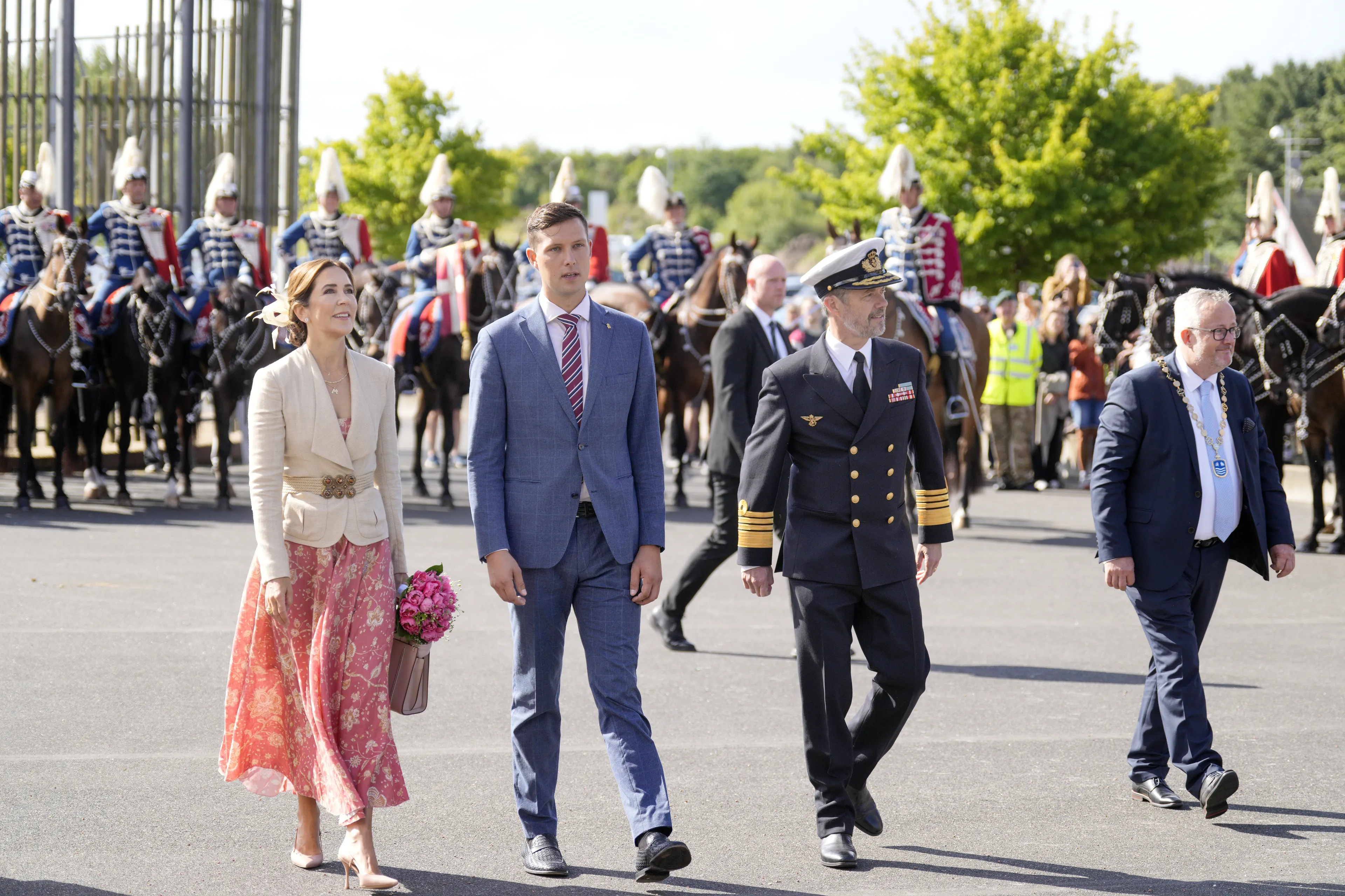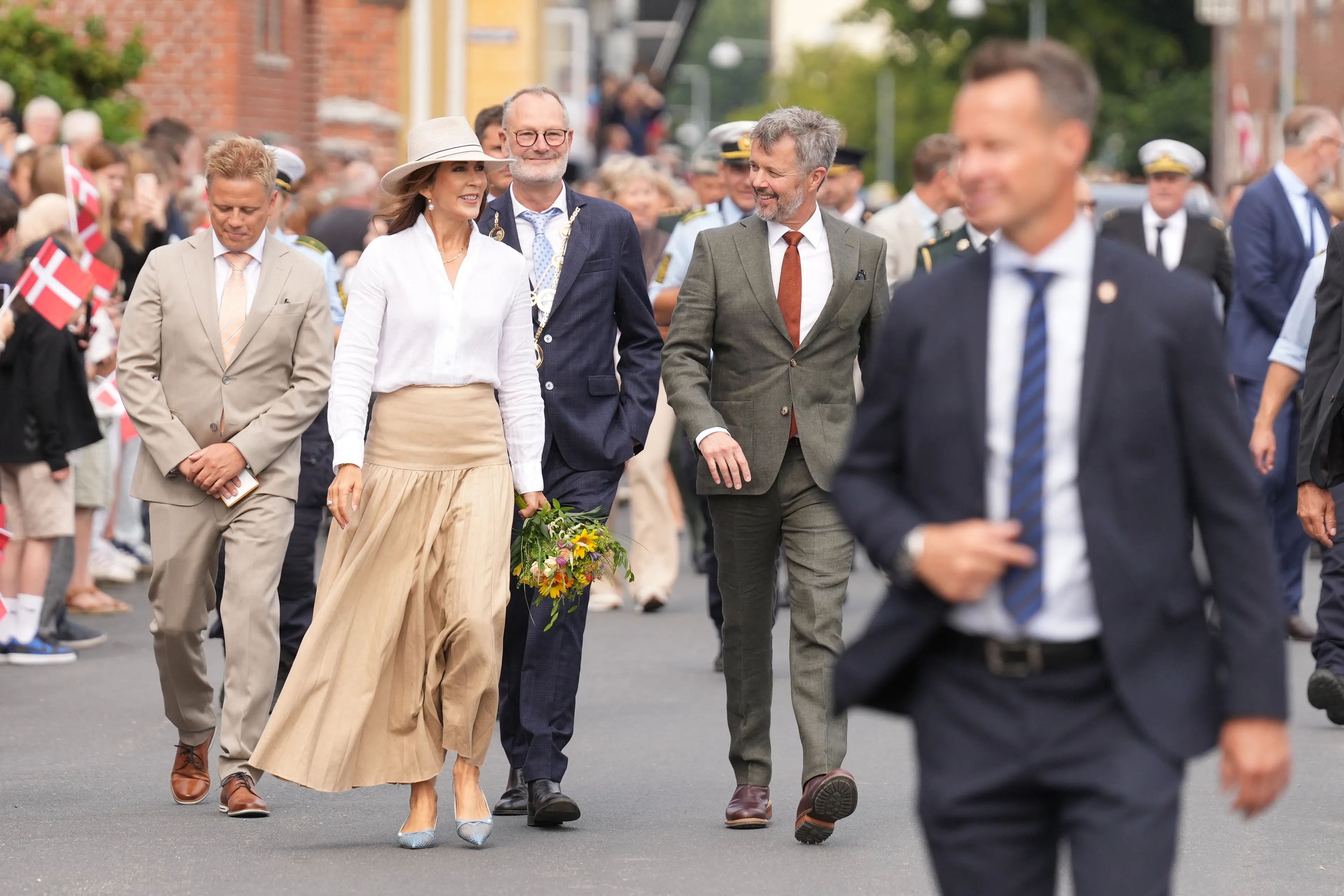 Voor de tweede dag van de zomertocht kiest koningin Mary voor een elegante outfit. Ze combineert een wit overhemd met een lange rok in camelkleur. Mary maakt de look af met een hoed en lichtblauwe slingbacks van Jimmy Choo. Frederik stemt zijn outfit af op die van zijn vrouw door te kiezen voor stropdas in een bijpassende roestkleur.