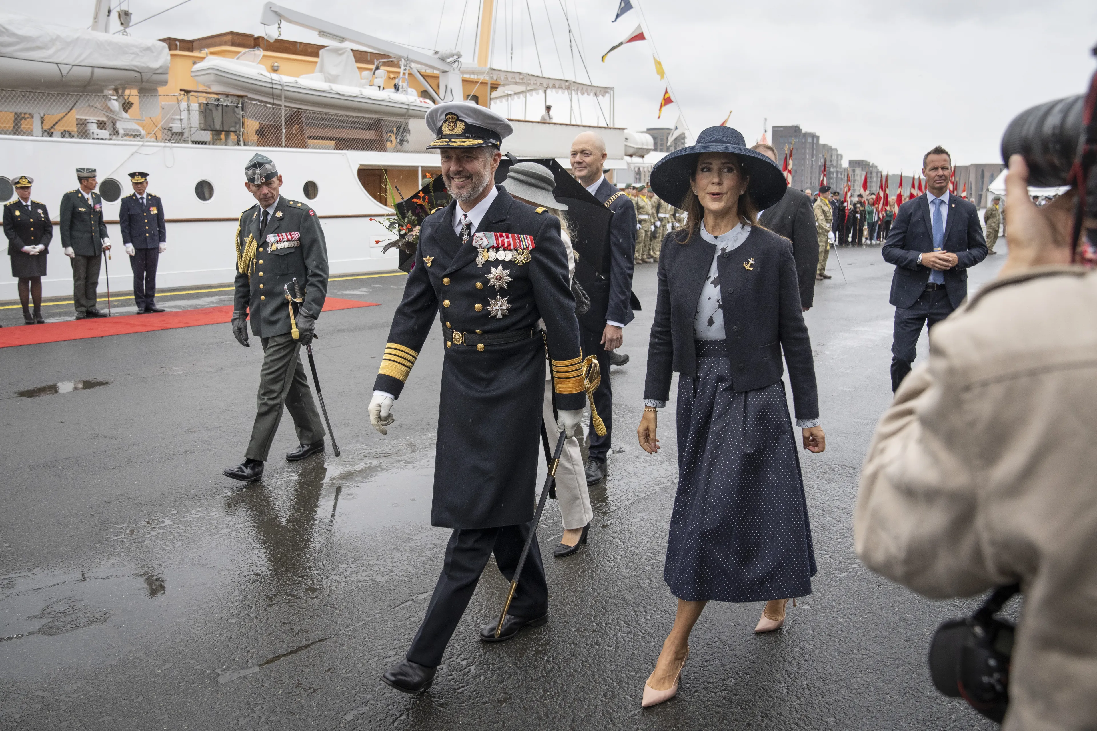 De stad Vejle is de laatste stop voor de Dannebrog, deze zomertocht. De dag begint grijs en regenachtig maar de hoed van koningin Mary biedt daar uitkomst voor. Het is een stijlvolle manier om haar kapsel te beschermen tegen de regen. Verder draagt Mary een rok met kleine polkadots en een lichtblauwe blouse met print. Om zich warm te houden heeft ze een cropped jasje van het modemerk Prada aan. Met haar donkerblauwe outfit, versierd met een gouden ankerbroche, past Mary uitstekend in het maritieme thema van de zomertour.