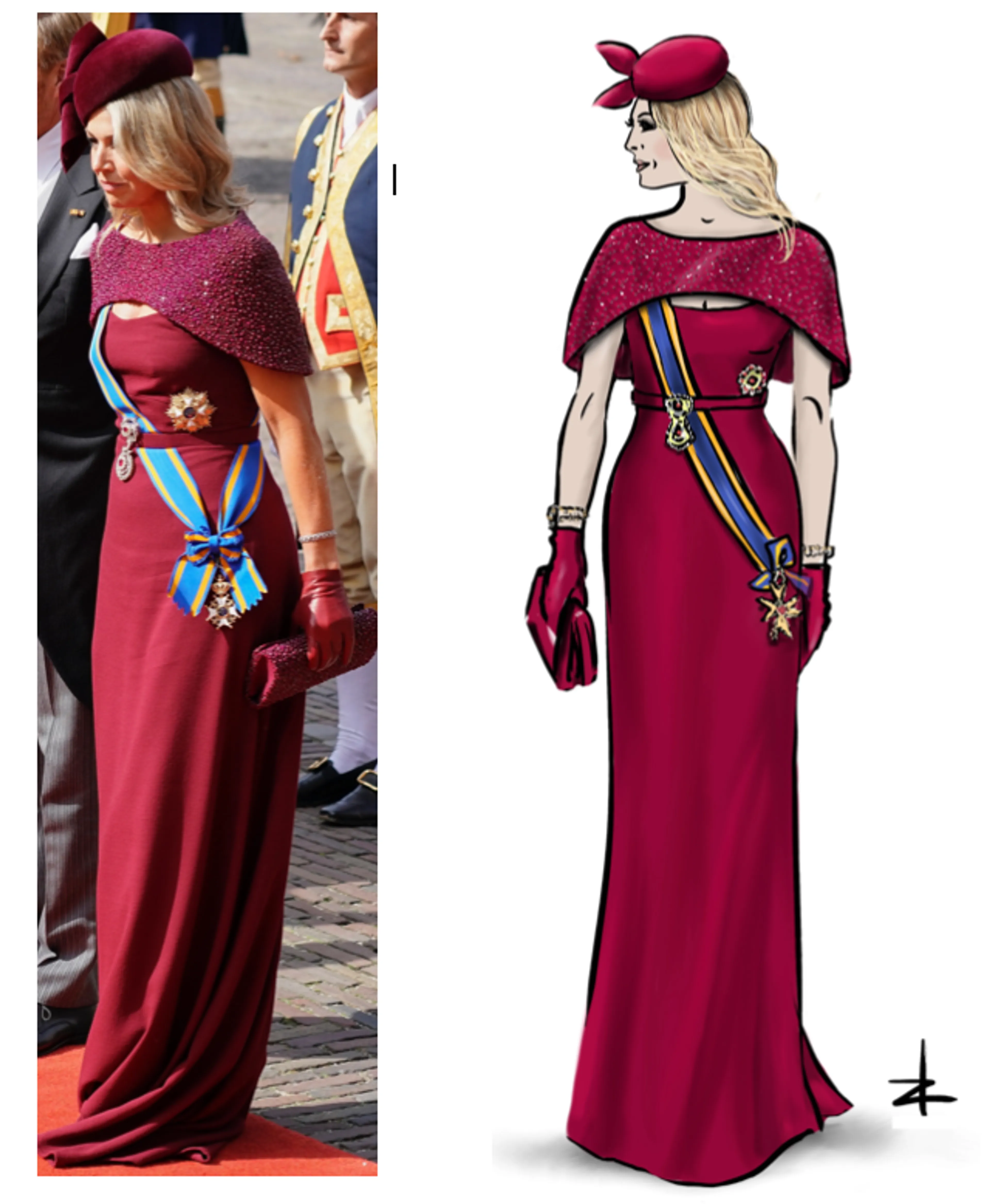 Hieronder twee foto's en tekeningen van de laatste Prinsjesdag-outfit van de koningin, en de jurk van Claes Iversen die zij droeg op de zomerfotosessie in 2019. Zie je hoe goed het getekend is?