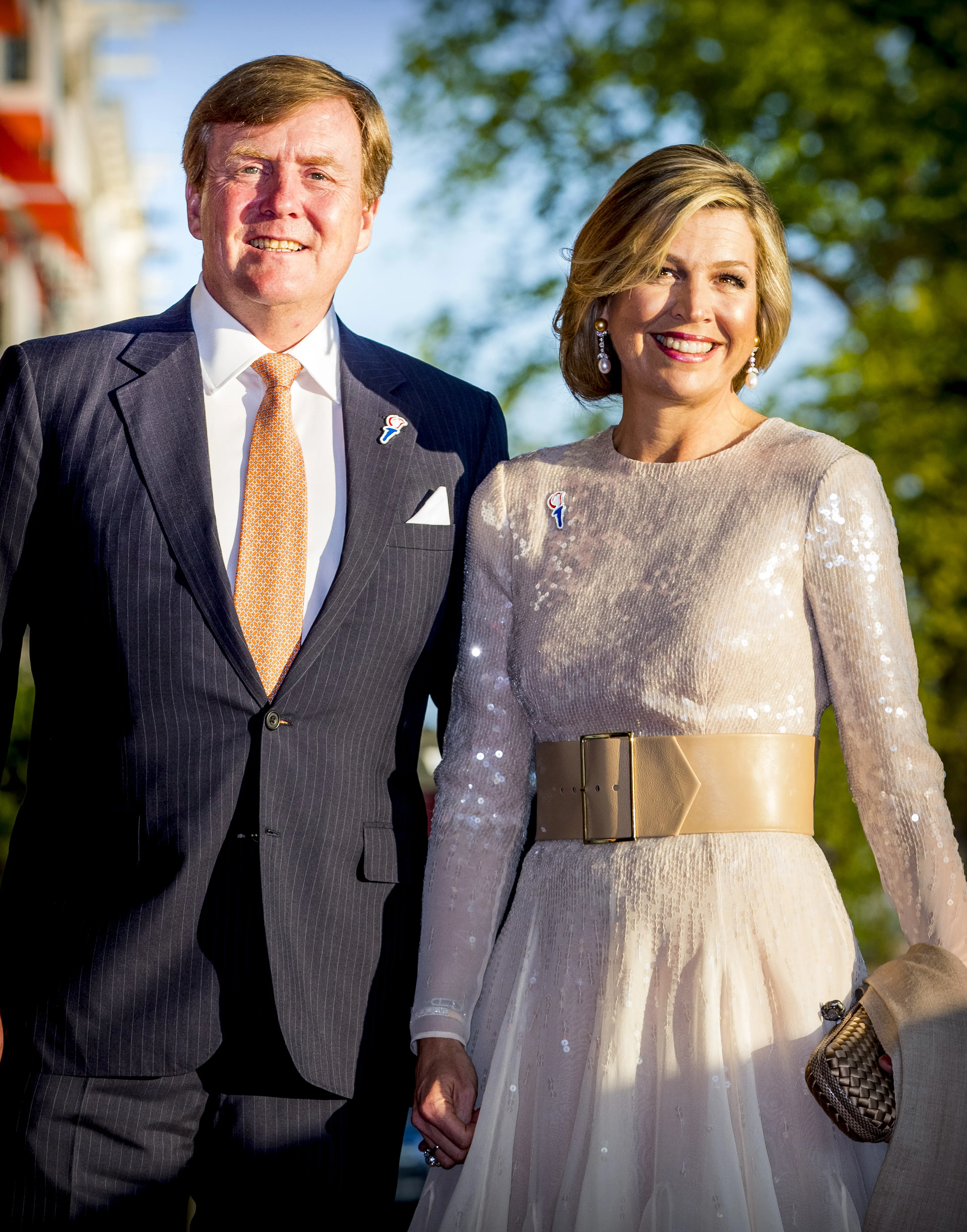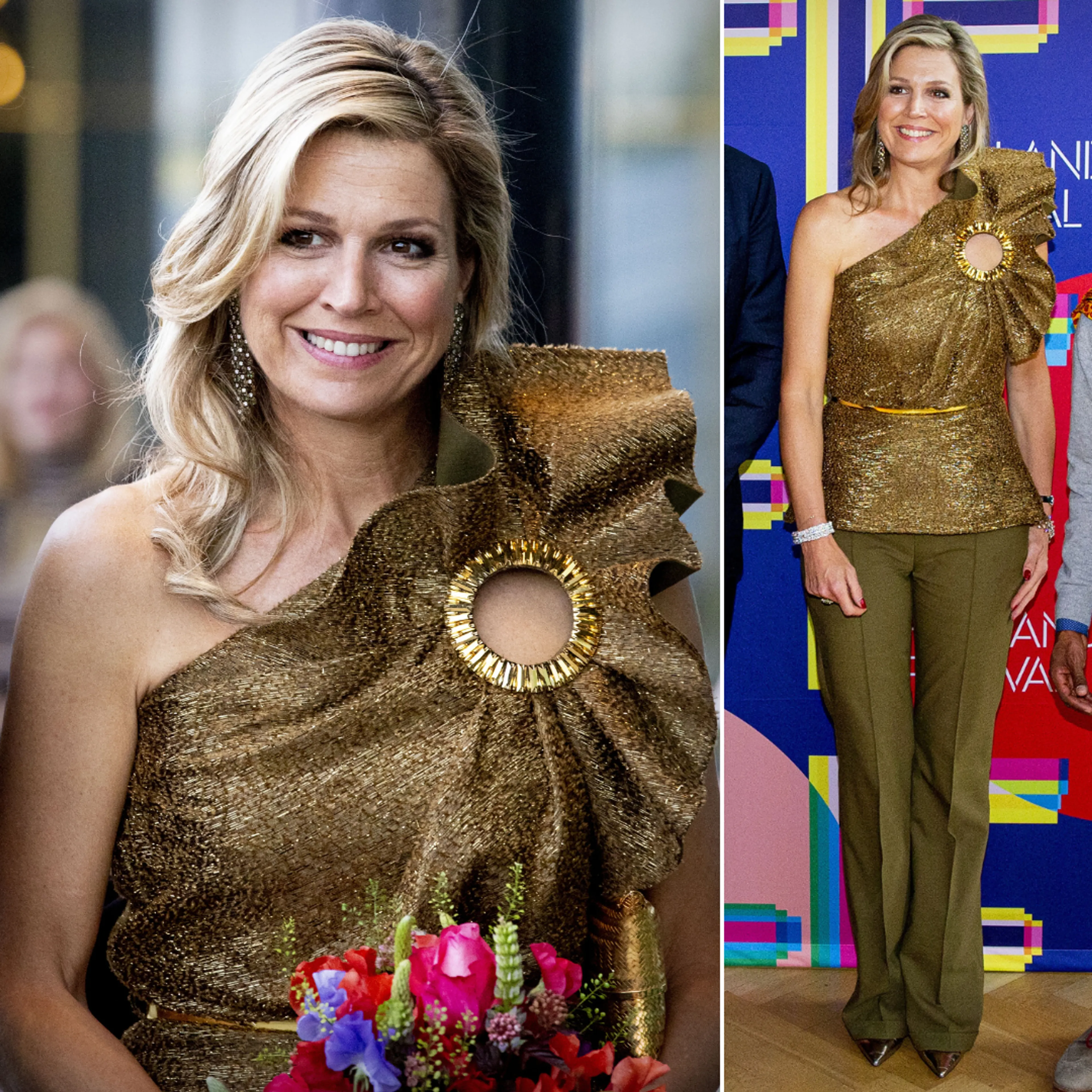 Voor de openingsvoorstelling van het Holland Festival in Amsterdam gaat de koningin voor een opvallende top. Het goudkleurige item wordt vaker uit de kast getrokken, bijvoorbeeld op Máxima's 49e verjaardag en tijdens een bezoek aan Texas.