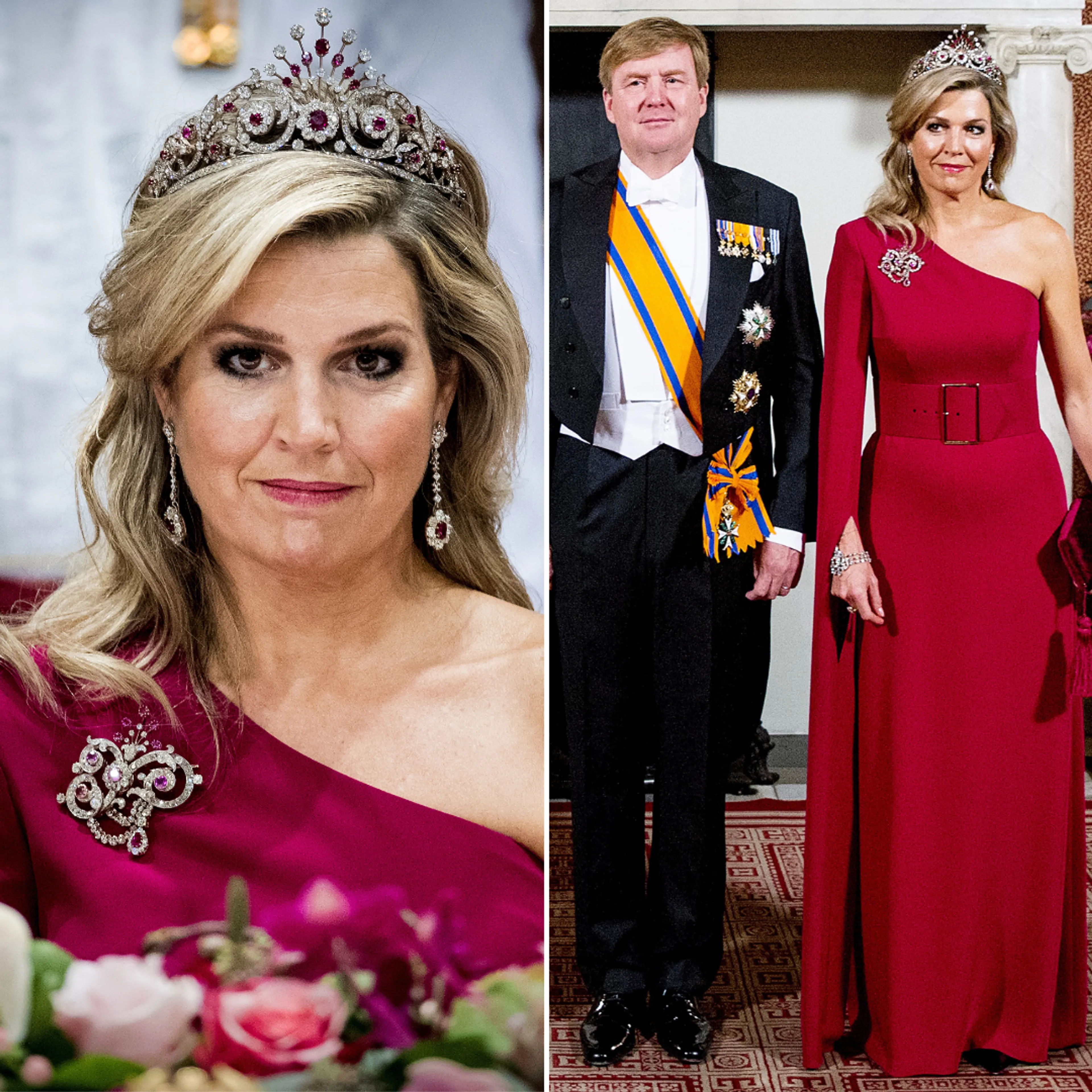 Voor een staatsbanket met de president van Singapore trekt Máxima een asymmetrische avondjurk uit de kast. De diadeem, oorbellen en broche passen er perfect bij.
