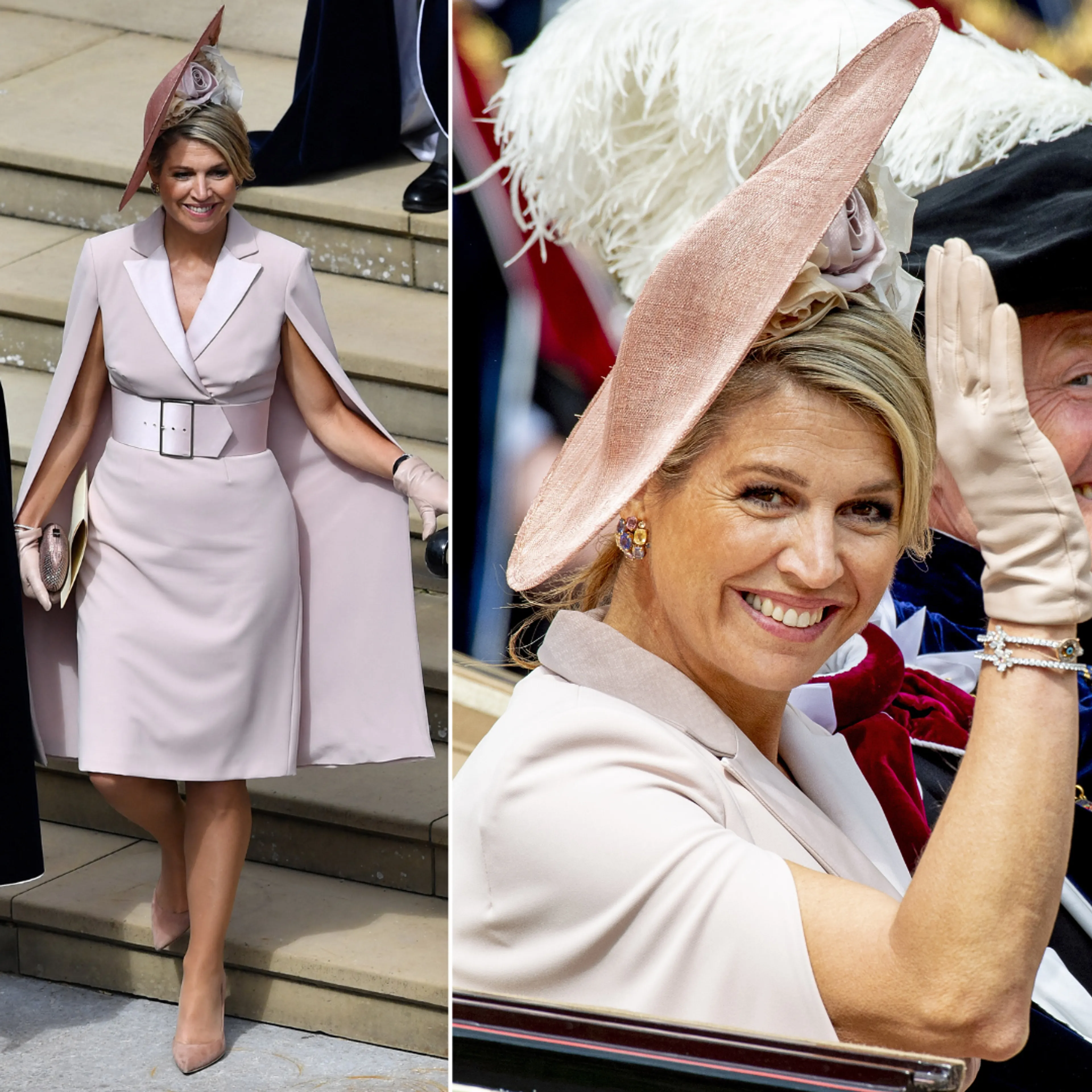 Deze lichtroze capejurk is een plaatje als je het ons vraagt. Koningin Máxima droeg het ontwerp op 17 juni 2019 in Engeland. Toen werd koning Willem-Alexander geïnstalleerd tot ridder in de Orde van de Kousenband.