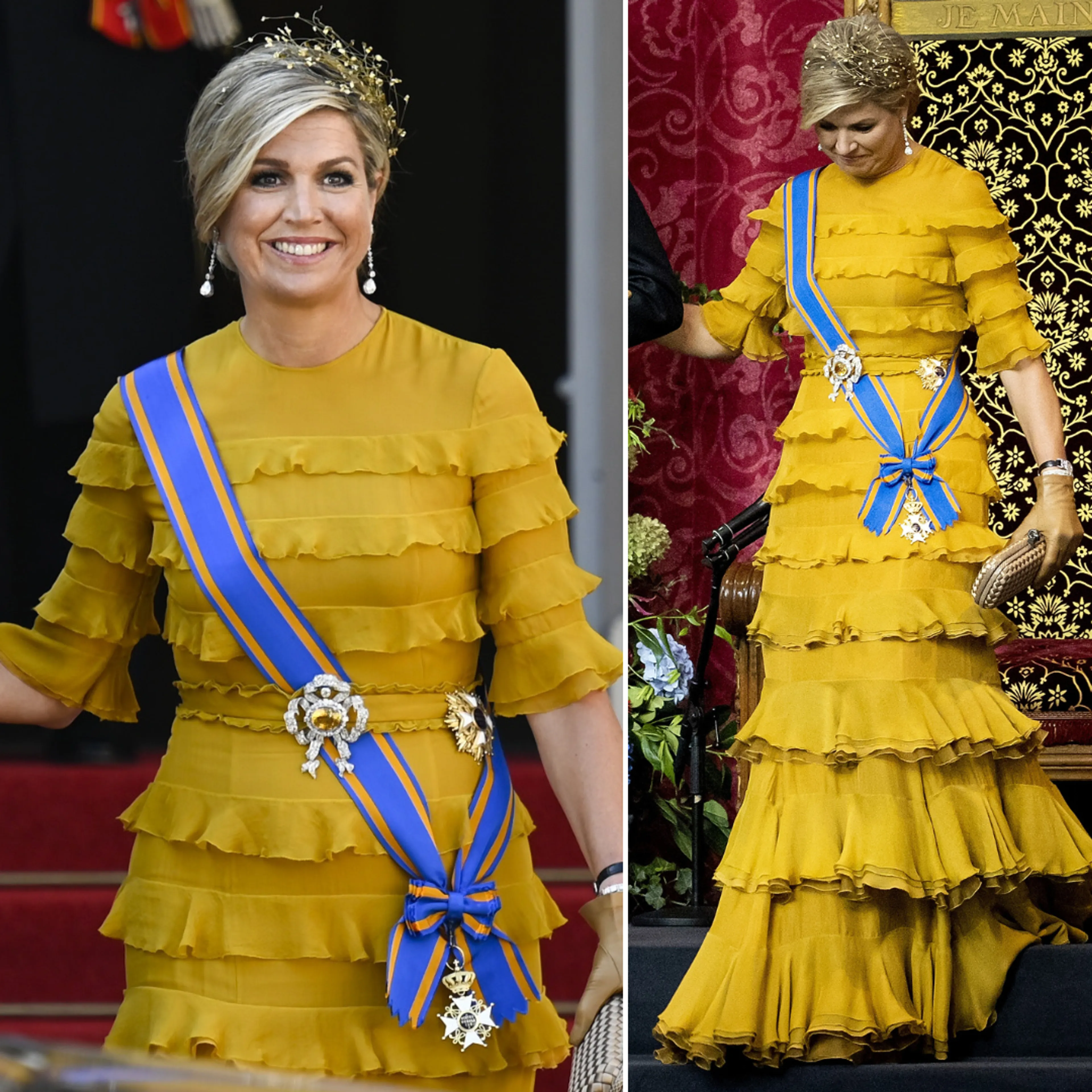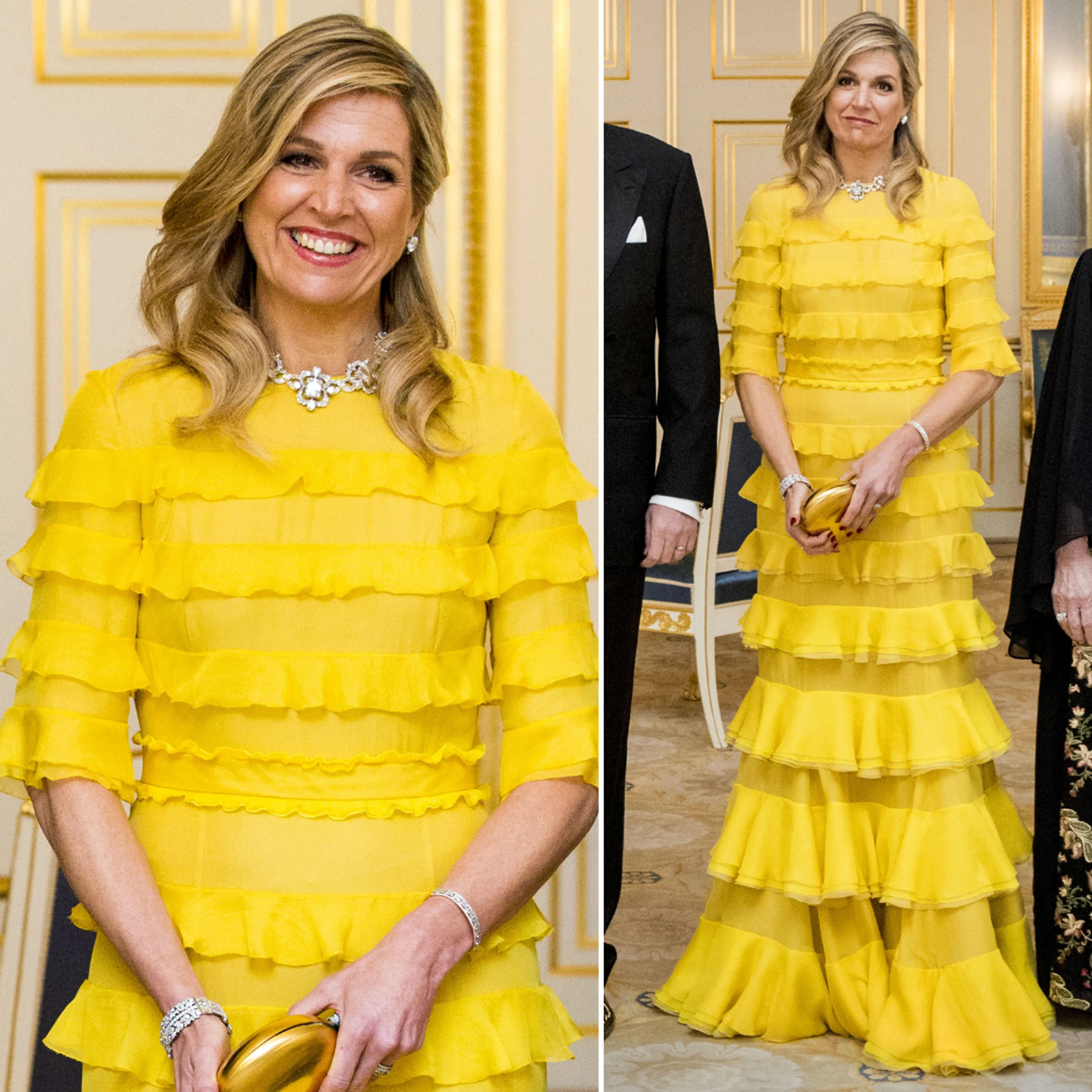 Voor een diner met koning Abdullah en koningin Rania, in 2018, schaft Máxima deze knalgele galajurk aan. De japon is gemaakt van zijde en werd gedragen op Paleis Noordeinde.