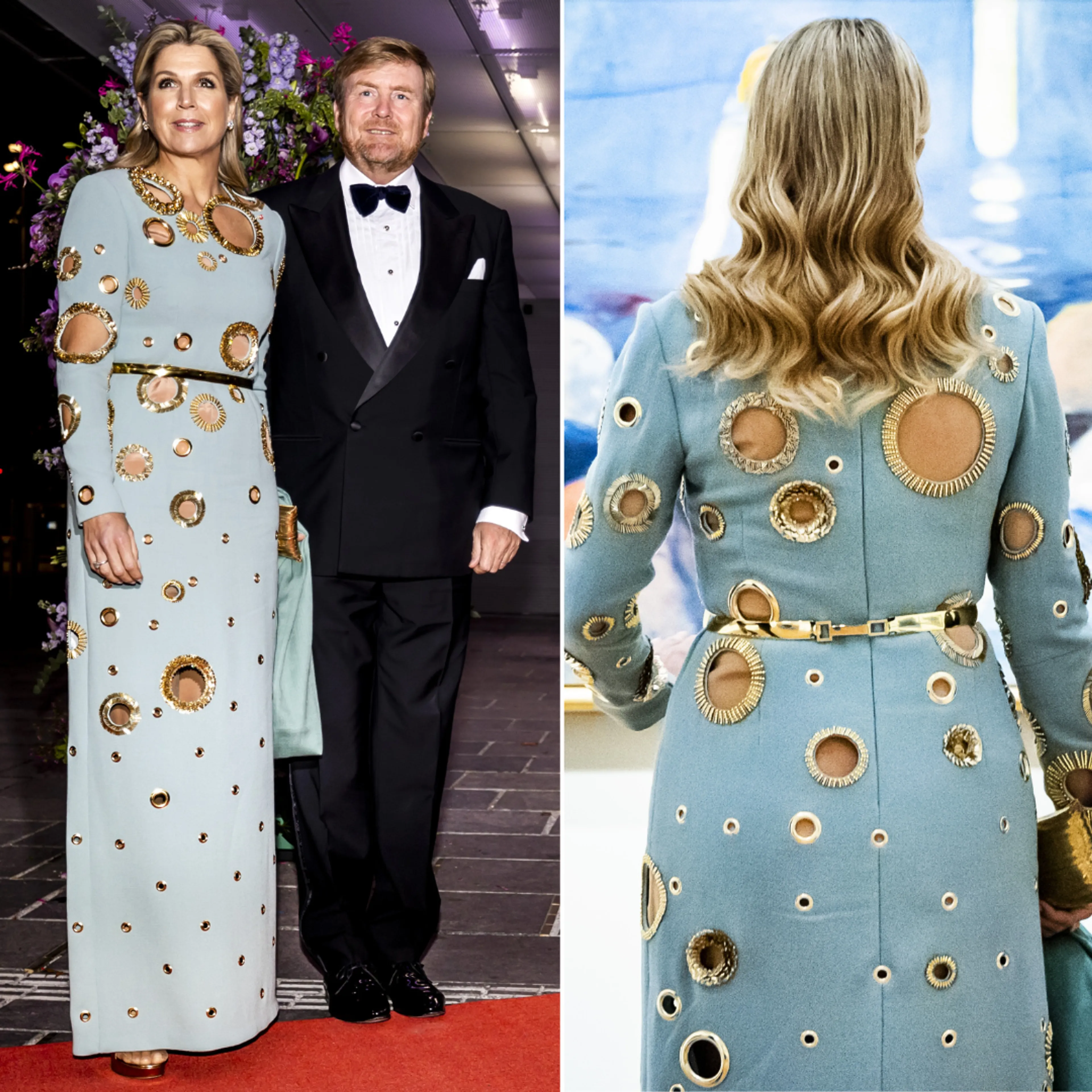 Ook tijdens een staatsbezoek aan Noorwegen, in het najaar van 2021, draagt Máxima een ontwerp vol gouden ringen. Wie denkt door de ringen heen te kunnen kijken heeft het mis, onder de meeste 'gaten' is een huidkleurige stof aangebracht.