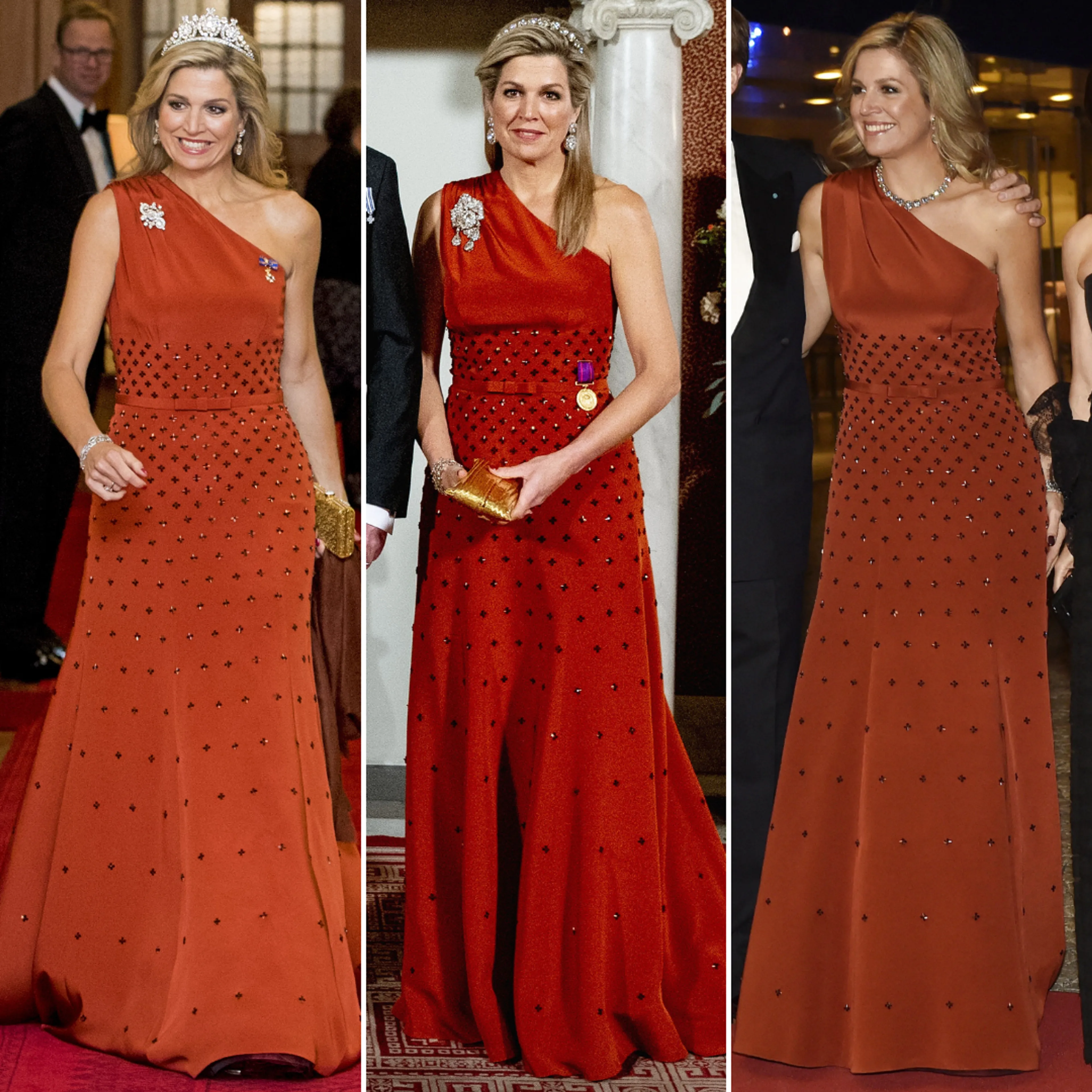 Koningin Máxima heeft deze avondjurk inmiddels drie keer gedragen. Zowel voor de uitgaande staatsbezoeken aan Nieuw-Zeeland en Denemarken, als voor het inkomende staatsbezoek van Kaapverdië schittert Máxima in de japon.