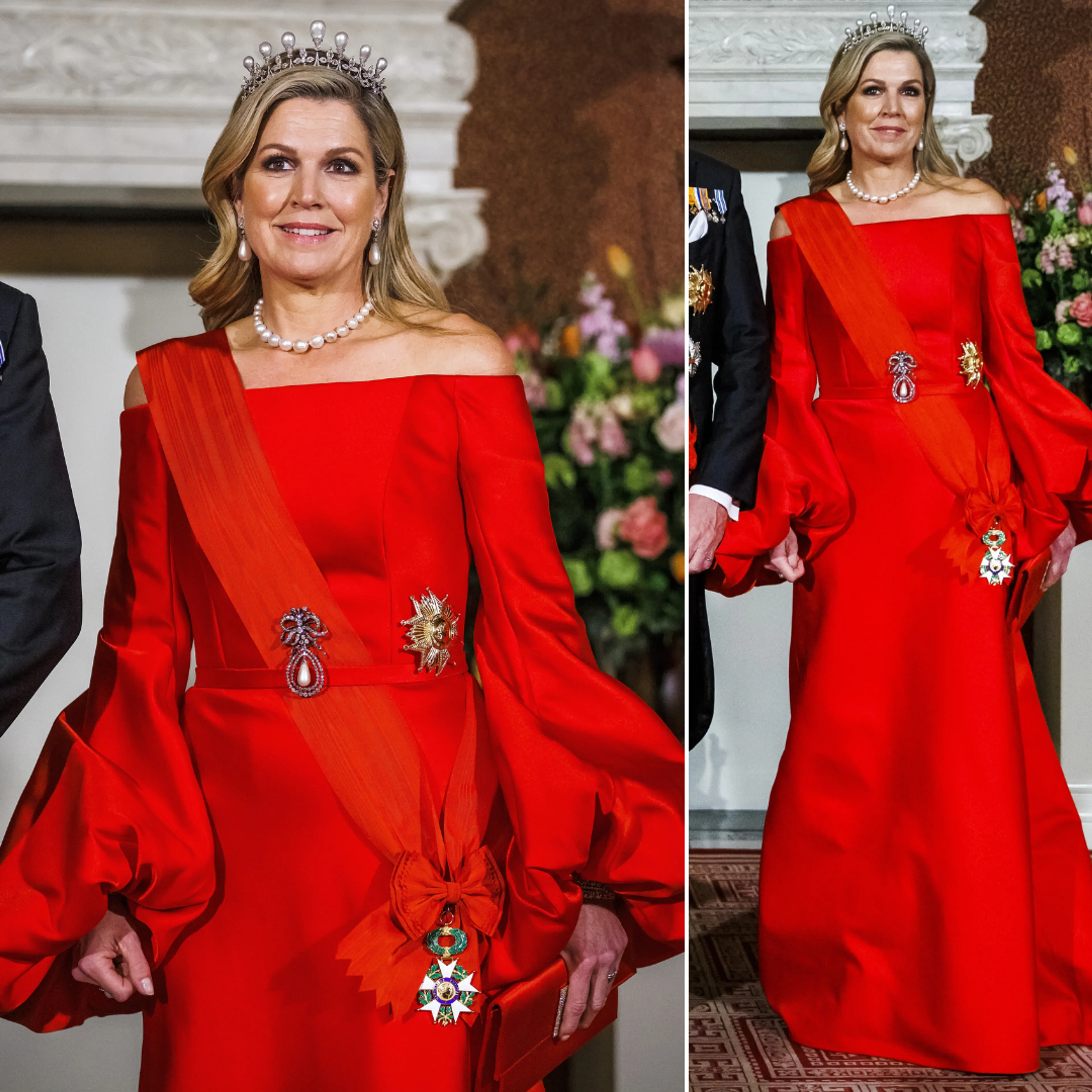 In april brengt de Franse president Emmanuel Macron een staatsbezoek aan Nederland. Koningin Máxima kiest tijdens het staatsbanket voor deze felrode avondjurk met ballonmouwen.