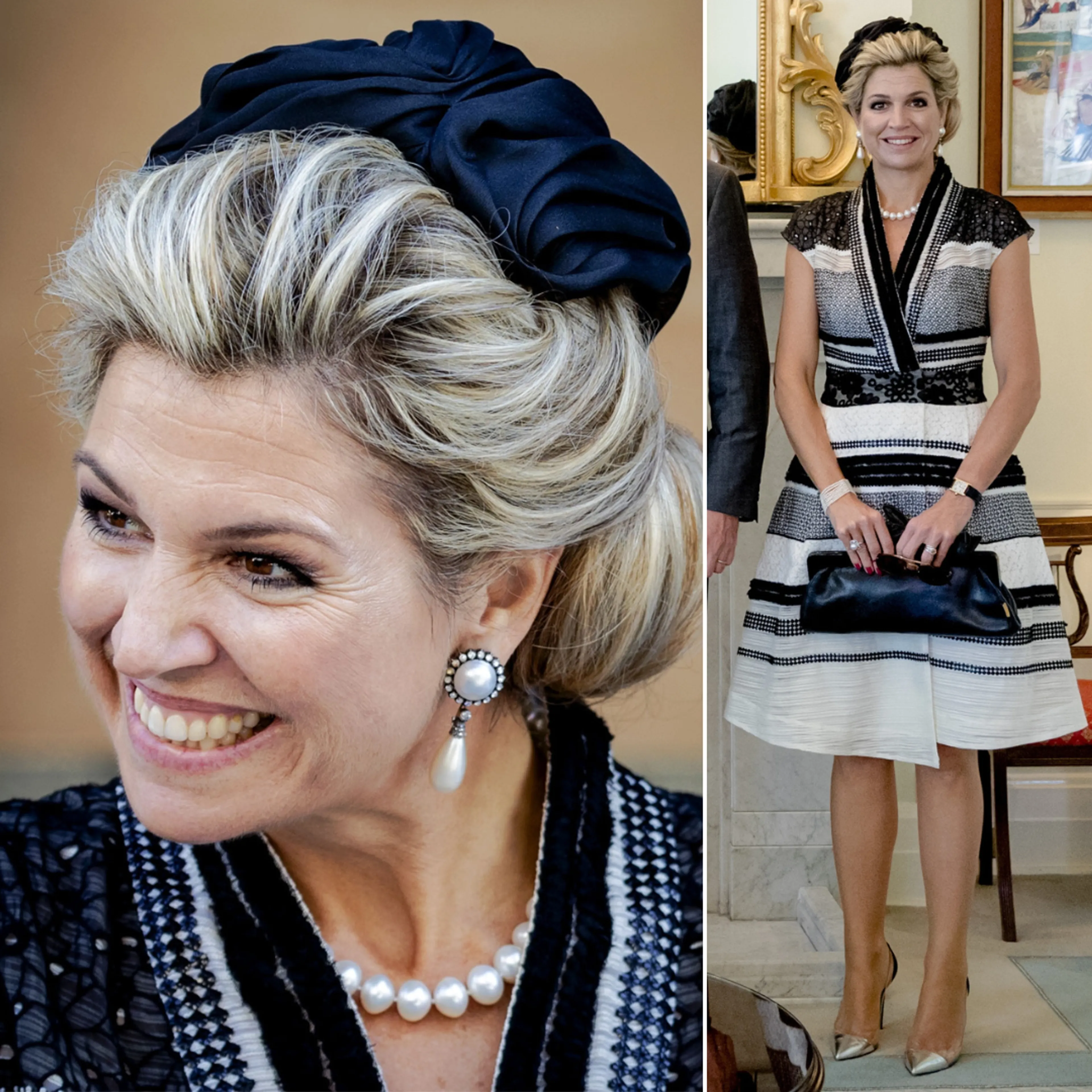 Tijdens het staatsbezoek aan Australië, in november 2016, kiest koningin Máxima voor deze stijlvolle jurk. Het zwarte hoedje en de parels maken het plaatje compleet.