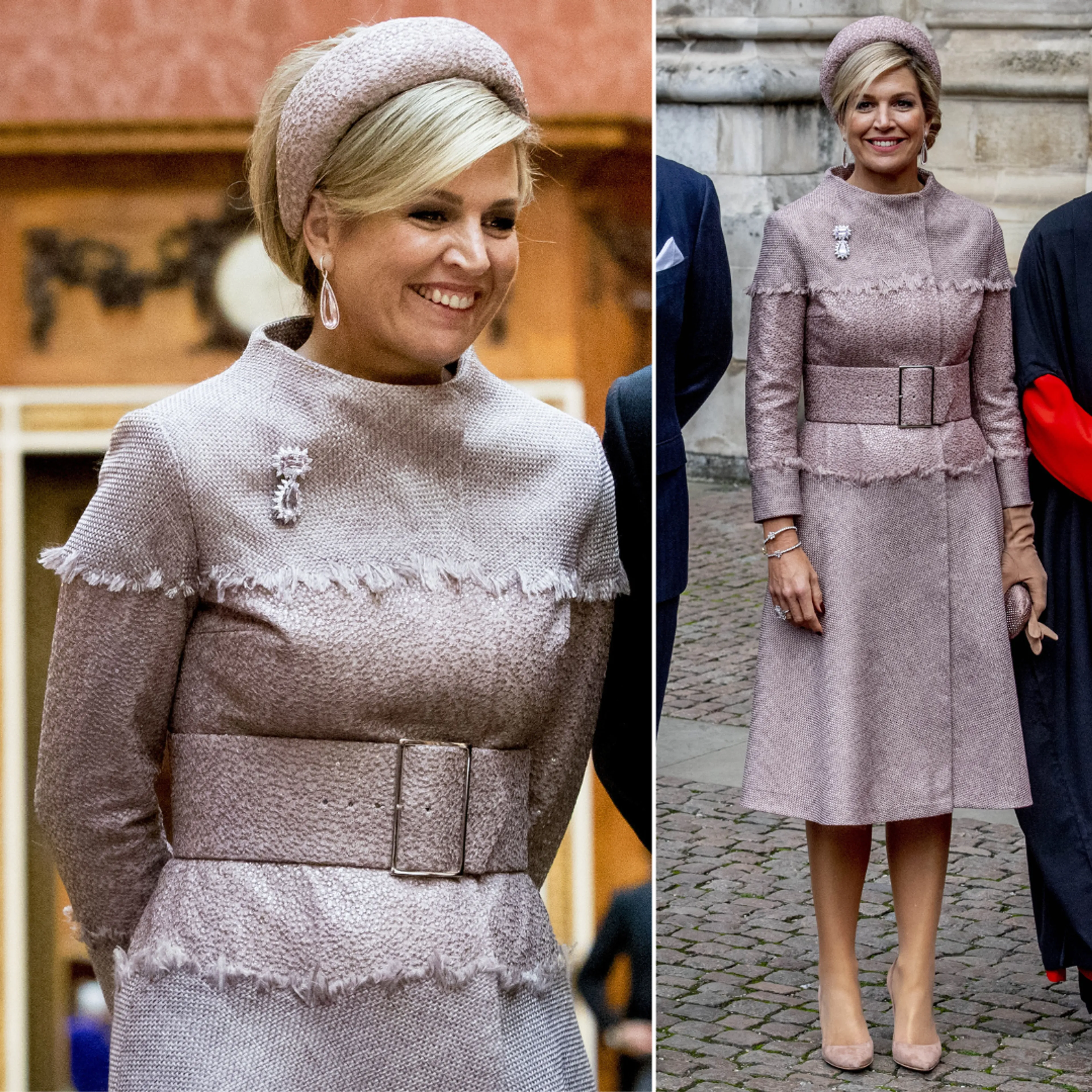 Voor het staatsbezoek aan het Verenigd Koninkrijk, een half jaar eerder, kiest Máxima wederom voor een ingetogen kleur. Om de mantel draagt de koningin een brede riem, kenmerkend voor de ontwerpen van Claes Iversen.