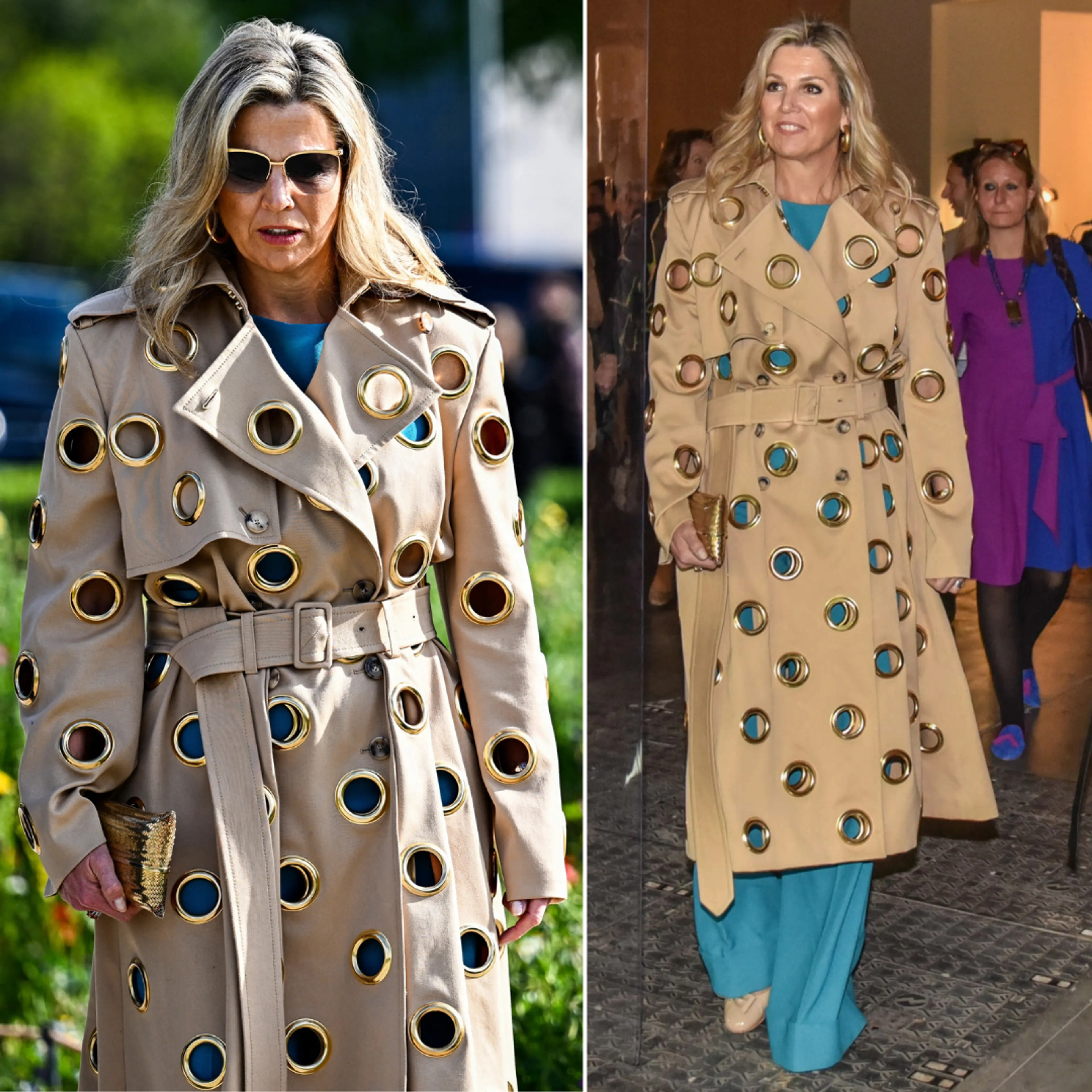 De gouden ringen beginnen kenmerkend te worden voor Claes Iversen. In april was Máxima in Milaan voor de Dutch Desgin Week. Voor de gelegenheid trekt de koningin een opvallende trenchcoat aan.