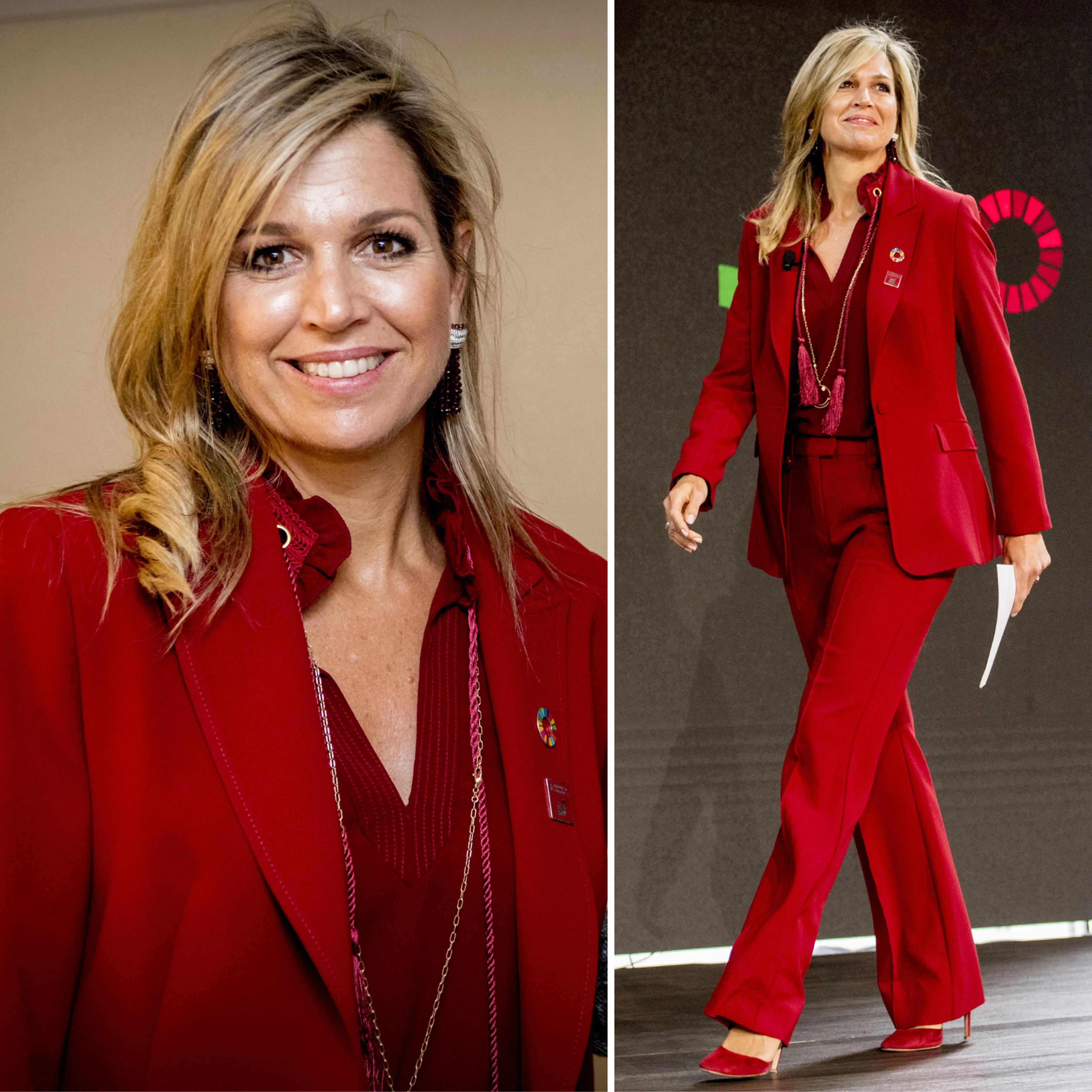 Dit rode broekpak is niet alleen een perfecte outfit voor een koningin. Ook als Máxima op pad is als zakenvrouw voor de Verenigde Naties komt het pak goed van pas.