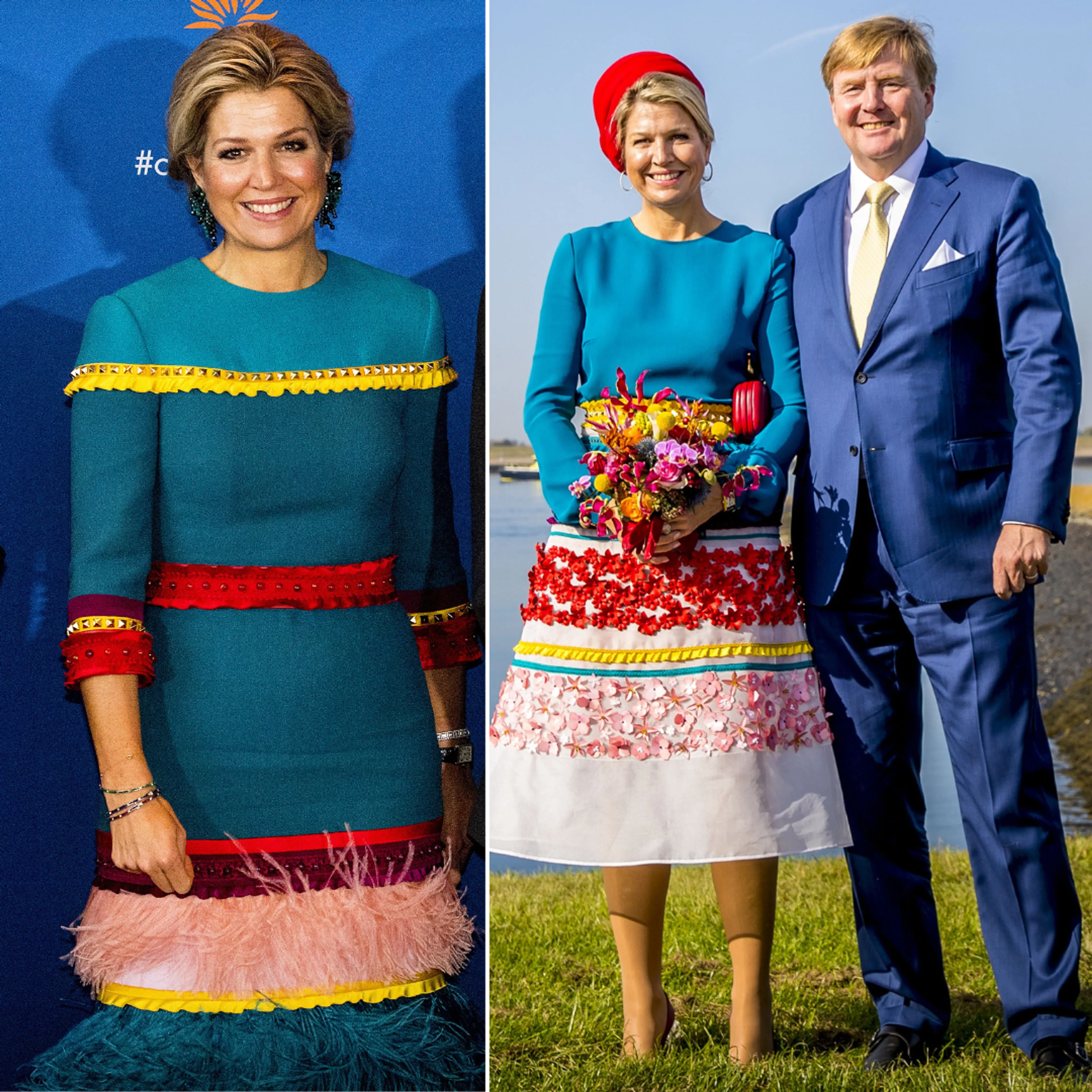 Deze kleurrijke outfits passen goed bij de gedurfde kledingsmaak van koningin Máxima. In de loop der jaren zijn beide kledingstukken al diverse keren in het openbaar gedragen.