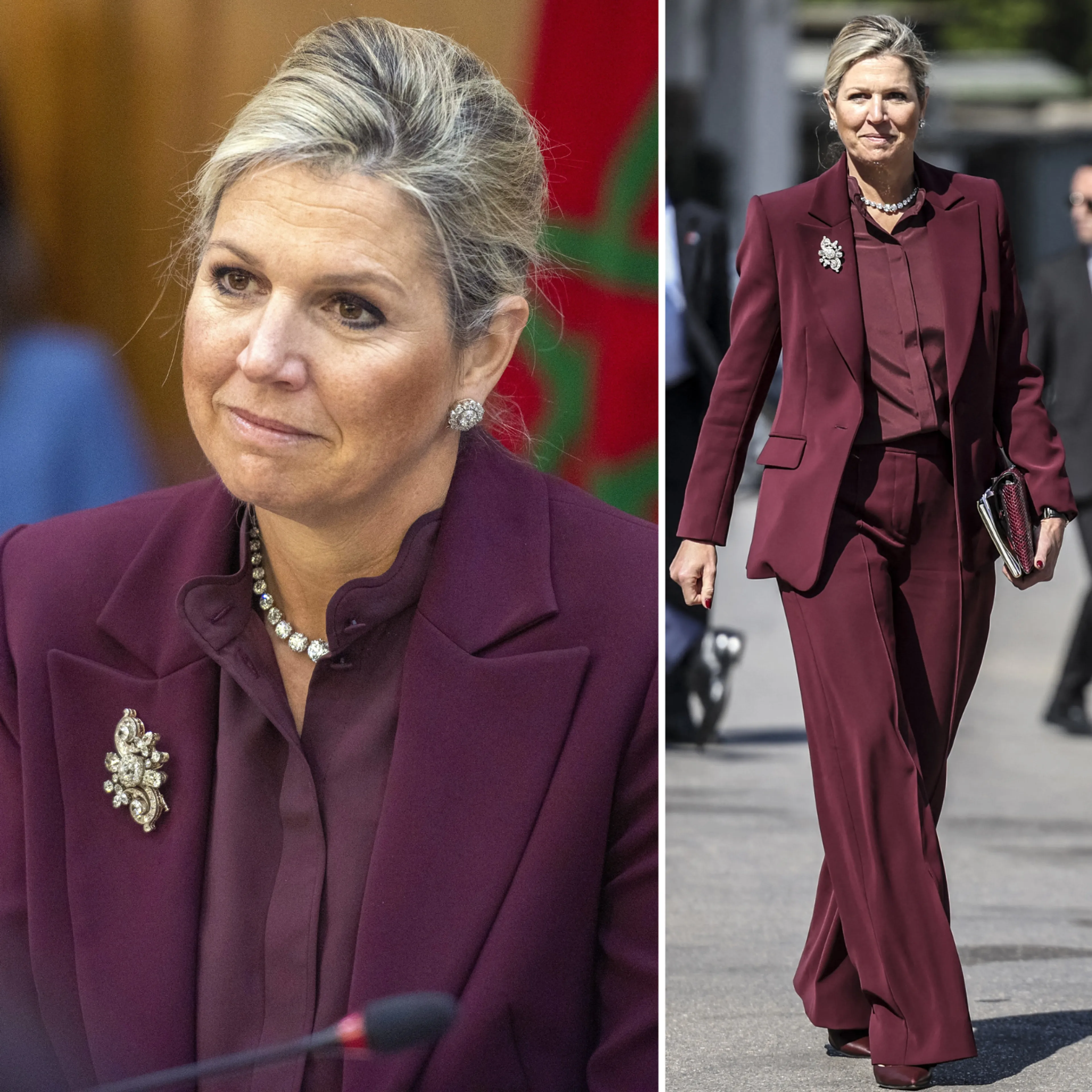 Afgelopen voorjaar maakt Máxima voor de Verenigde Naties een reis naar Marokko. Op de tweede dag draagt zij een eenvoudig maar chique donkerpaars pak.