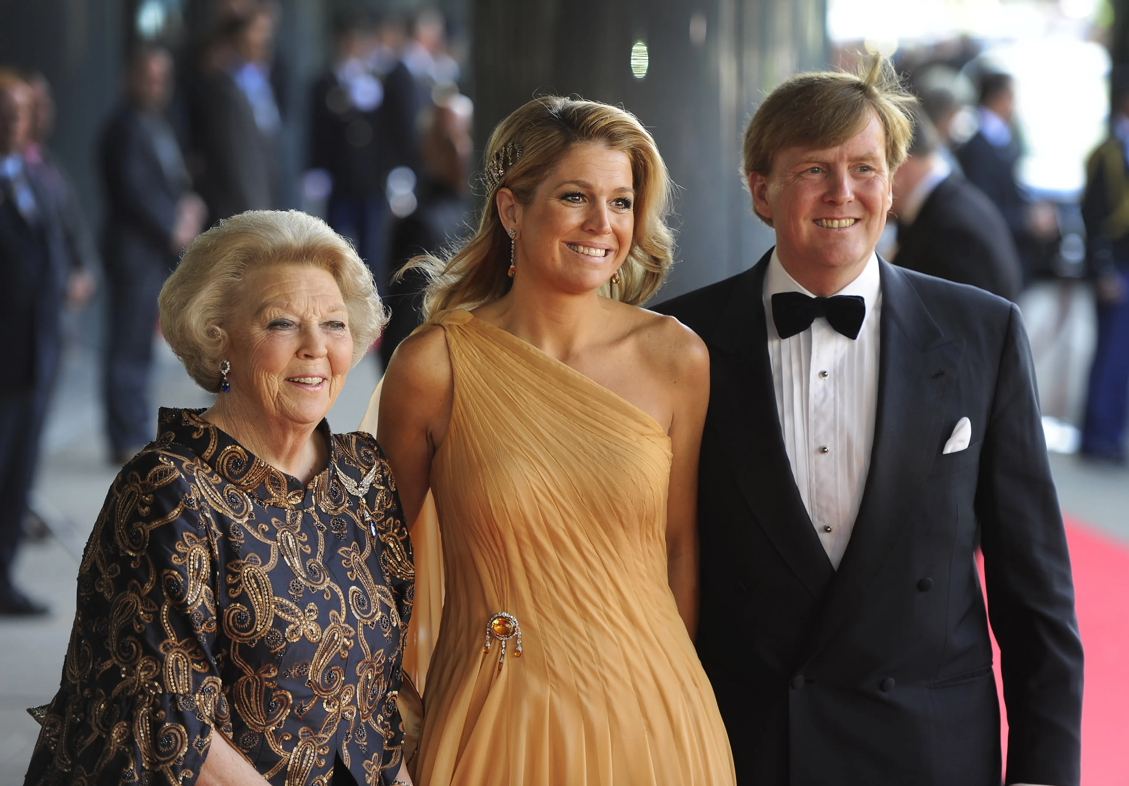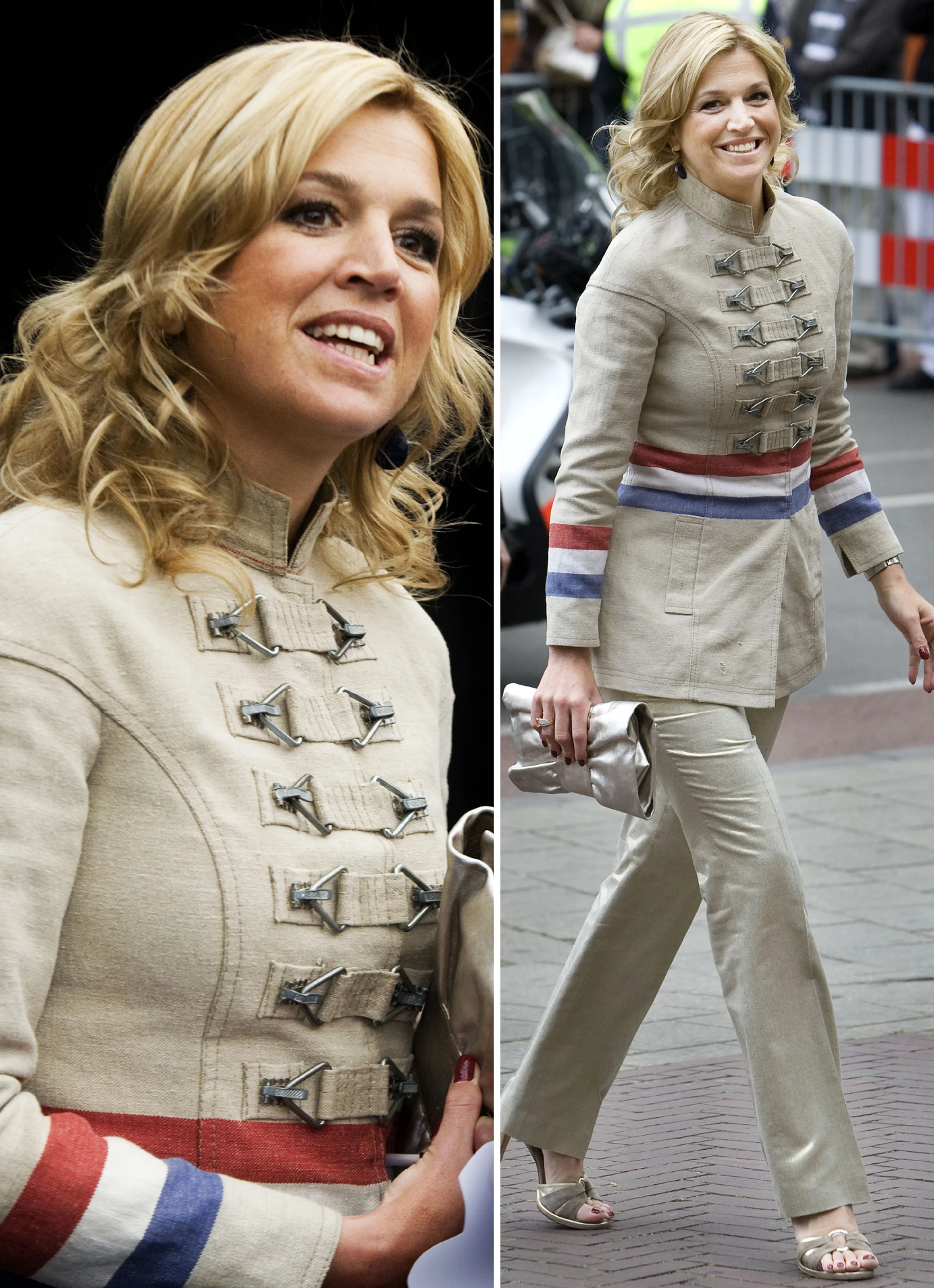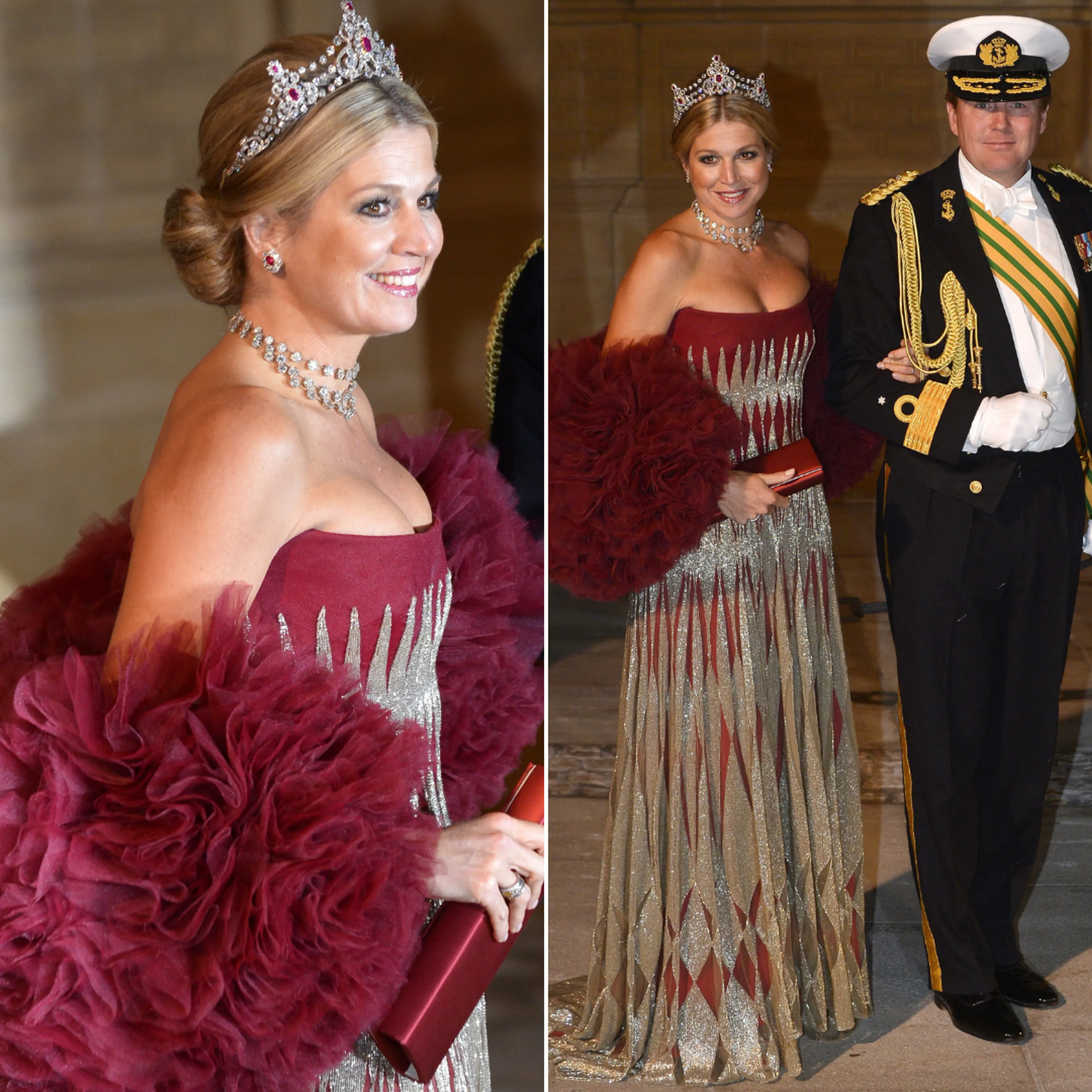Wat een plaatje! De avond voor het huwelijk van erfgroothertog Guillaume en zijn vrouw Stéphanie van Luxemburg droeg Máxima deze jurk met 'wybertjes-effect', genoemd naar de snoepjes.