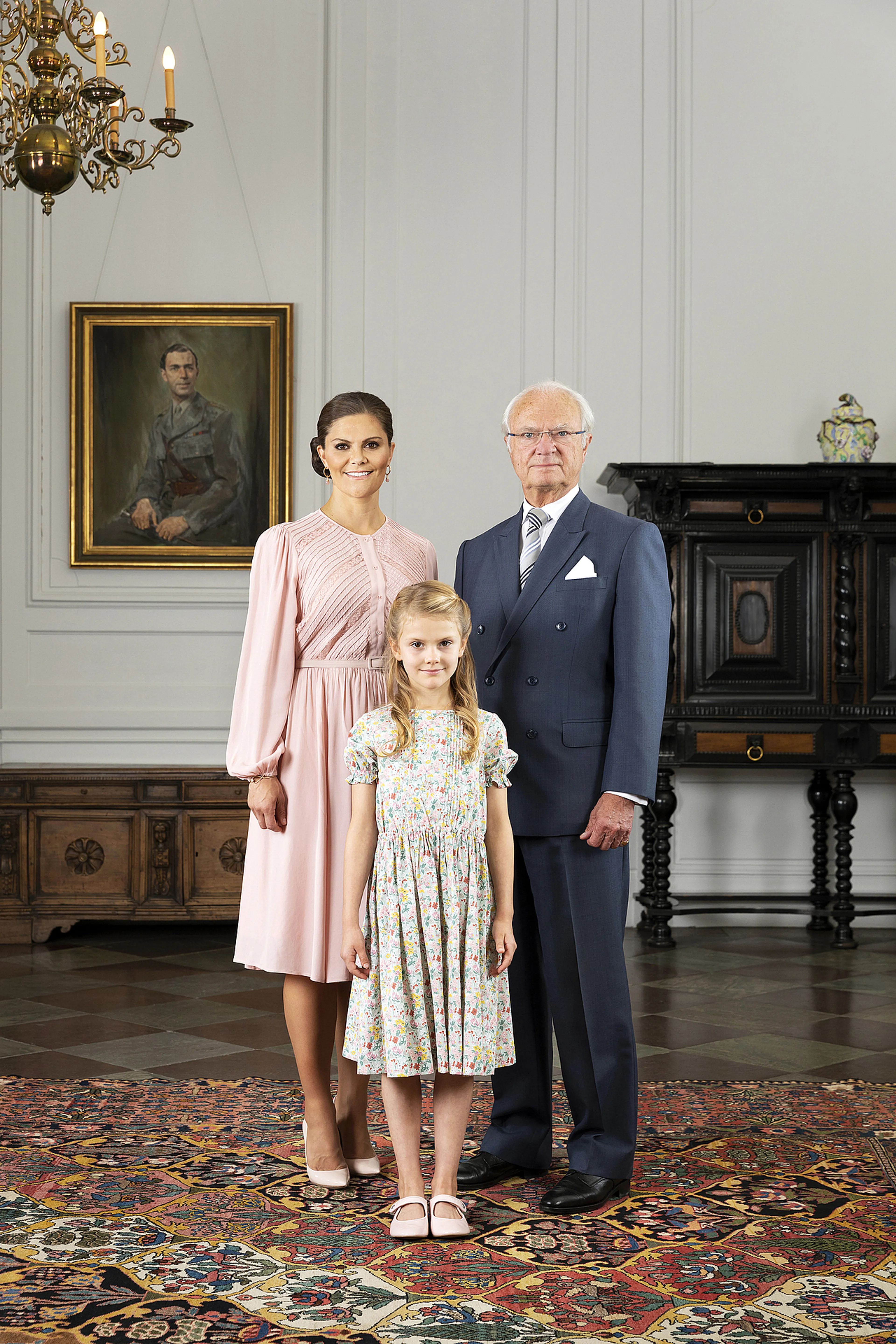 Het Zweedse hof heeft maandag een nieuwe foto vrijgegeven van koning Carl Gustaf en zijn troonopvolgsters: dochter Victoria en kleindochter Estelle.