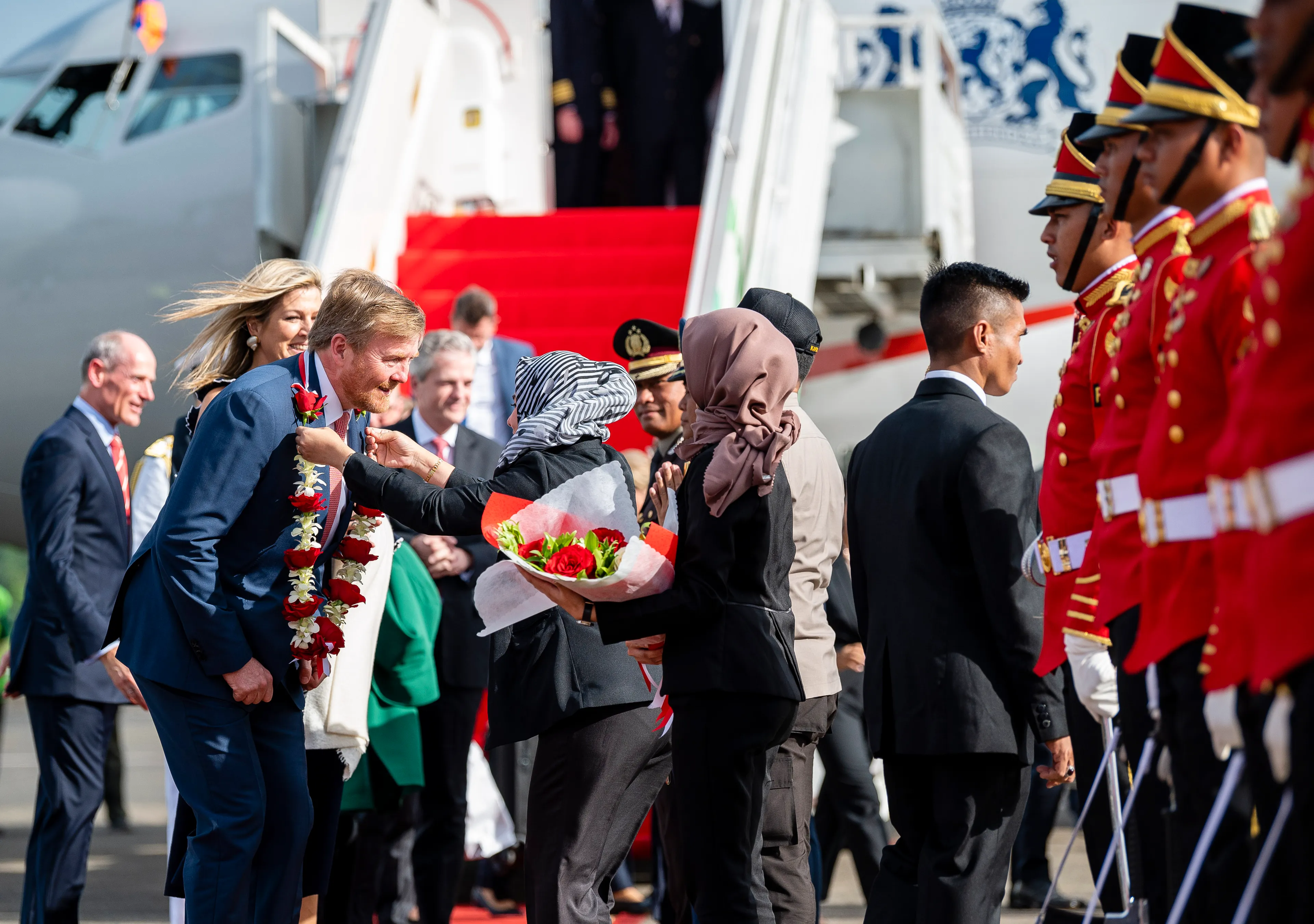 Het regeringstoestel is geland op het vliegveld van Jakarta. Op de beelden is te zien dat koning Willem-Alexander een bloemenkrans om de nek draagt, een teken van vriendschap. Koningin Máxima is gekleed in een donkerblauwe jurk van Oscar de La Renta, met open mouwen. De koningin droeg deze jurk eerder tijdens een bijeenkomst van de G20 in Buenos Aires in 2018.