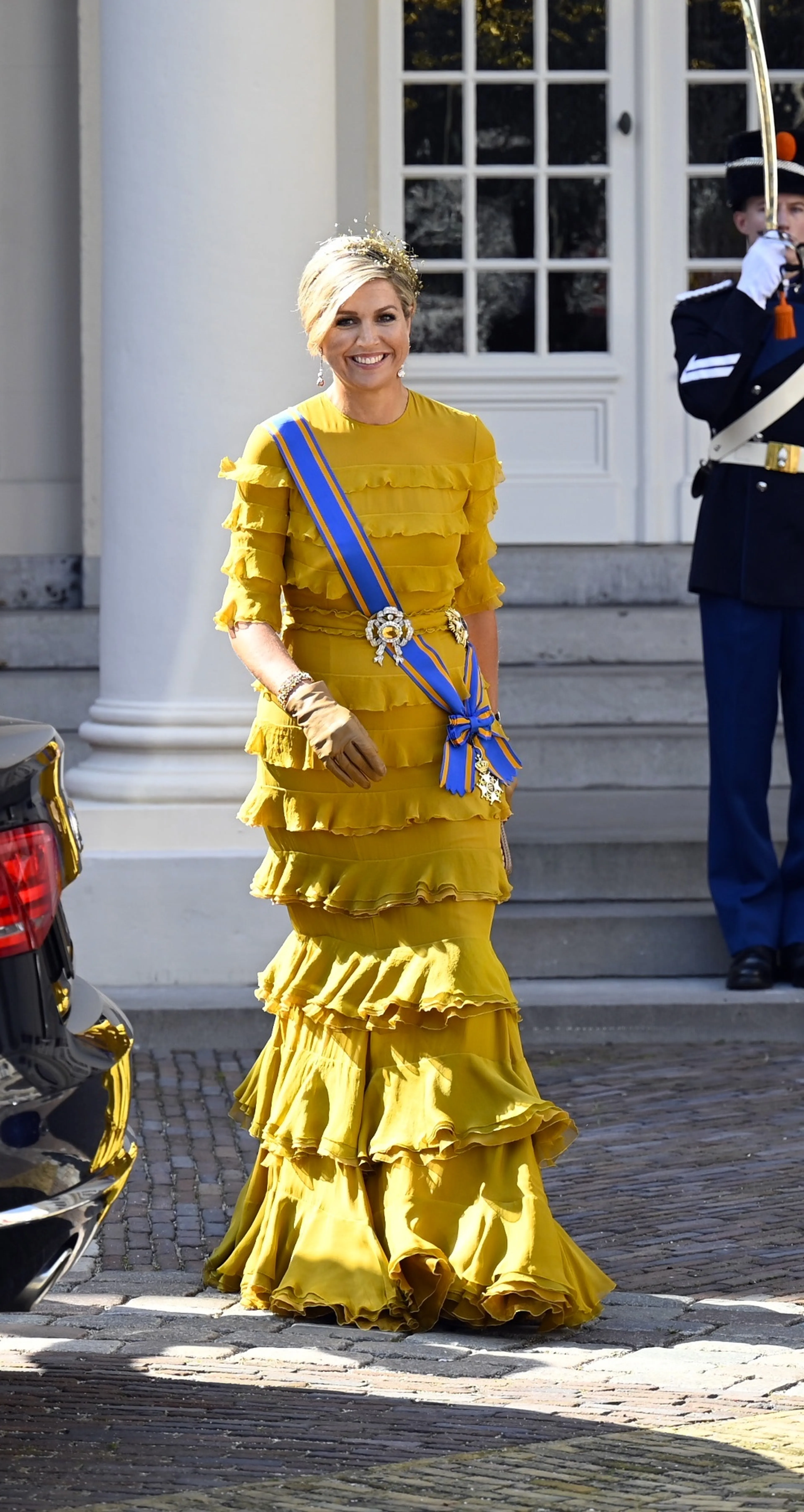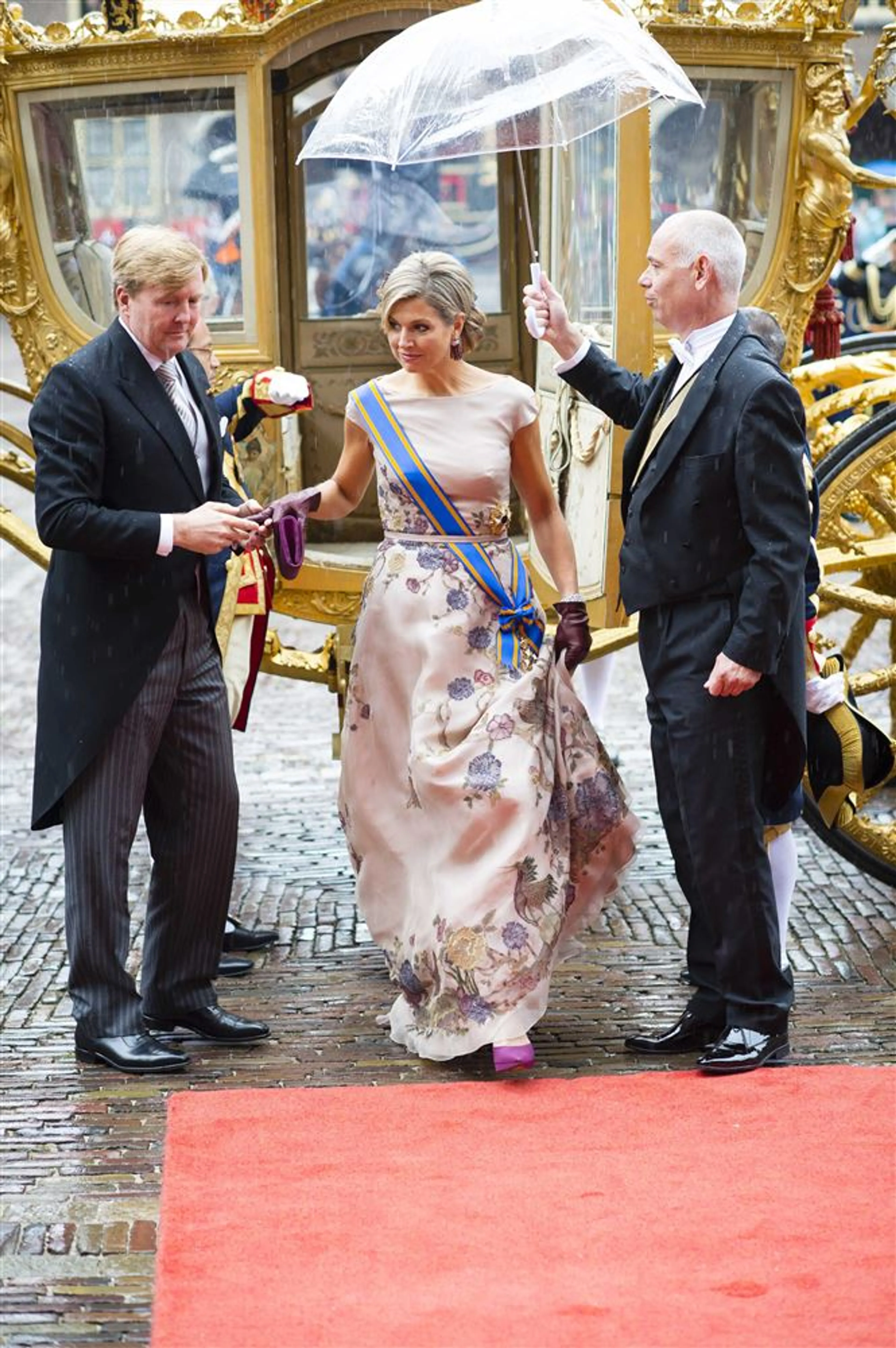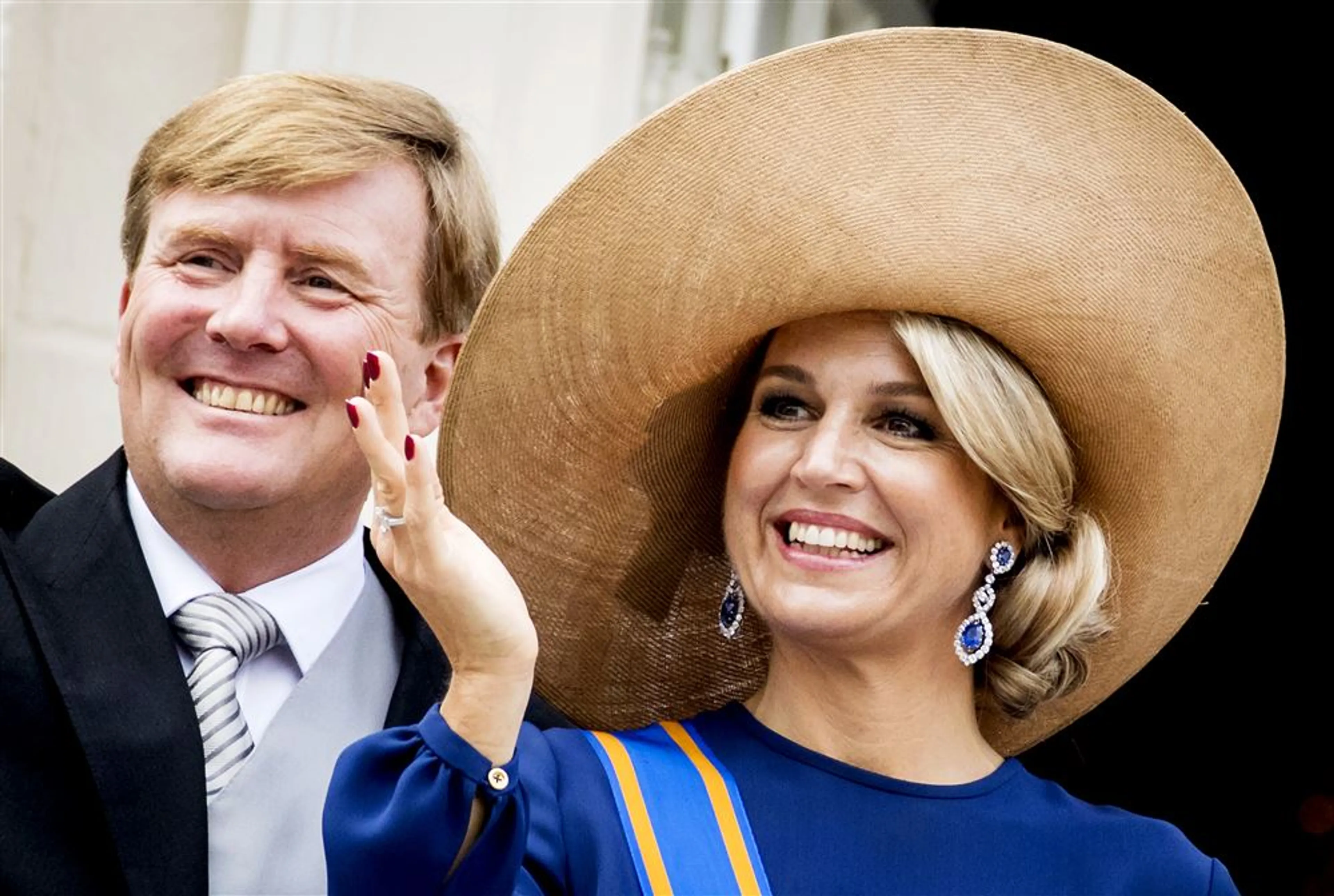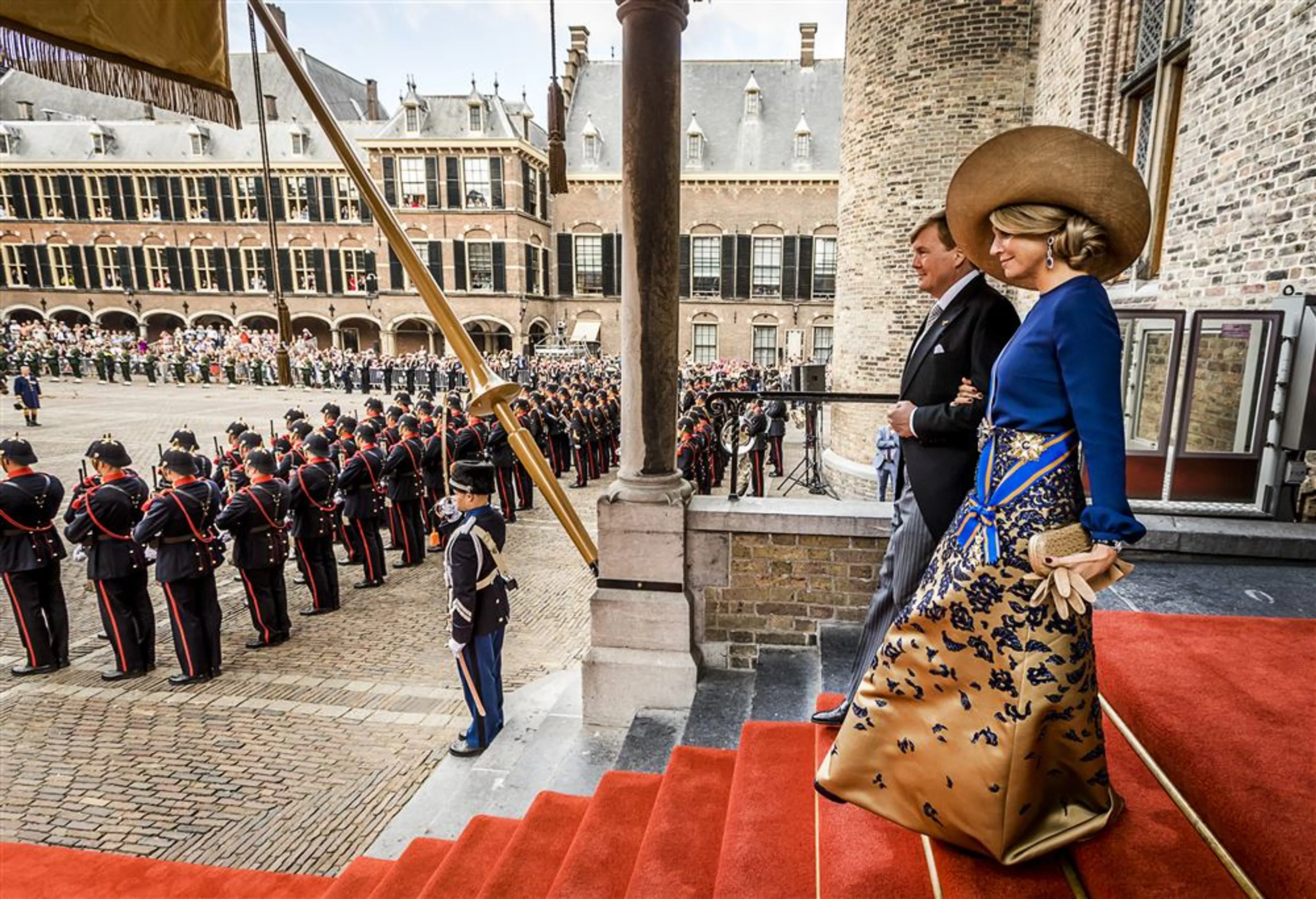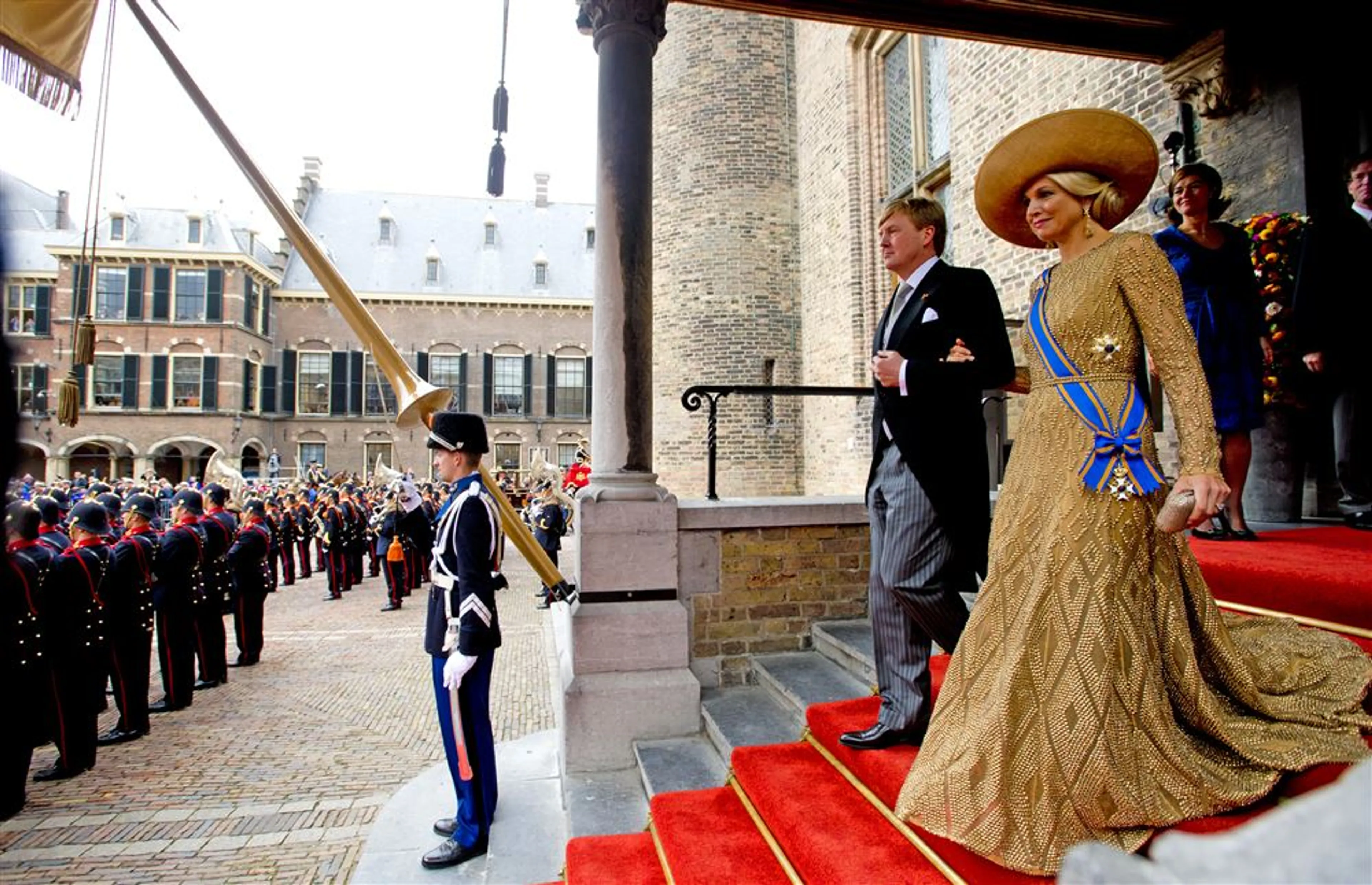 Tijdens de inhuldiging van koning Willem-Alexander straalt Máxima in een koningsblauwe japon van de Nederlandse couturier Jan Taminiau. Ook op haar eerste Prinsjesdag als koningin kiest ze voor een ontwerp van zijn hand. Máxima pakt flink uit met een goudkleurige japon en grote hoed.