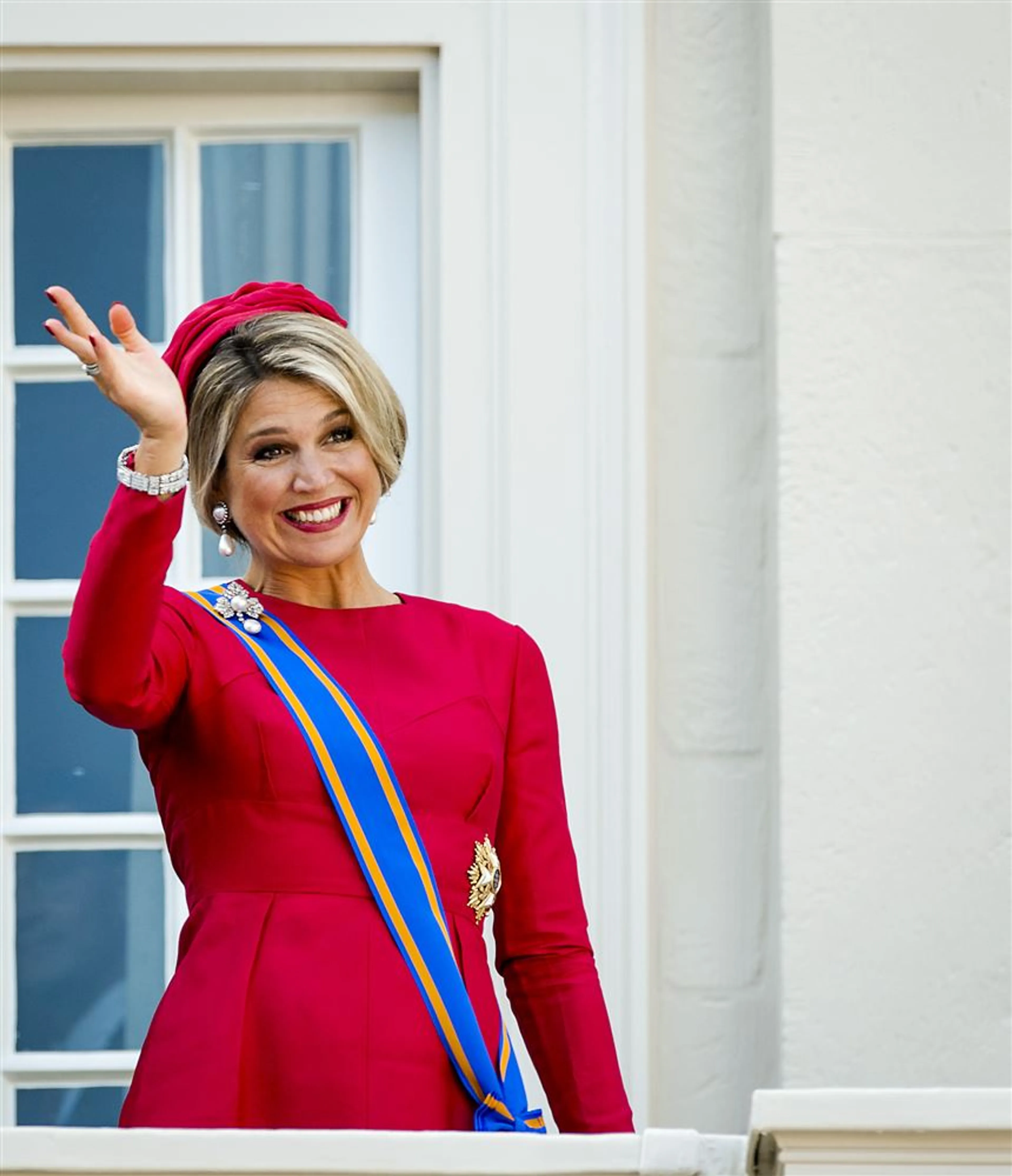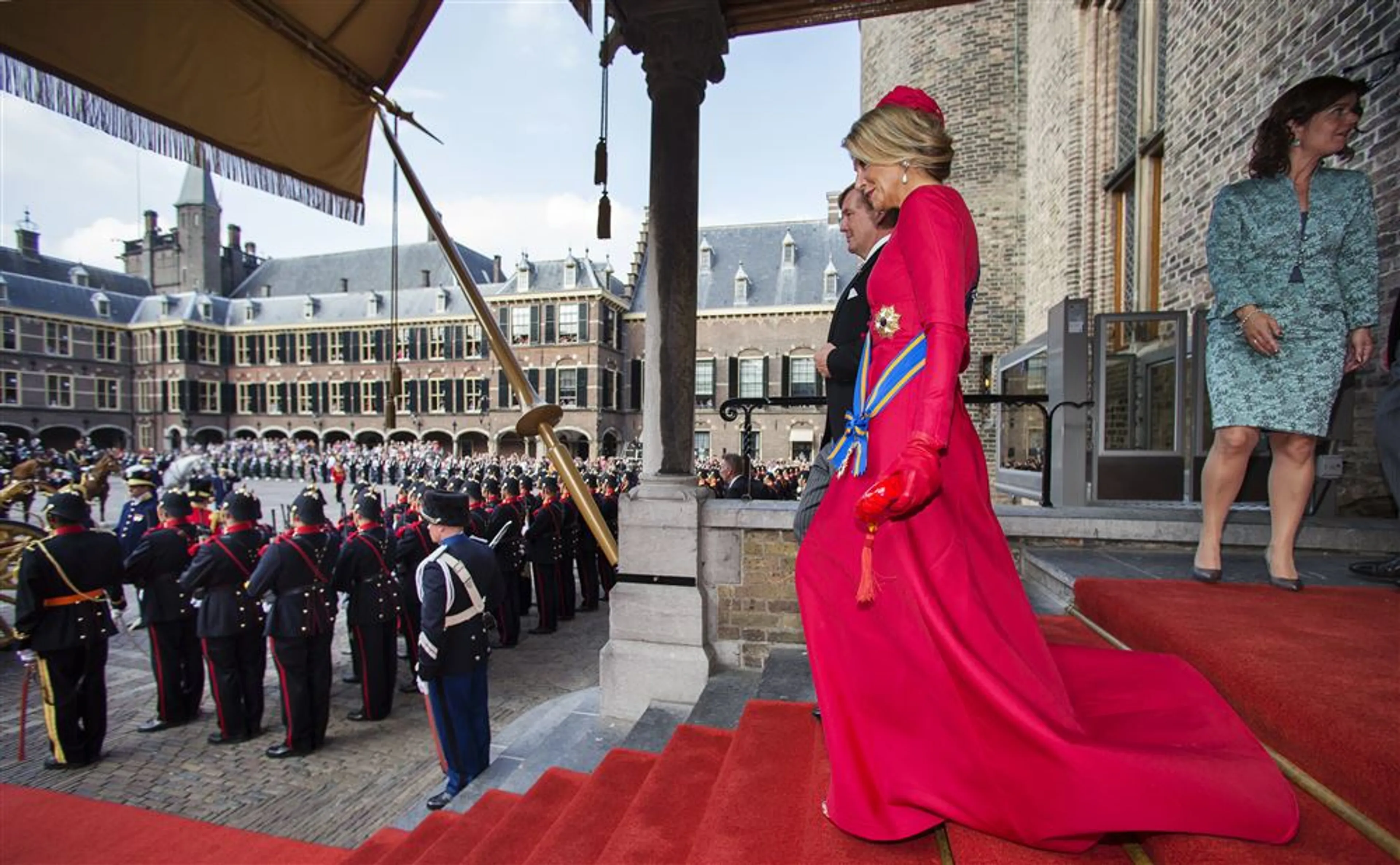 Koningin Máxima draagt in 2014 een knalrode japon van het Italiaanse modehuis Valentino. Op haar hoofd draagt zij een 'bibi' (klein hoedje) van haar favoriete hoedenontwerpster Fabienne Delvigne.