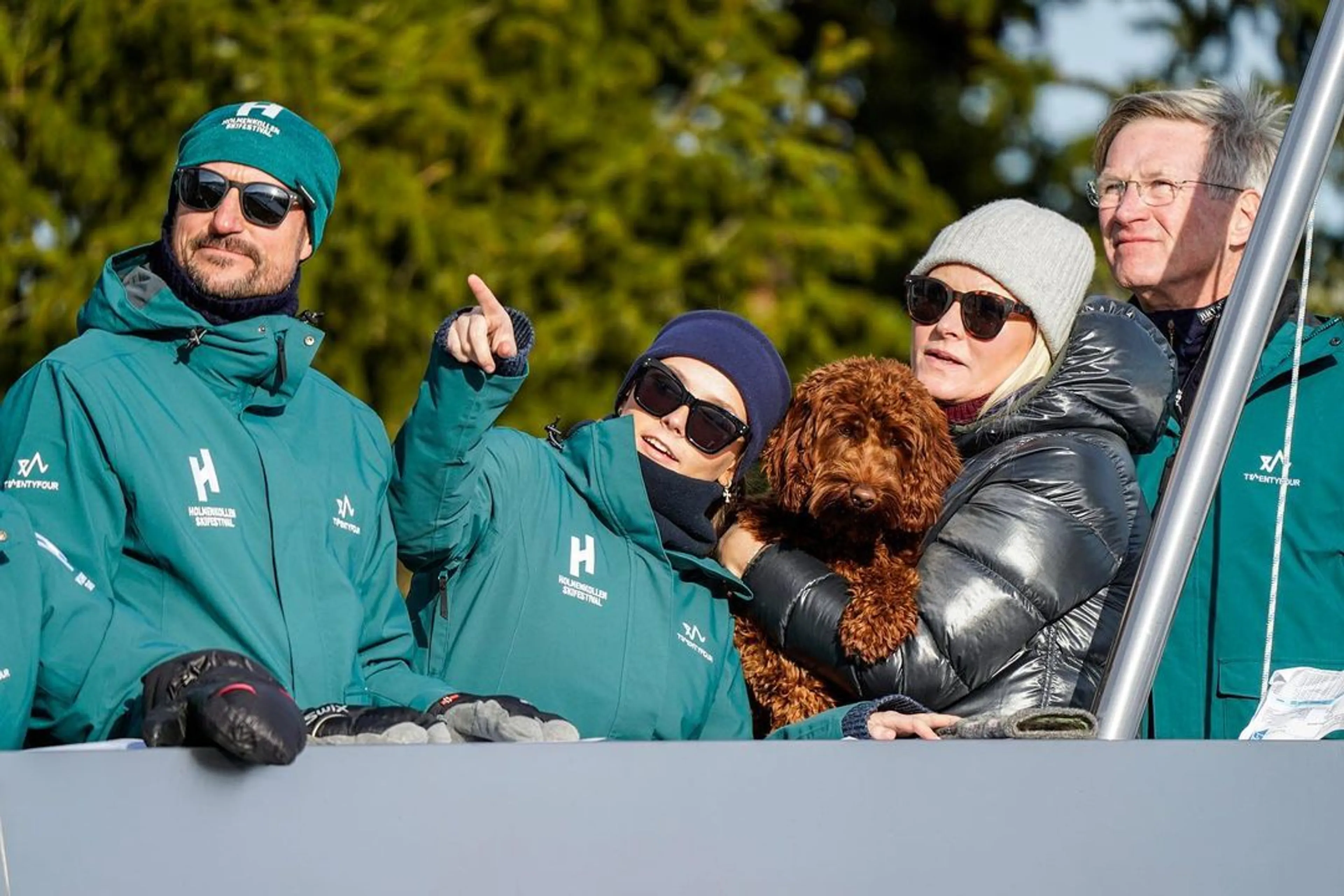 Hij werd vergezeld door koningin Sonja, kroonprins Haakon, kroonprinses Mette-marit, prinses Alexandra en prinses Astrid. Ook Labradoodle Molly Fiskebolle mocht mee naar het sportevenement.