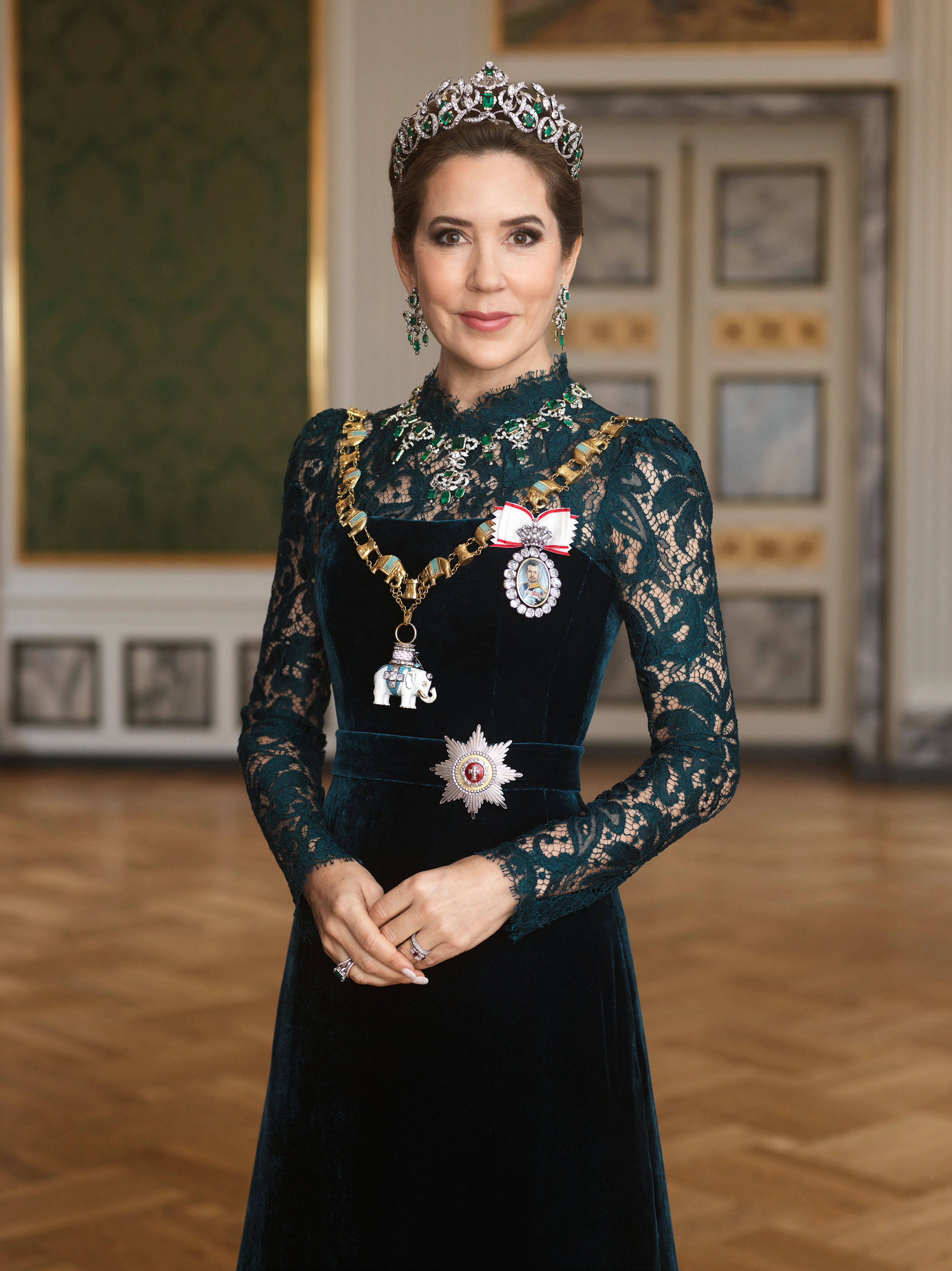 Op het portret draagt koningin Mary voor het eerst de kroonjuwelen. Het betreft de smaragdgroene set met tiara, ketting, oorbellen en een grote broche die in drie delen kan worden verdeeld. De smaragdgroene set is een van de vier sieradensets of garnituren die ter beschikking staan van de koningin van Denemarken en die gewoonlijk worden tentoongesteld in de schatkamer van kasteel Rosenborg.