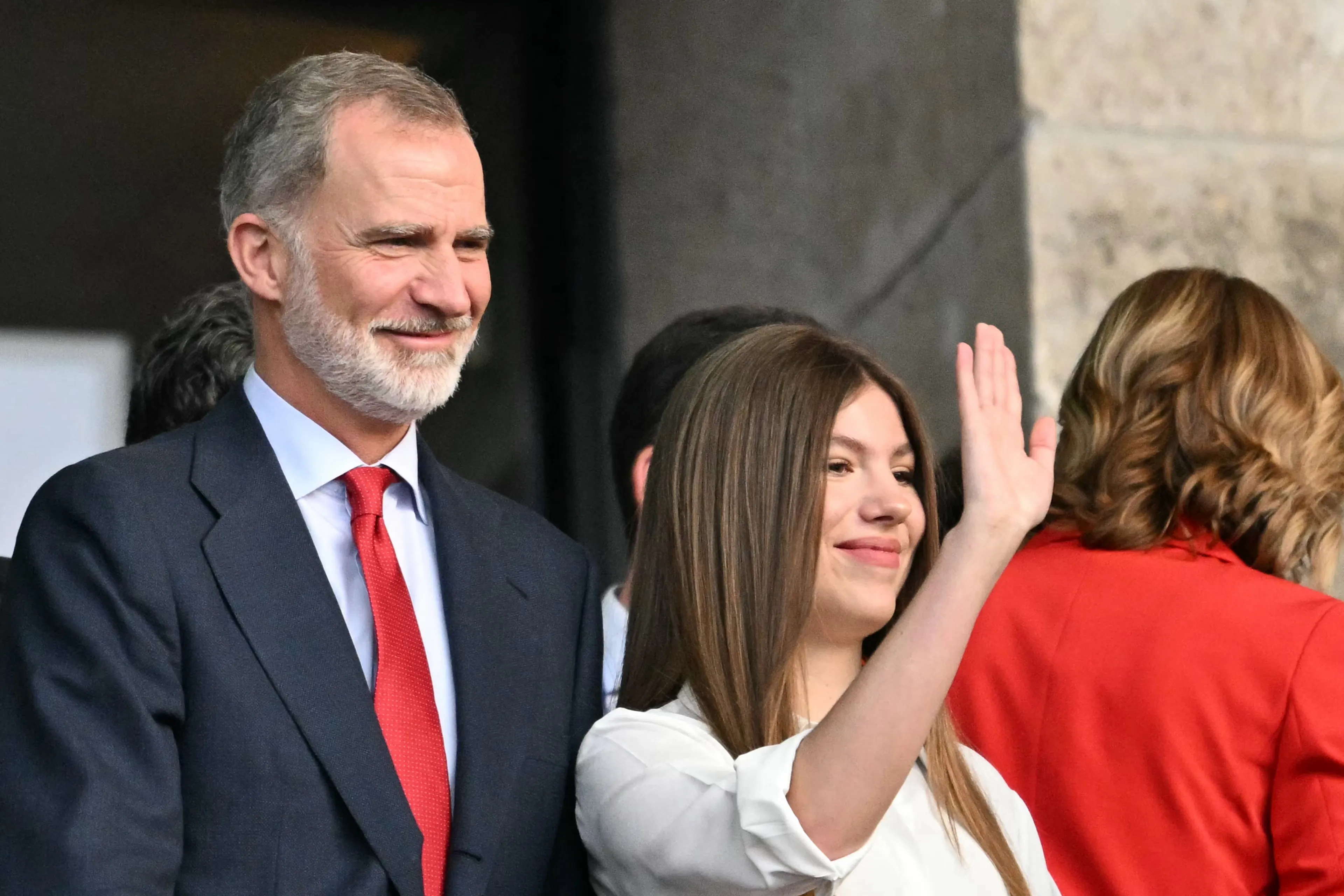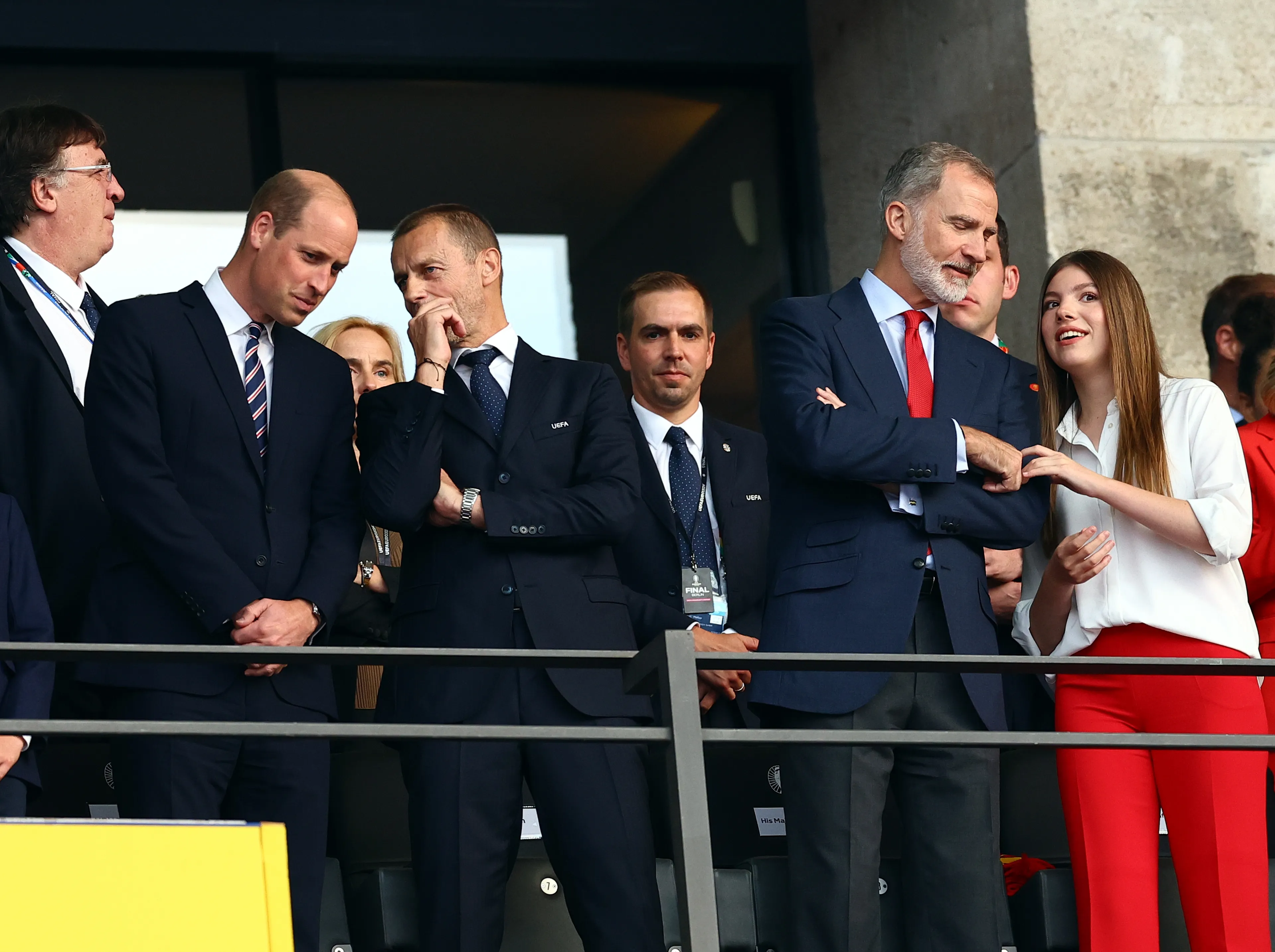 Koning Felipe en prins William waren gisteren allebei niet alleen naar Berlijn gereisd. Koning Felipe nam zijn dochter prinses Sofía mee. Voor de gelegenheid droeg zij een vuurrode pantalon met een witte top. De keuze voor de kleur van de pantalon zal ongetwijfeld iets te maken hebben gehad met de kleur van het Spaanse elftal: rood. En ook de das van koning Felipe was toepasselijk gekozen.