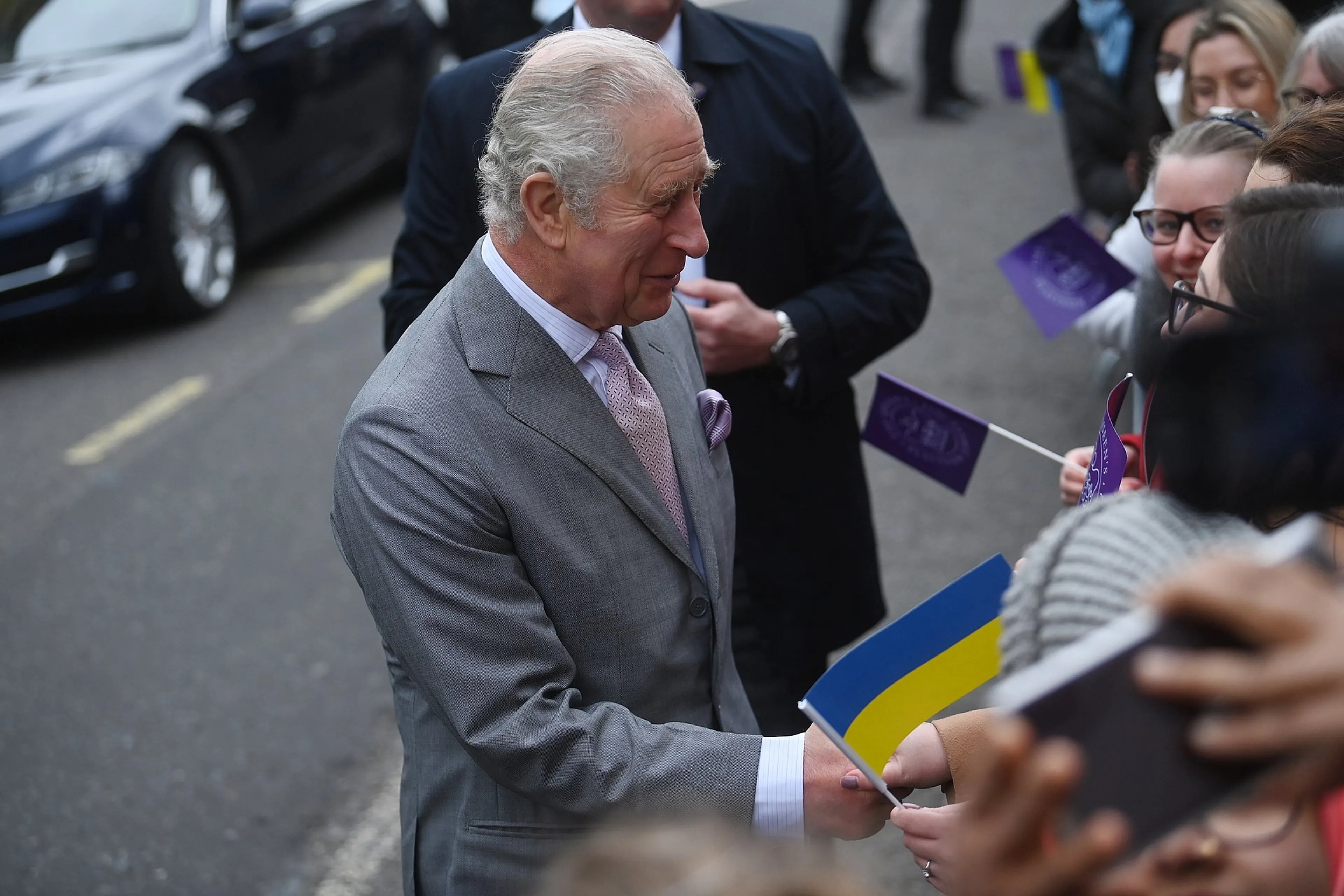Prins Charles heeft donderdag een bezoek gebracht aan de stad Winchester. Daar werd hij opgewacht door fans die massaal wapperden met Oekraïense vlaggetjes.