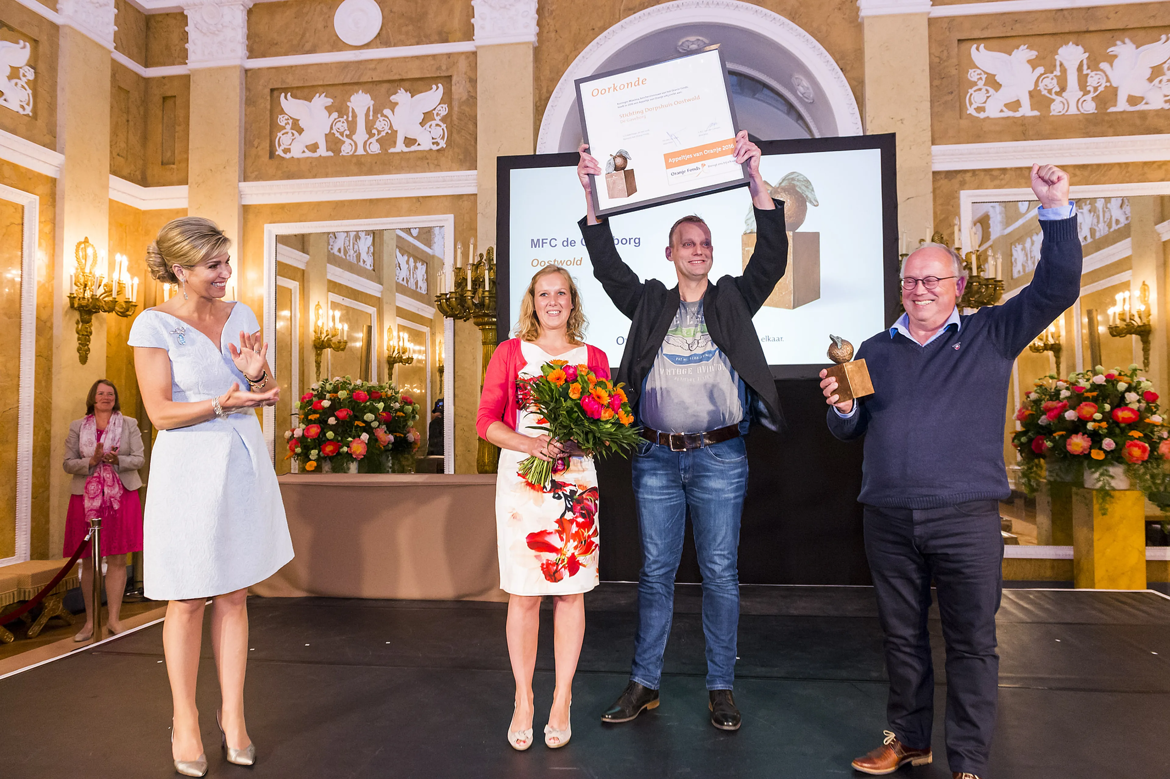 In 2016 reikt koningin Máxima op Paleis Noordeinde de Appeltjes van Oranje uit aan Stichting Dorpshuis Oostwold. De jurk is van modehuis Natan.