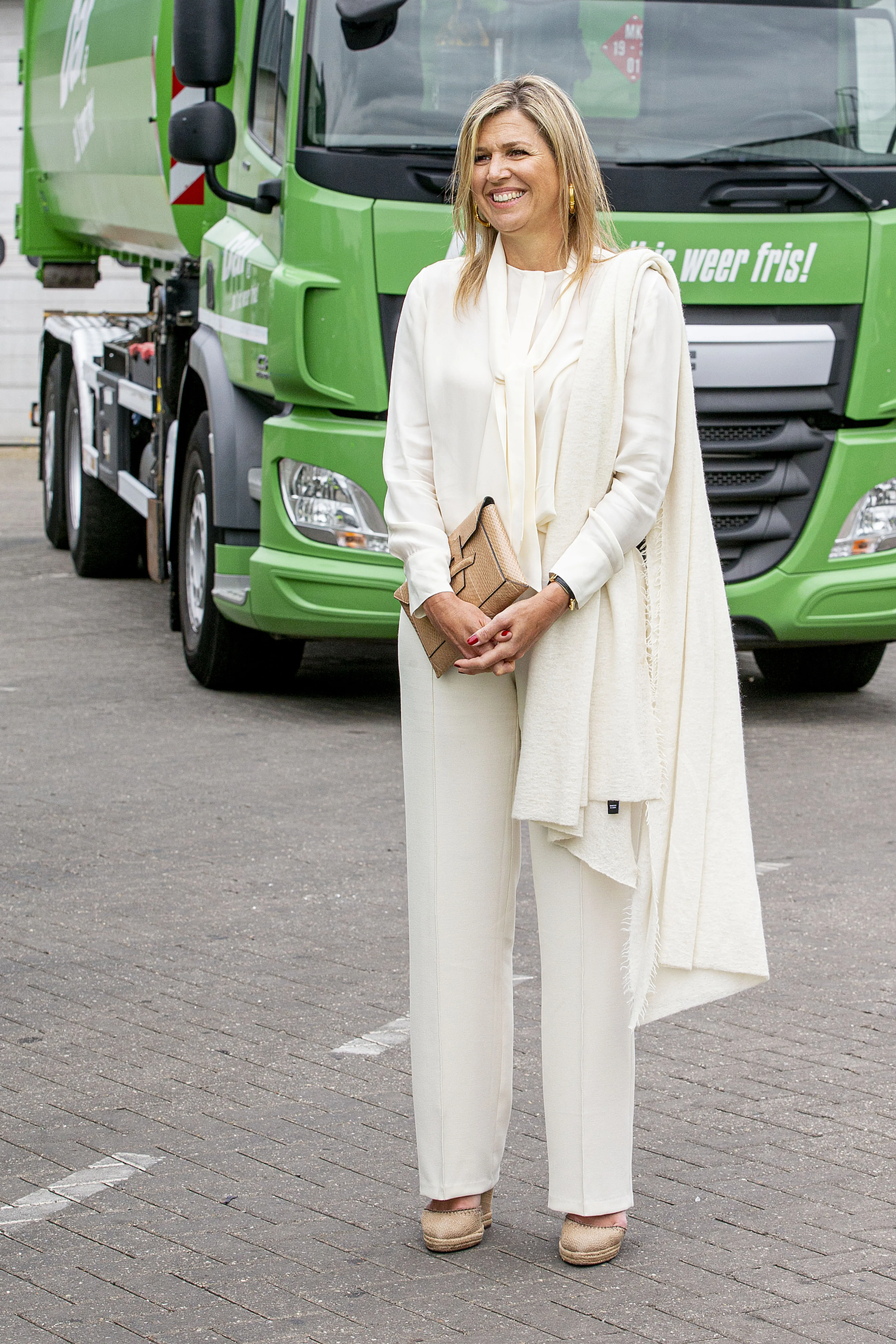 2020: Máxima in ton sur ton wit tijdens een bezoek aan de milieustraat van Dar in Nijmegen.