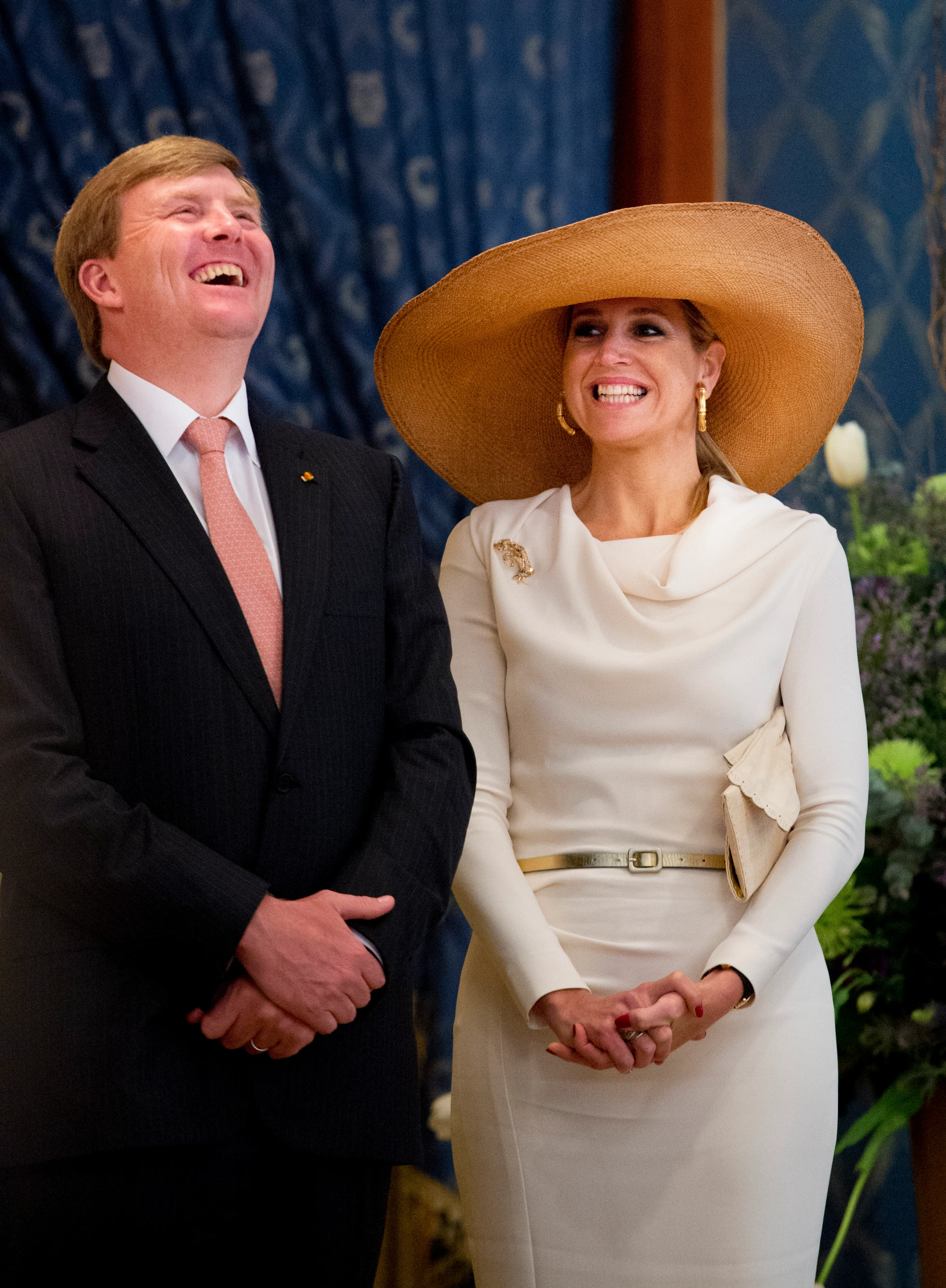 Koning Willem-Alexander en koningin Máxima tijdens een streekbezoek aan de Achterhoek in 2014. Máxima combineert haar witte rok met een crèmekleurige blouse.