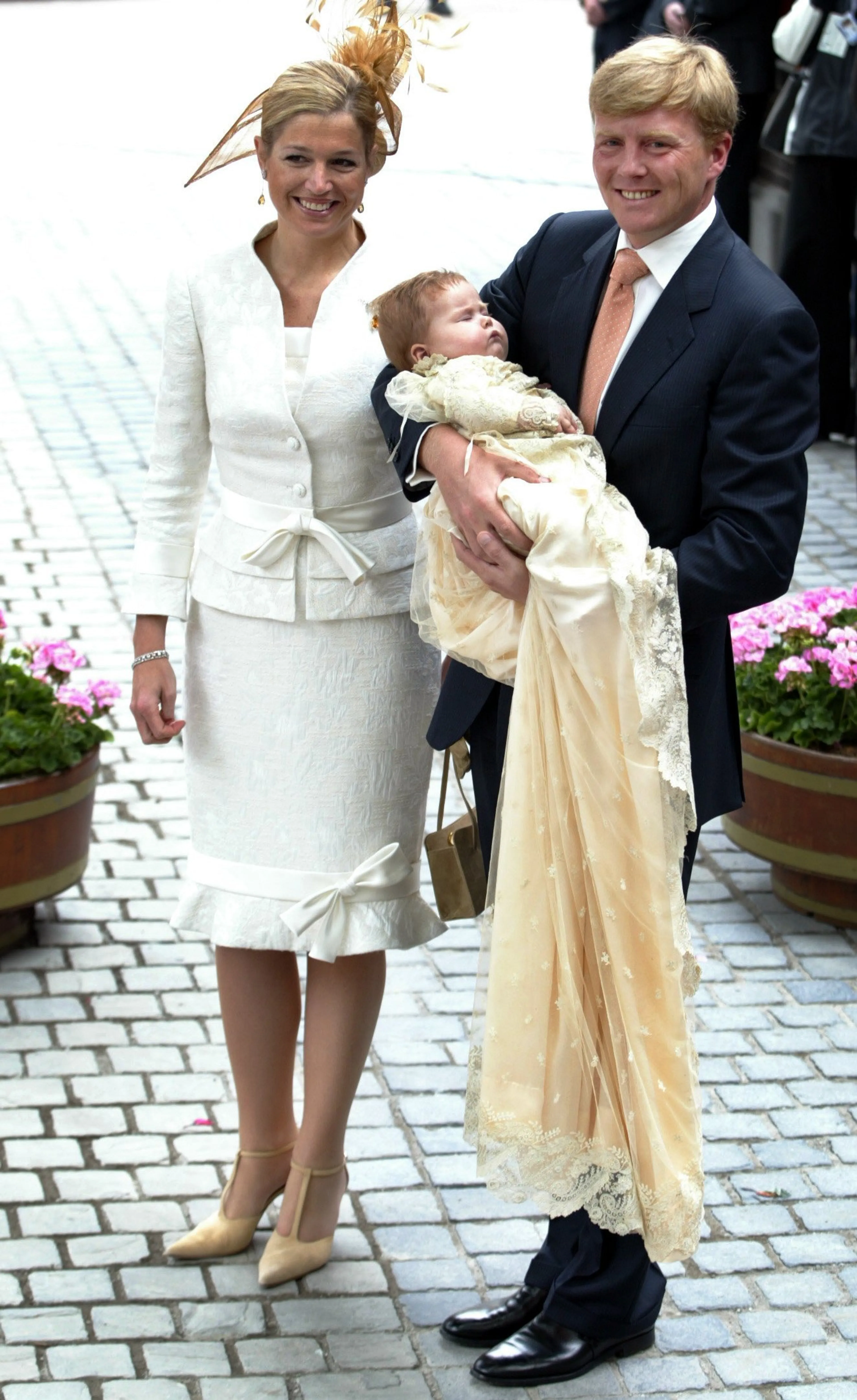 In 2004 wordt de kleine Amalia gedoopt in de Grote Kerk in Den Haag. Máxima kiest voor een wit mantelpakje met strikdetails.