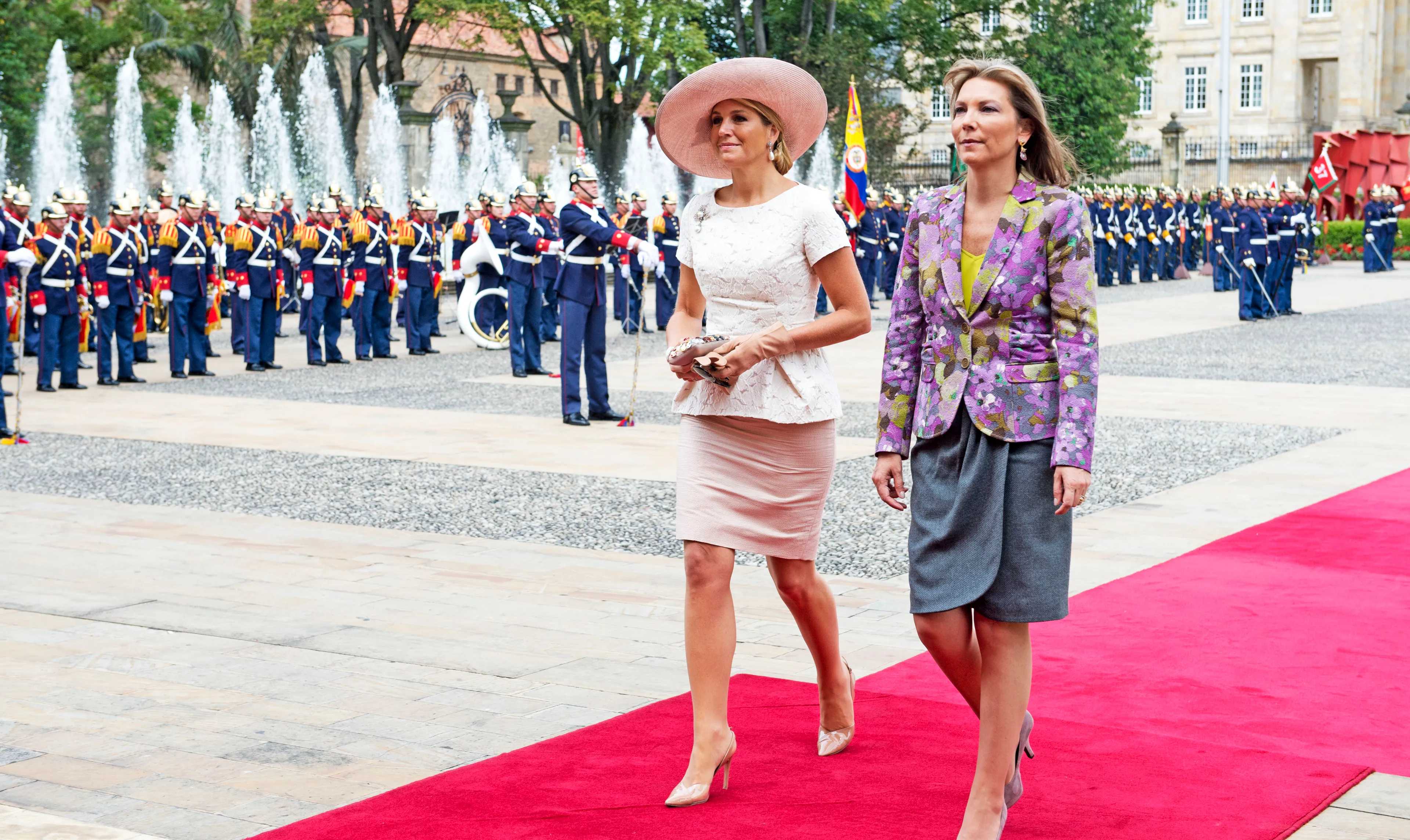 In 2013 wordt koningin Máxima ontvangen door Maria Clemencia Rodriguez, de echtgenote van president Juan Manuel Santos, bij het presidentieel paleis Casa de Narino in Bogota. Ze is in Colombia voor een kort kennismakingsbezoek.
