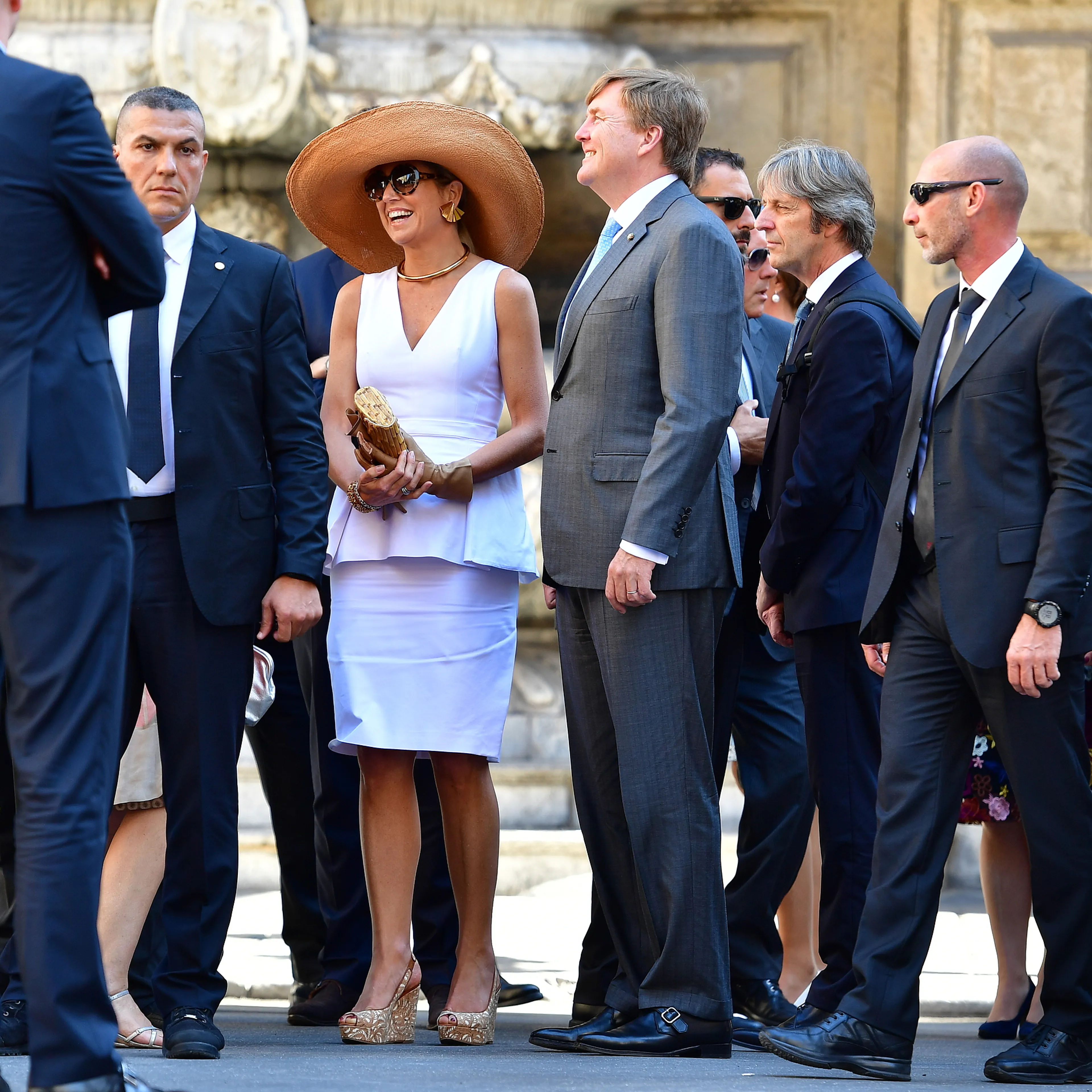 In 2017 geniet Máxima van de zon in de Siciliaanse hoofdstad Palermo. Ze combineert een witte jurk met haar trademark hoed en hoge sleehakken.