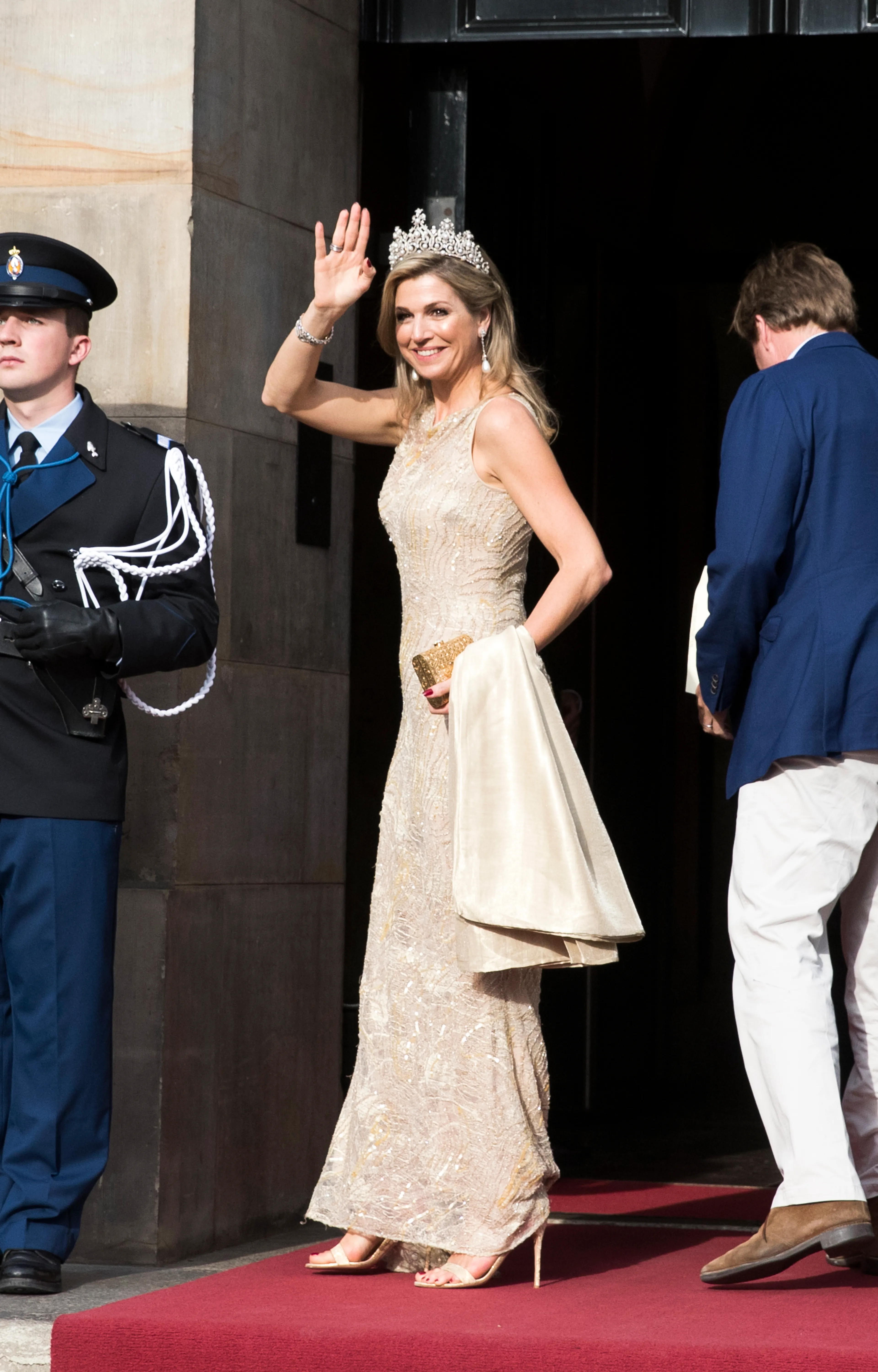 Koningin Máxima arriveert in 2018 bij het Paleis op de Dam voor een diner voor het Corps Diplomatique. Ze draagt de Württemberg-tiara en een prachtige galajurk. Over de kleur valt te discussiëren... Wit of crème of iets daar tussenin? Wij vinden deze jurk in ieder geval te mooi om 'm niet mee te nemen in dit artikel.