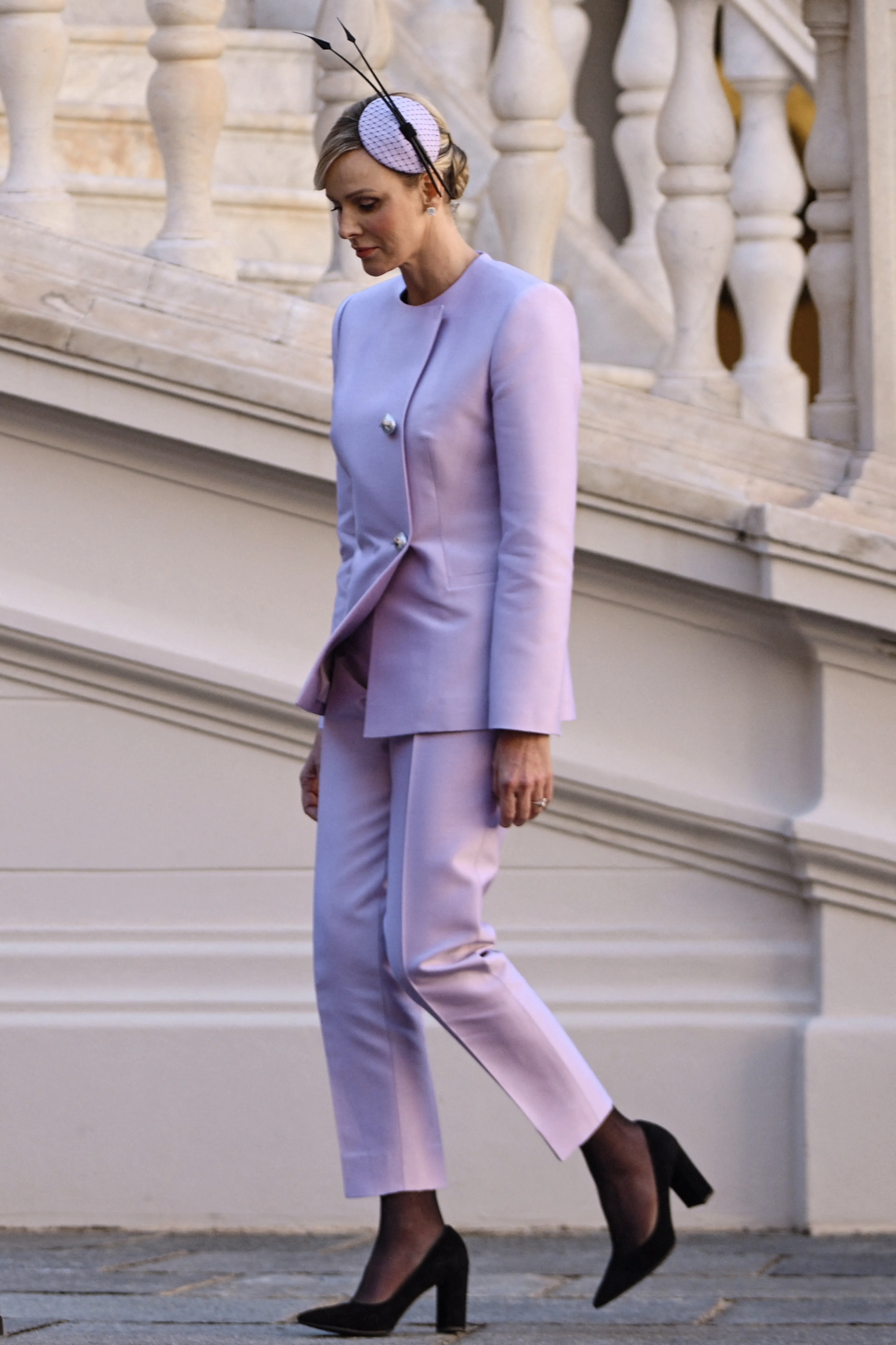 Prinses Charlène hult zich op de nationale feestdag van Monaco regelmatig in de nationale kleuren van het land: wit en rood. Maar vandaag gooit de prinses het over een andere boeg: ze draagt namelijk een poederkleurig broekpak met een glinsterende afwerking. Het pak zou een op maat gemaakt ontwerp zijn van het Franse modehuis Louis Vuitton.
