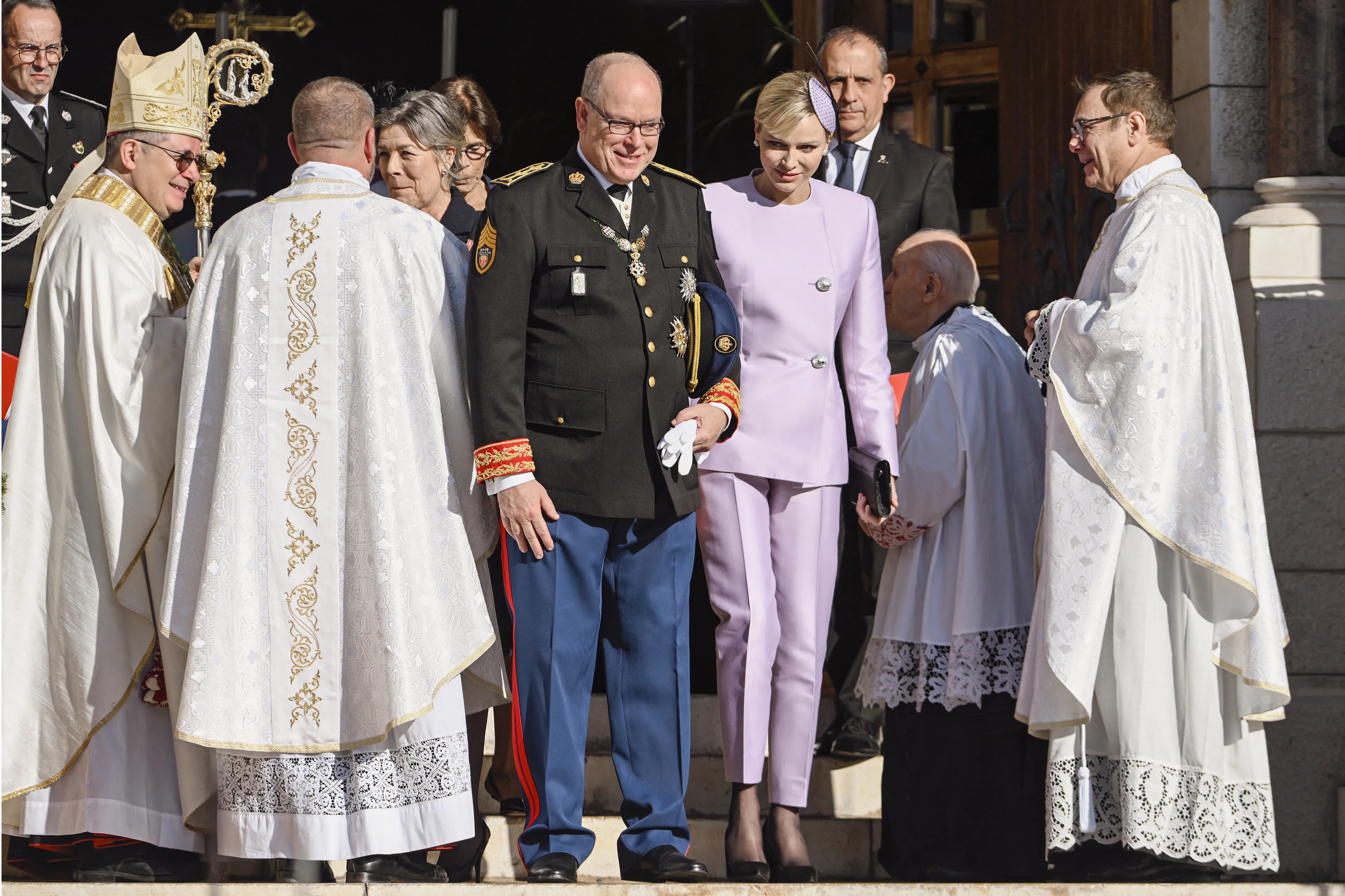 Het prinselijk paar is vandaag het stralende middelpunt tijdens Fête du Prince. In de ochtend woonden ze, zonder hun kinderen, de speciale mis bij in de Kathedraal van Monaco.