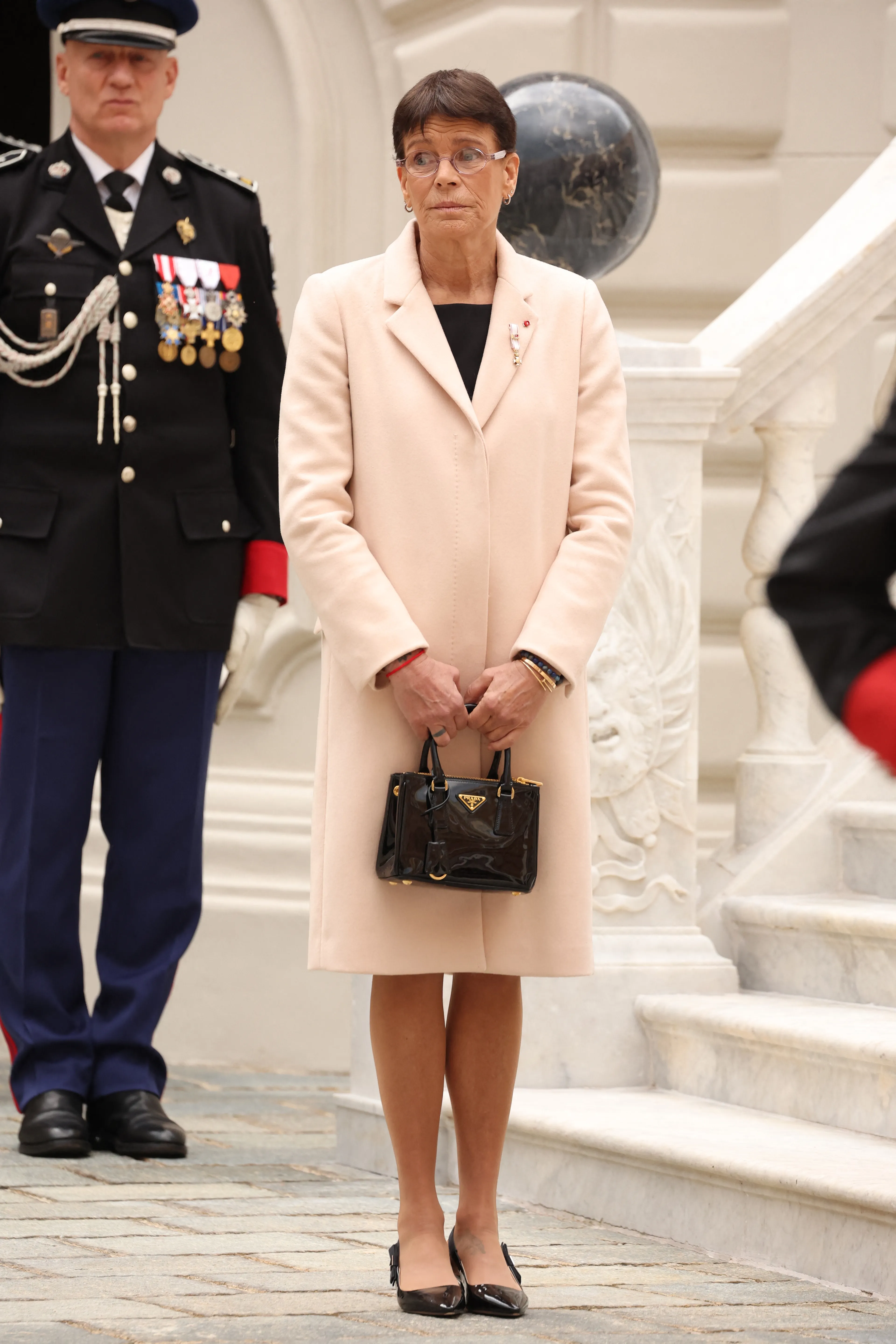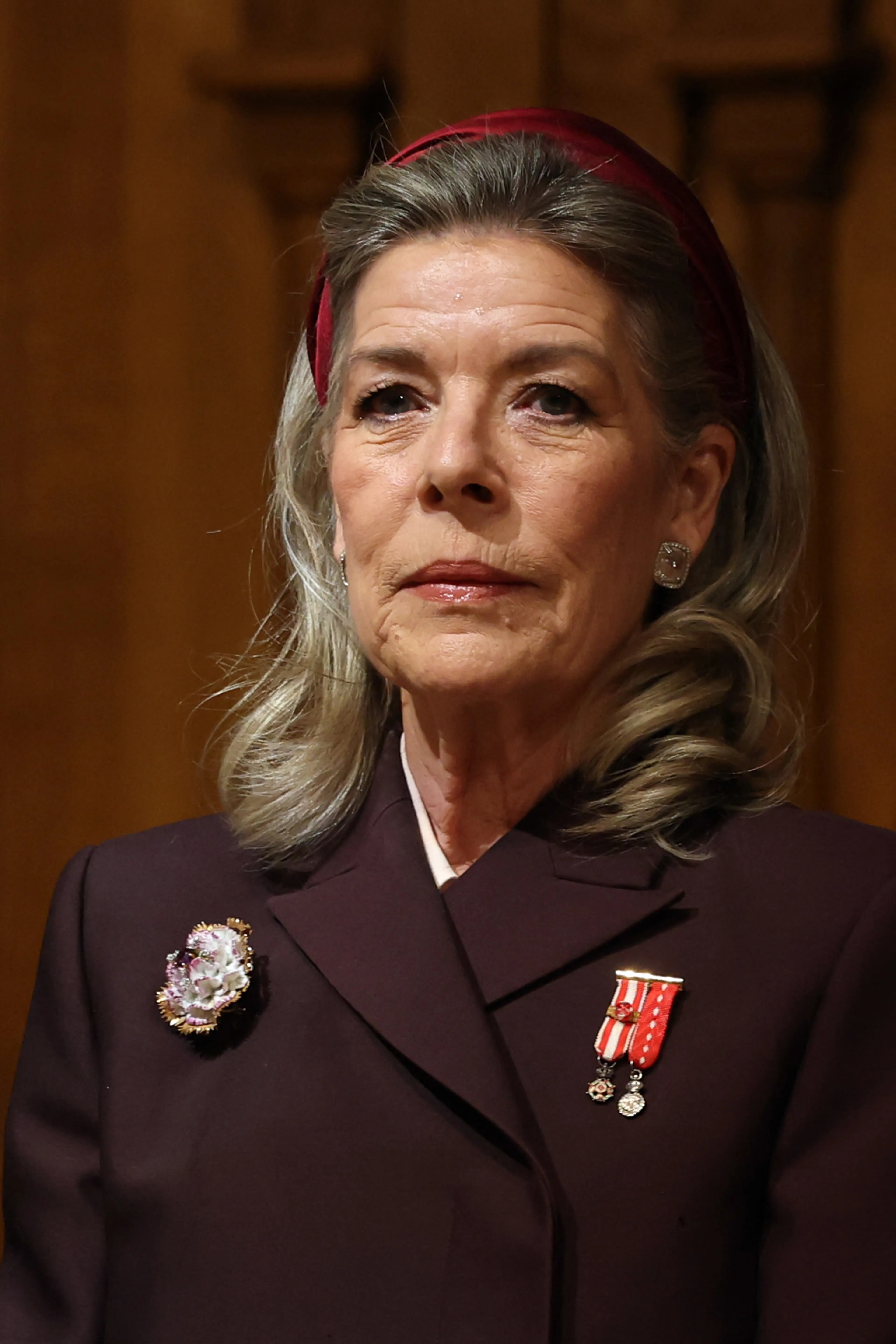 De zus van prins Albert draagt een bordeauxrode mantel van KHAITE. Ze draagt haar haren los met een rode haarband. Leuk feitje: dochter Alexandra heeft de styling van de prinses verzorgd, zo laat ze op social media weten.