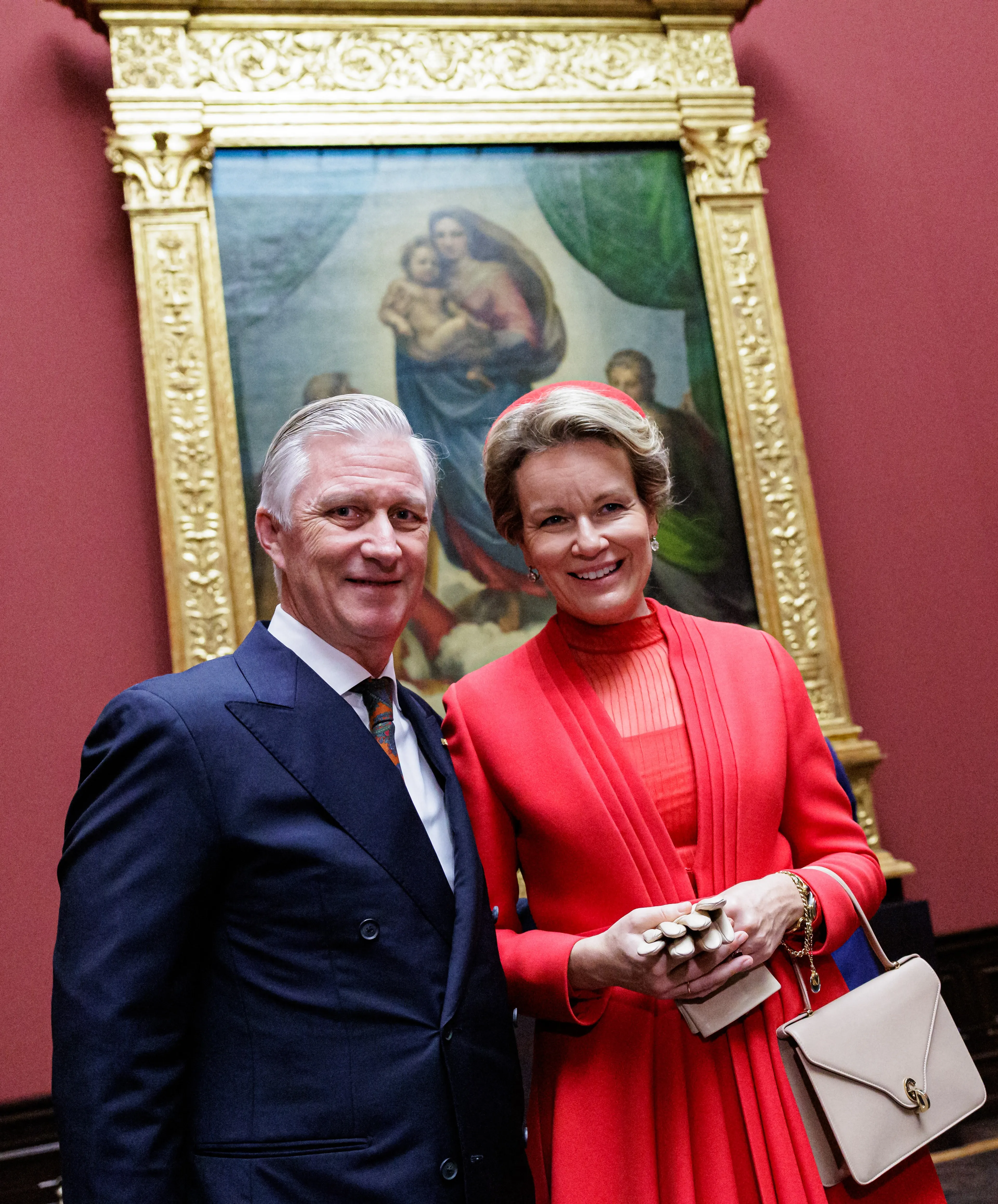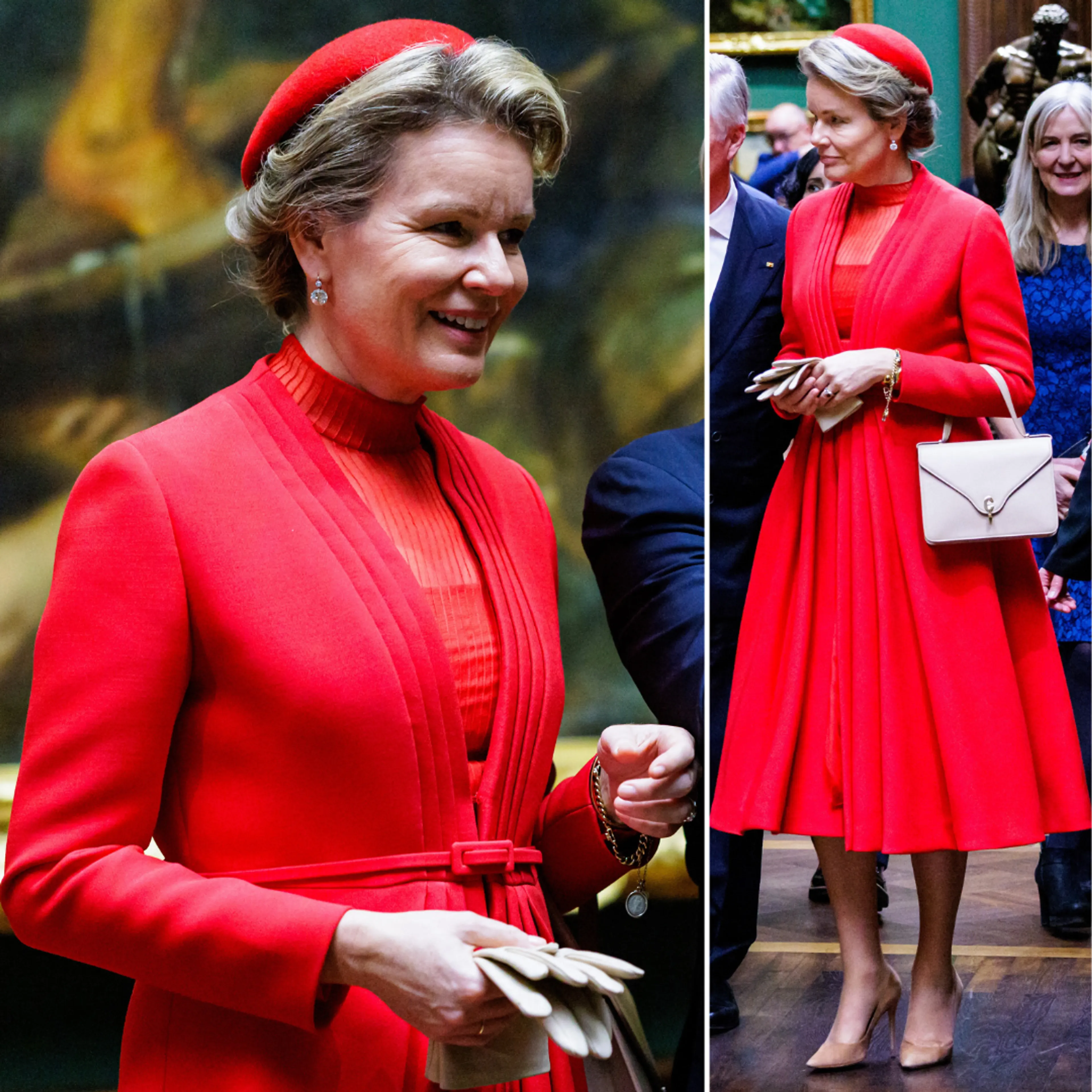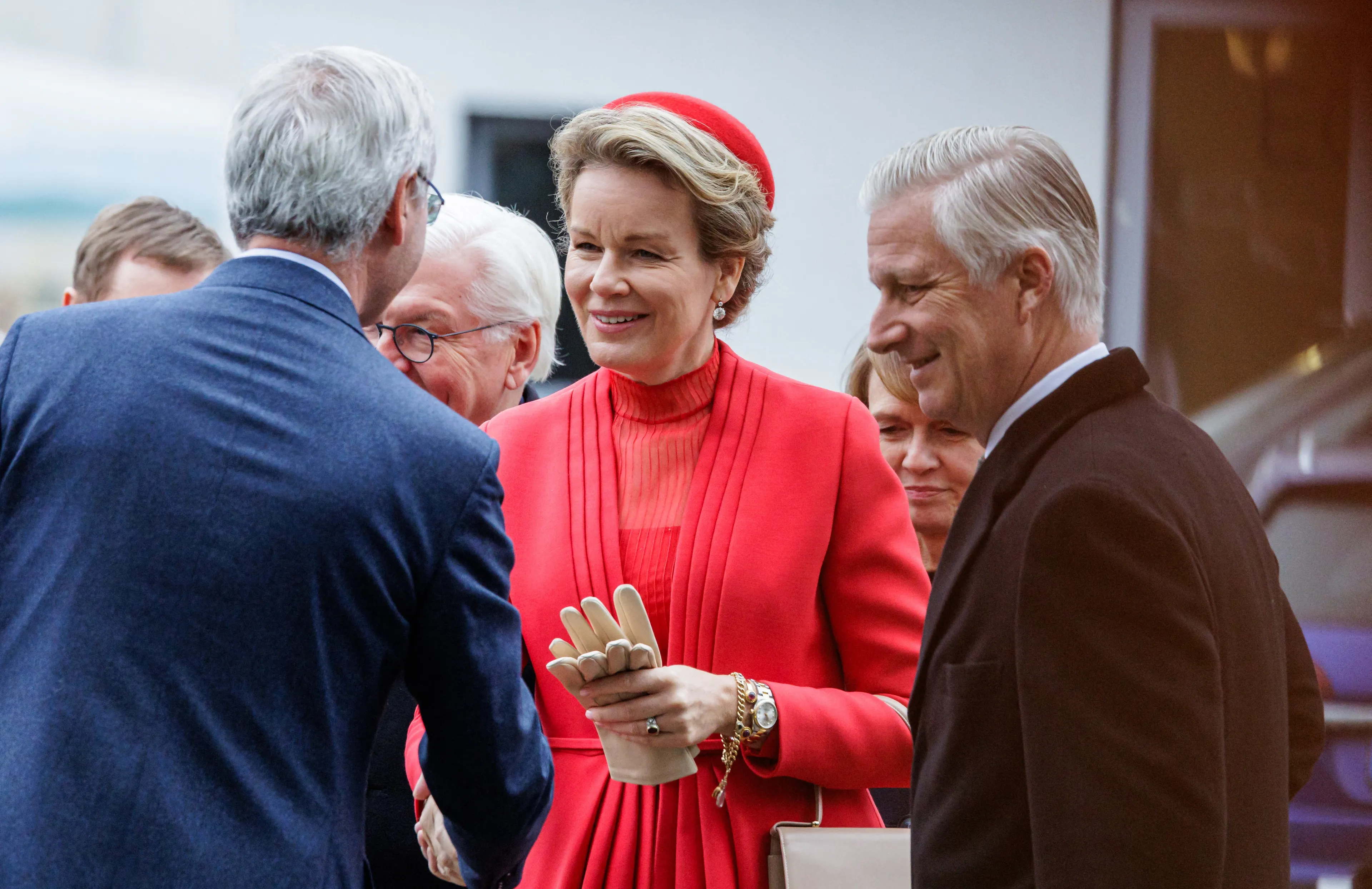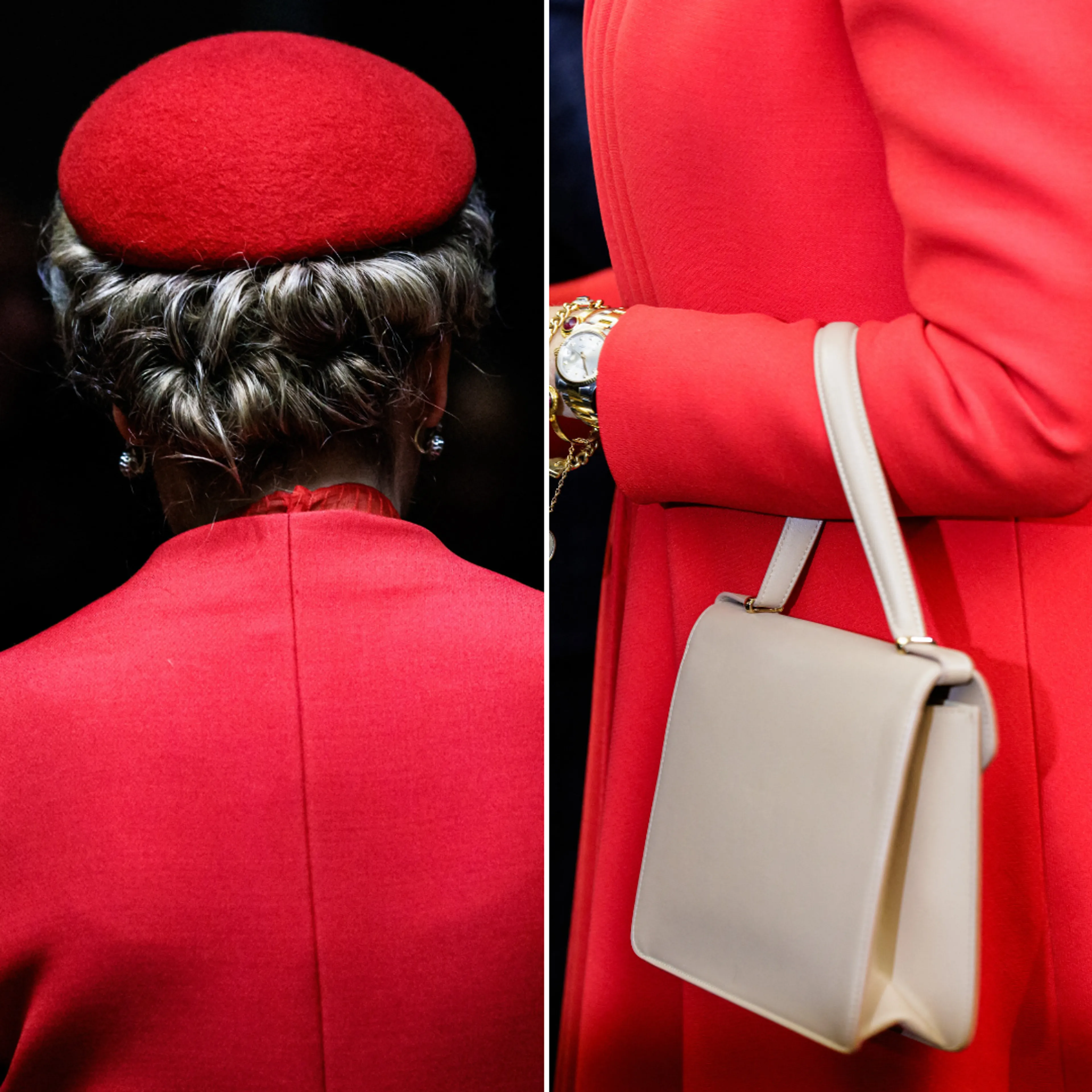 Koningin Mathilde droeg op de laatste dag van het staatsbezoek een outfit van Dior. Ook het bijpassende hoedje en de handtas zijn gekocht bij het Franse modemerk. Tegen de avond combineerde Mathilde haar rode outfit met een bruine bontjas.