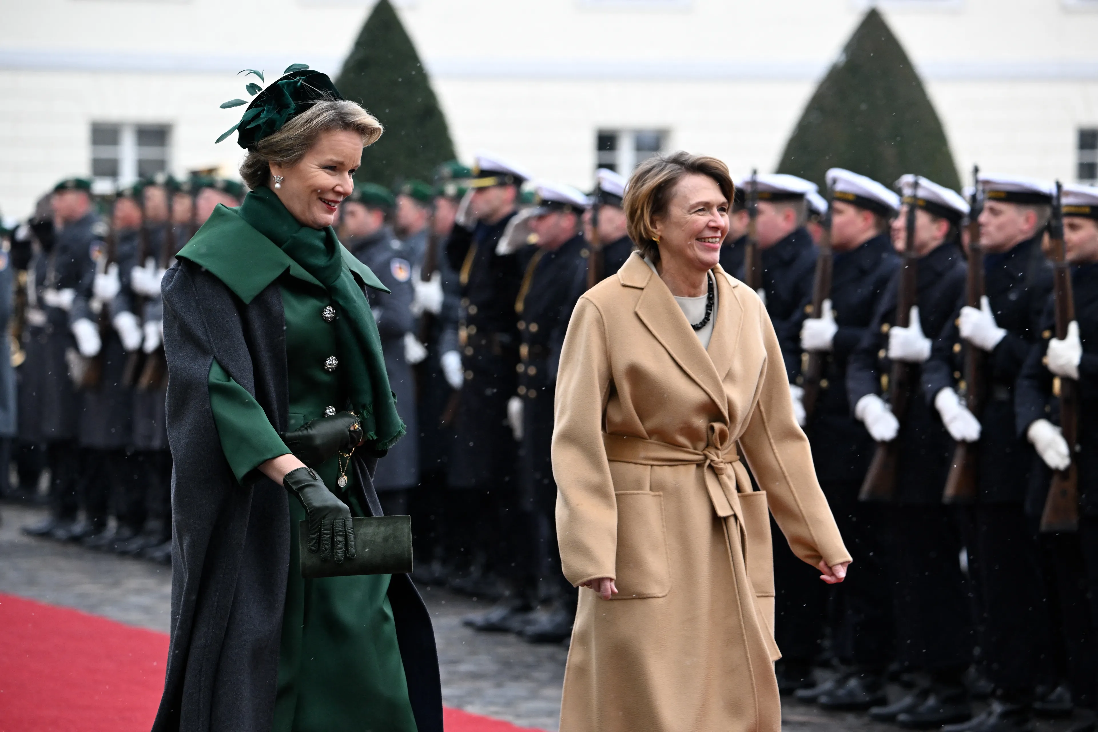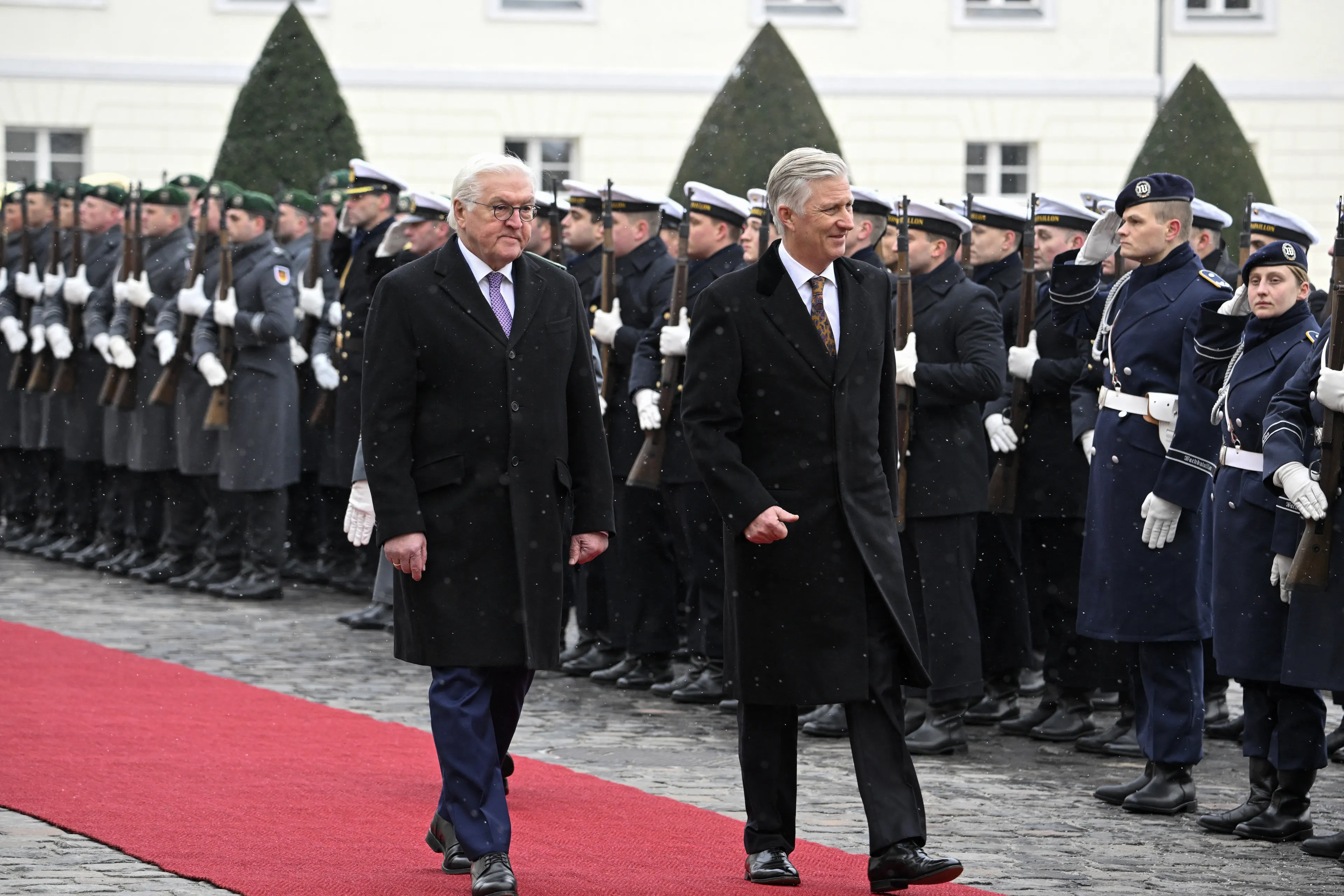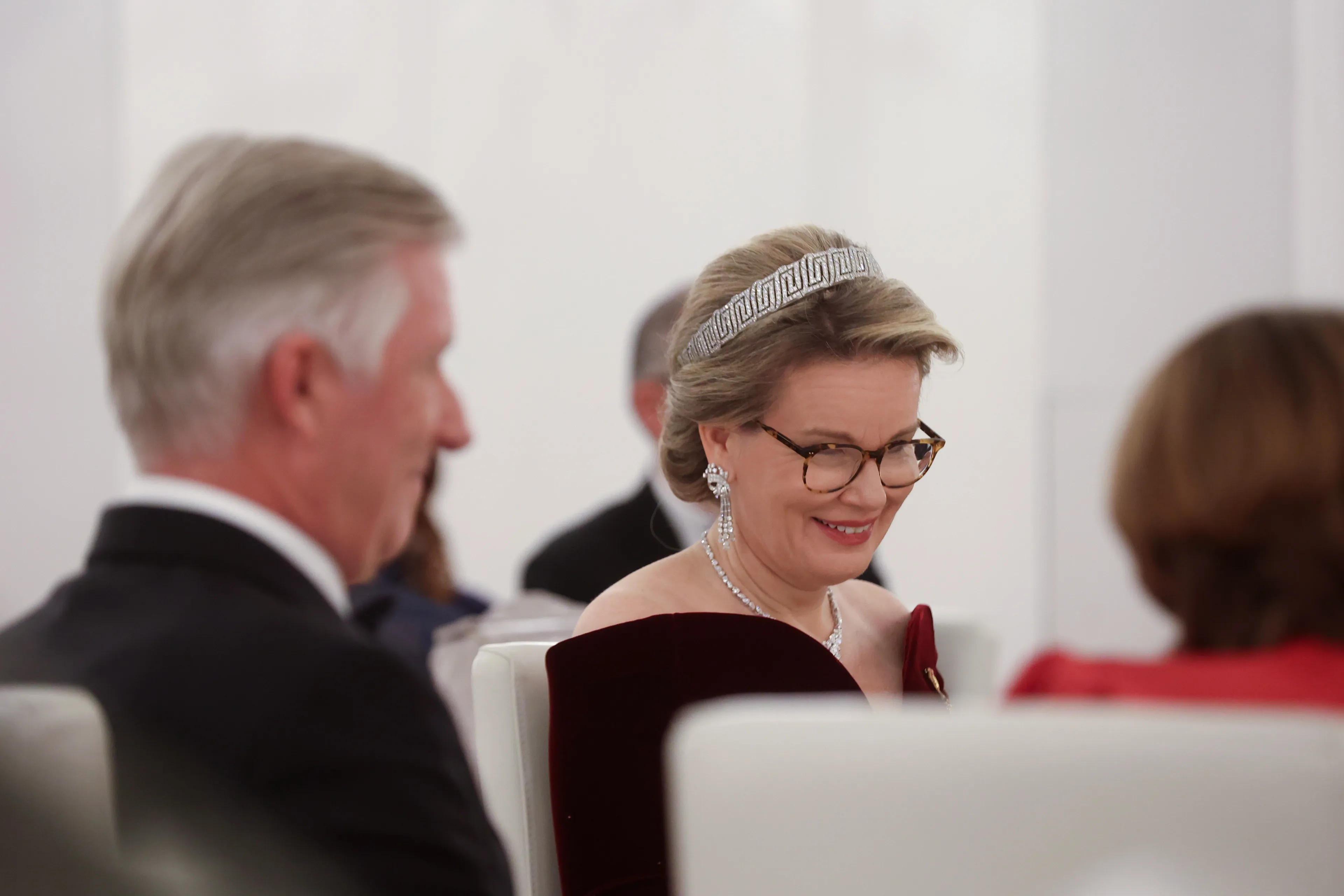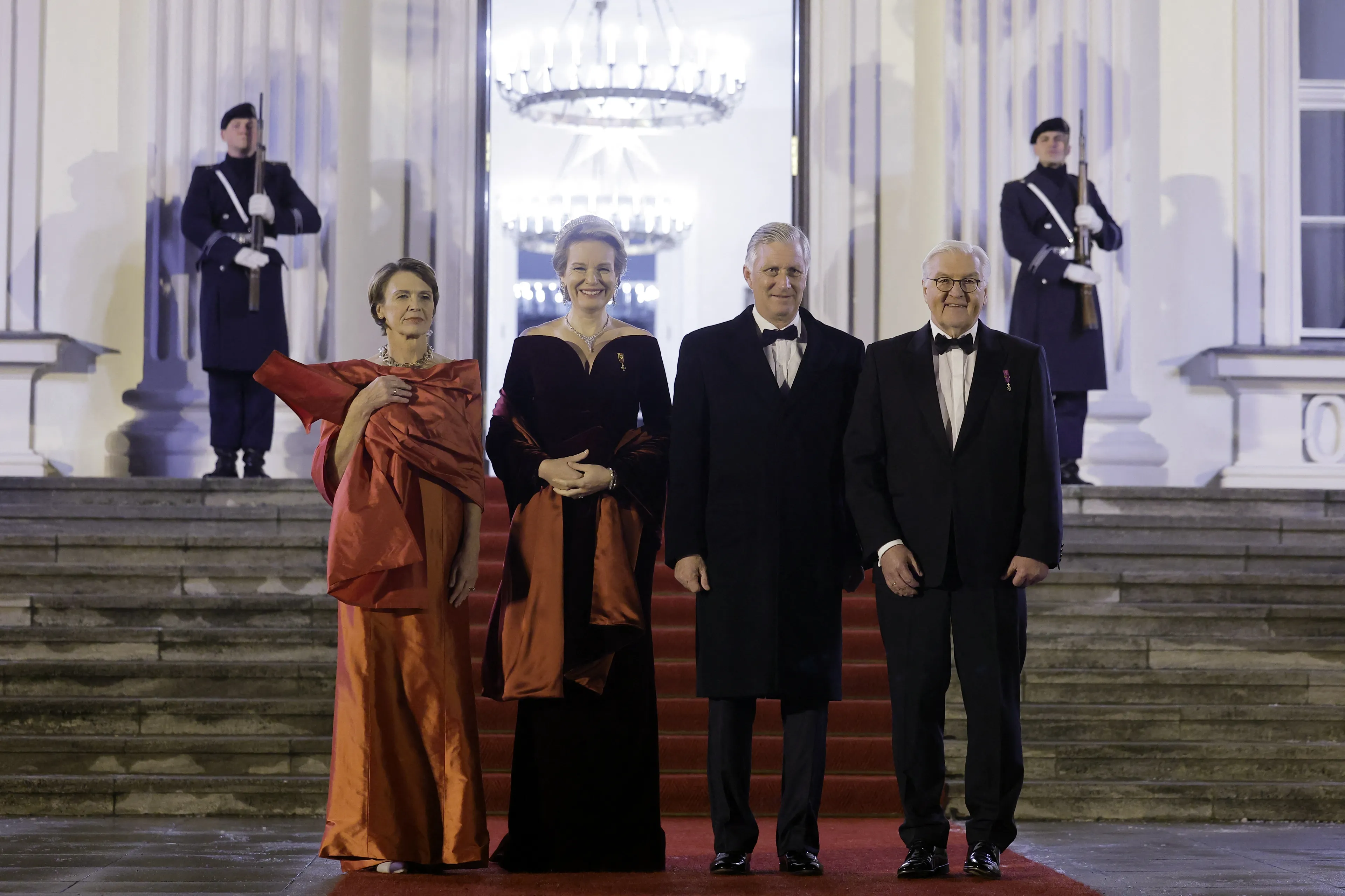 Op woensdagavond was er een contraprestatie waar het Belgische koningspaar als blijk van dank een voorstelling aanboden aan het Duitse staatshoofd. Sophie Junker (sopraan), Samuel Hasselhorn (bariton) en Ammiel Bushakevitz op piano brachten op het podium het werk van Mozart, Duparc, Lekeu, Franck, en Schubert. Voor de gelegenheid droeg koningin Mathilde een rode galajurk met glitters van Natan. Een jurk waarmee ze zich al helemaal waant in de kerstsferen. Net als koningin Máxima overigens, die gisterenavond ook een rode galajurk droeg.
