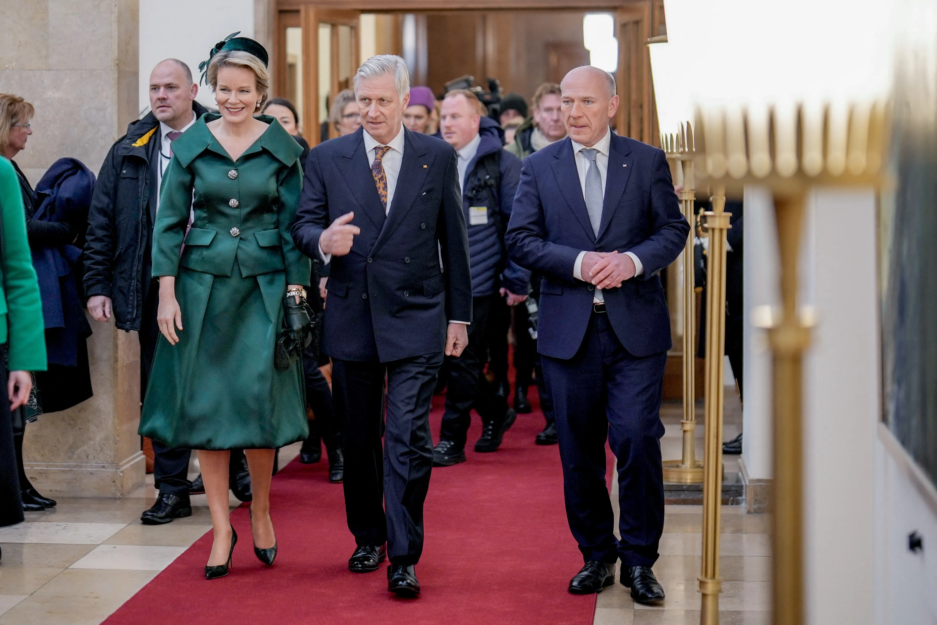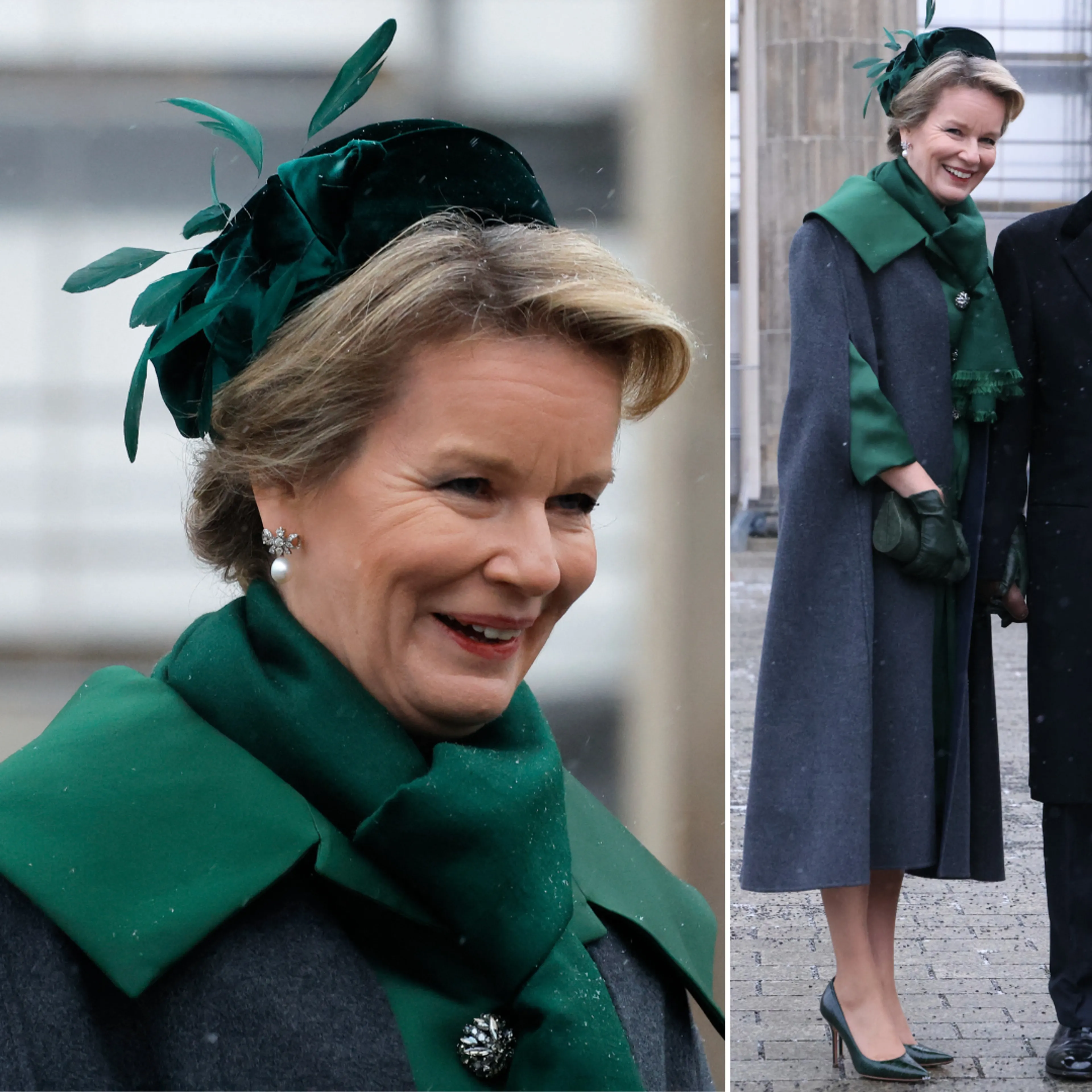 Koningin Mathilde droeg tijdens het eerste dagprogramma een groen mantelpakje van het Belgische modehuis Natan. Ze combineerde de outfit met een bijpassende hoed van Fabienne Delvigne.