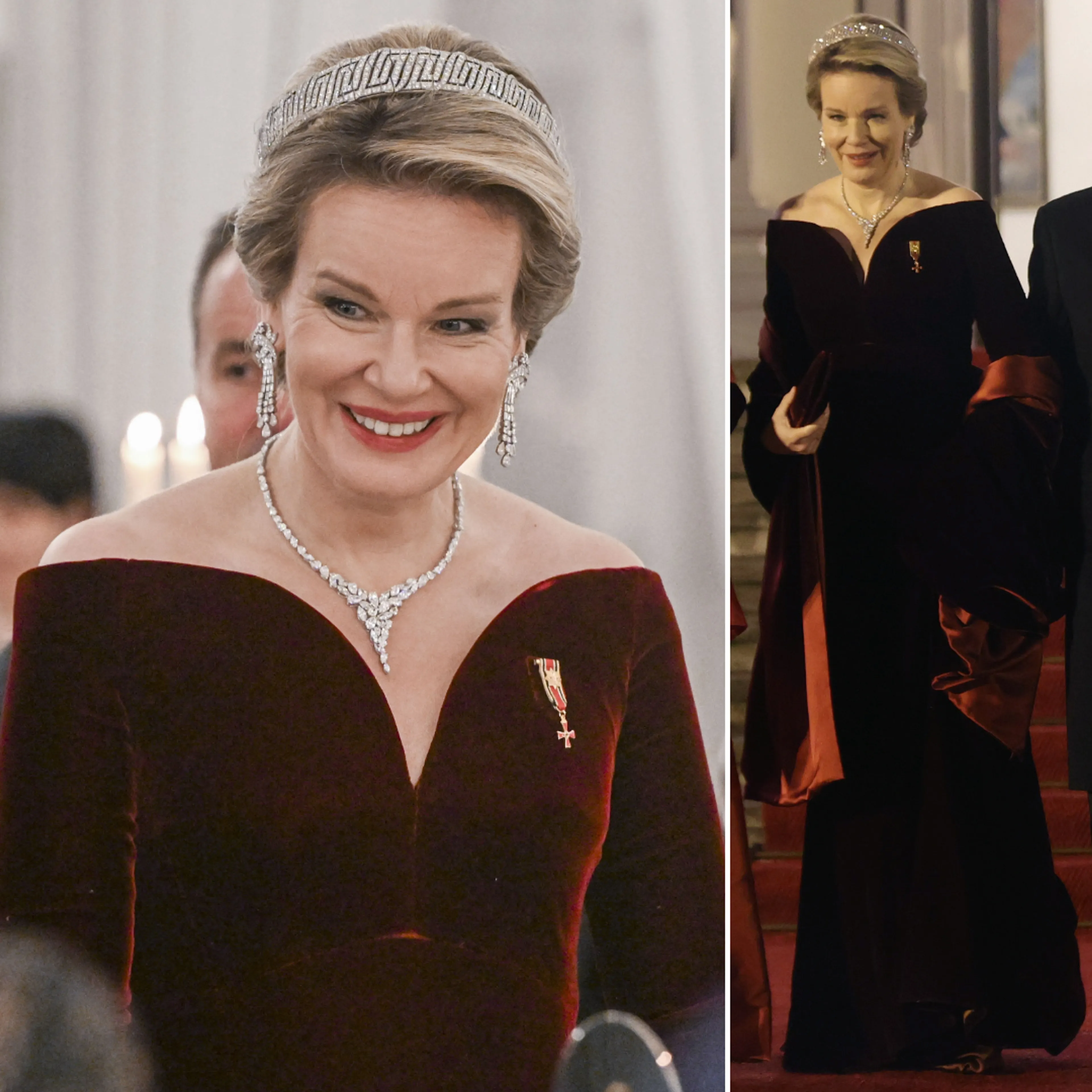 In de avond verscheen Mathilde in een donkere avondjurk van Armani. Ze droeg het ontwerp eerder in 2018, tijdens een staatsbezoek met president Macron van Frankrijk. De jurk lijkt verrassend veel op een zwarte galajurk van Alexander McQueen die Catherine, de prinses van Wales, in 2019 heeft gedragen. Zo zie je maar weer: great minds think alike.