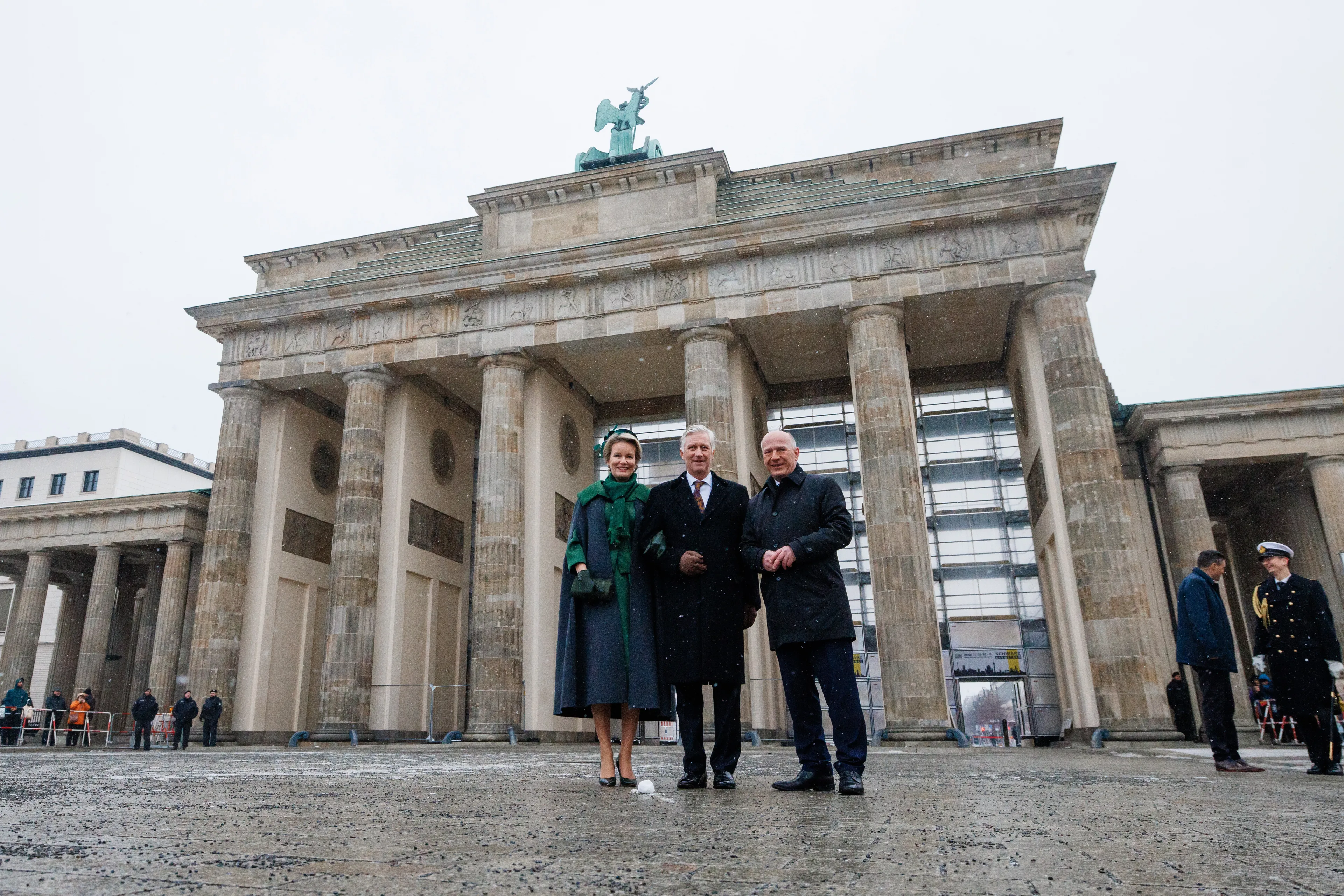 De eerste dag ging verder met een bezoek aan de Brandenburger Tor. Het beroemde bouwwerk staat momenteel in de steigers, daarom moesten Filip en Mathilde aan de achterkant op de foto. Ze werden hierbij vergezeld door Kai Wegner, de burgemeester van Berlijn. Na het fotomoment legde het Belgische koningspaar een krans bij de Neue Wache, een monument voor alle slachtoffers van oorlog en geweld. Ook brachten Filip een bezoek aan het stadhuis van Berlijn.