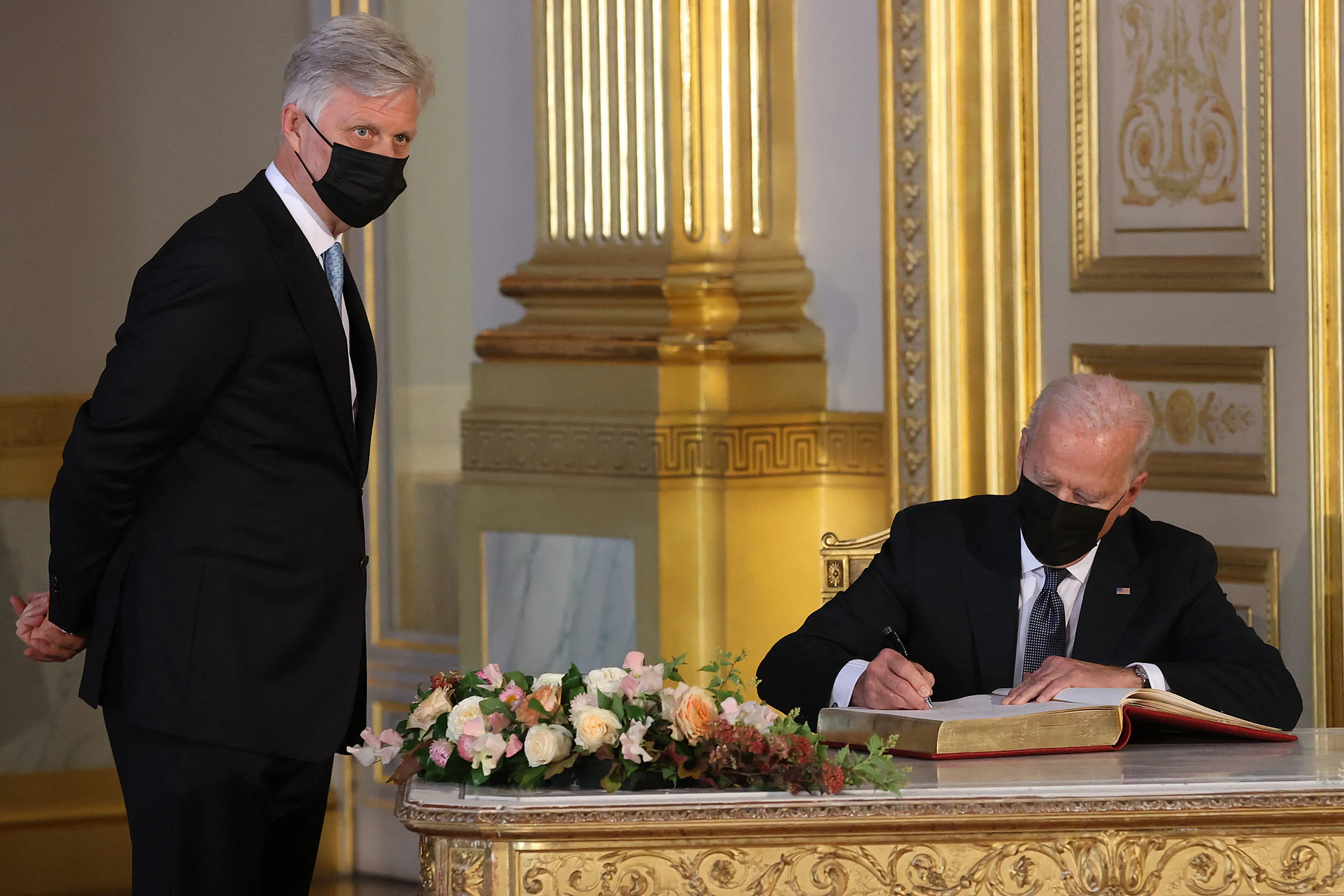 De Belgische koning en Biden droegen beiden een mondkapje maar die ging even af voor het fotomoment, waar ook de Belgische premier Alexander De Croo bij was. Daarna tekende de president het gastenboek, een traditie voor belangrijke bezoekers aan het paleis.